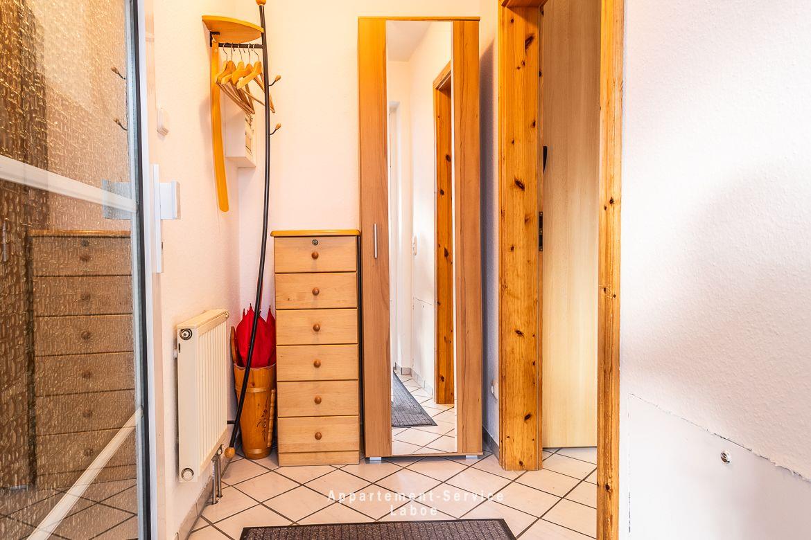 Das Apartment bietet auf 40 Quadratmetern Platz für bis zu vier Personen. Es ist einfach, aber gepflegt eingerichtet – der eigentliche Luxus liegt hier draußen: die Nähe zum Wasser und der Ostseeblick, den du, dank der bodentiefen Fenster, sogar direkt vom Bett im Schlafzimmer genießen kannst.