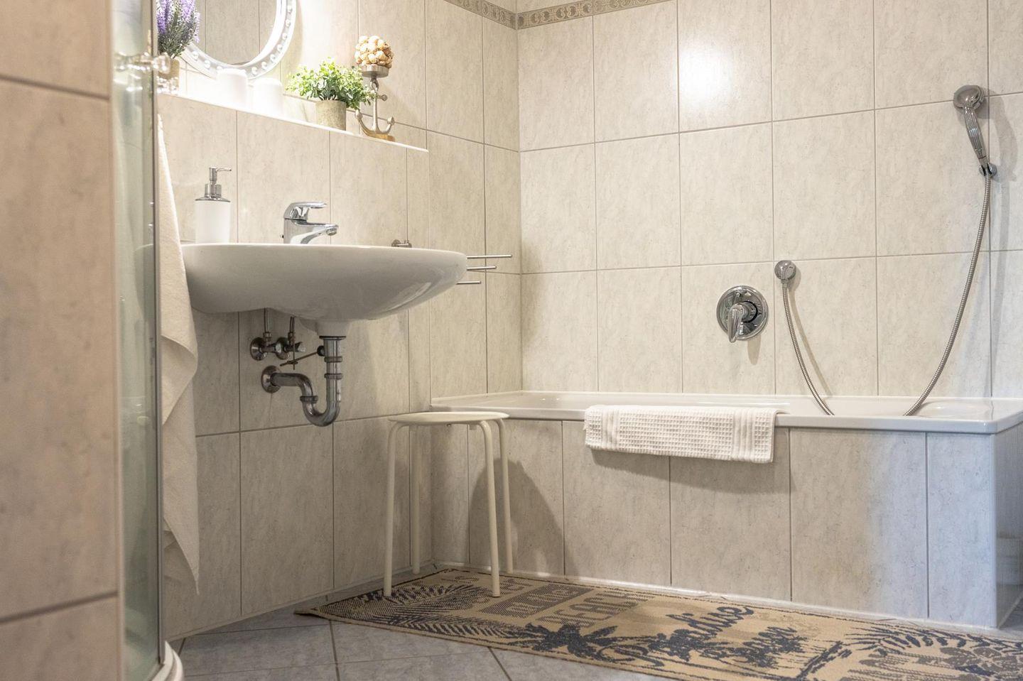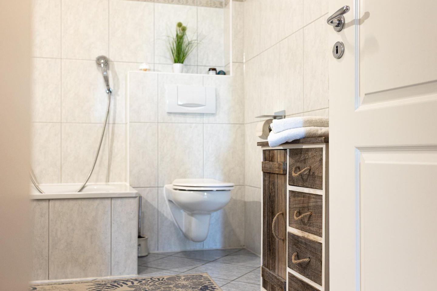 Zwei Schlafzimmer mit hochwertigen Boxspringbetten und jeweils eigenem Fernseher bieten dir und deinen Mitreisenden viel Ruhe und Komfort. Ein geräumiger Flur mit Garderobe führt ins Badezimmer. Es überzeugt mit Dusche, Badewanne und WC – gepflegt und einladend, genau richtig für den Start in den Tag oder ein warmes Bad zum Runterkommen.