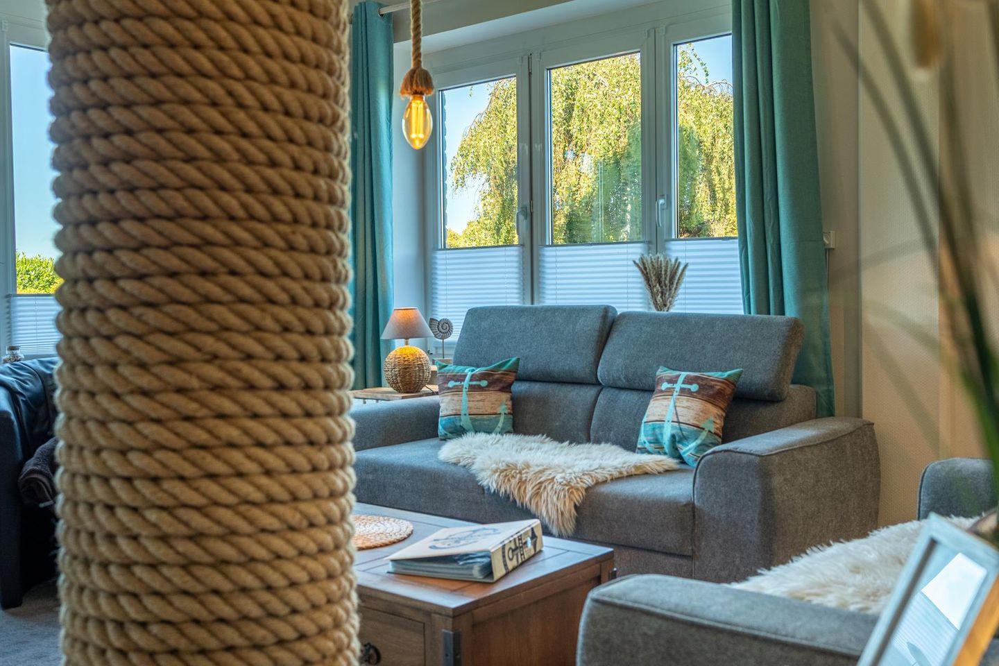 Das lichtdurchflutete Wohnzimmer lädt mit seiner gemütlichen Sitzgruppe, einem TV, einer Stereoanlage und einem DVD-Player zum Ausspannen ein. Hier kannst du es dir nach einem langen Strandspaziergang so richtig gemütlich machen. Die voll ausgestattete Küche bietet mit Geschirrspüler, Cerankochfeld, Backofen, Kühlschrank und einem praktischen Essplatz alles, was du brauchst – egal ob für den schnellen Snack oder das selbstgekochte Abendessen mit Meerblick.