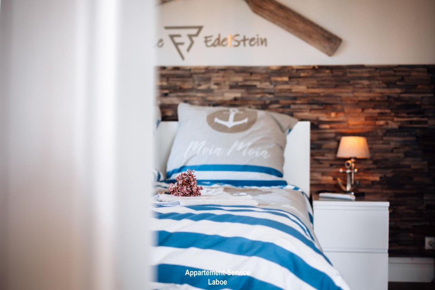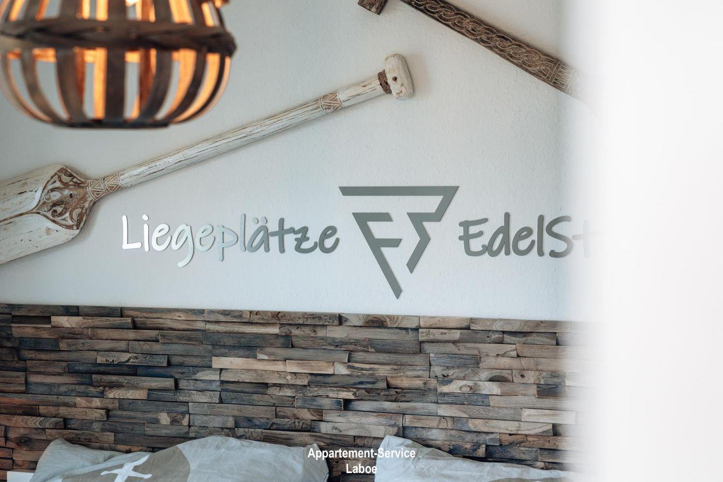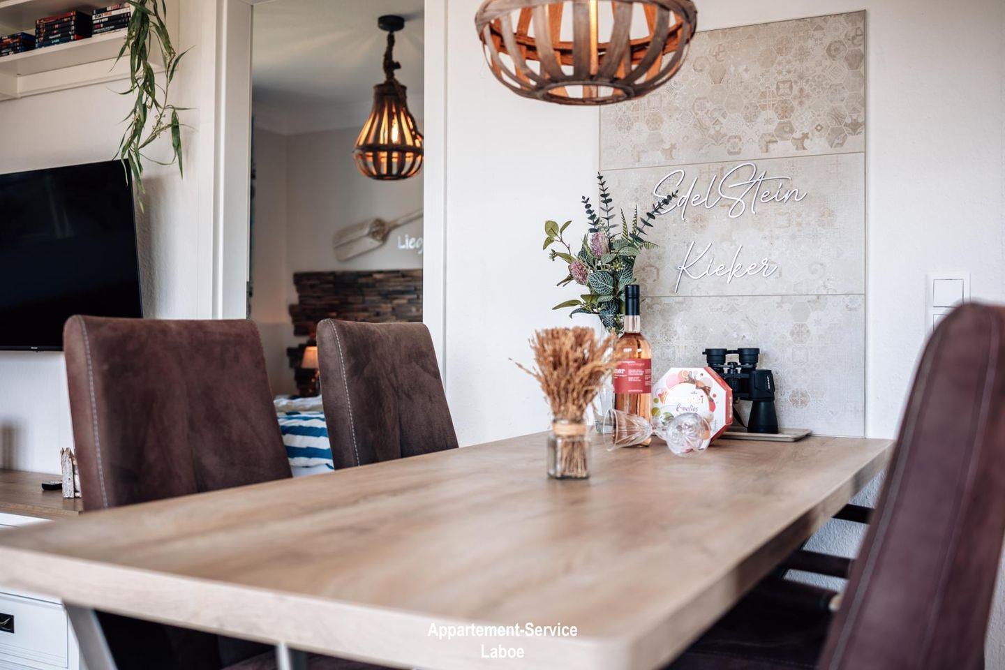 Diese mit Liebe zum Detail maritim, modern und hochwertig eingerichtete Wohnung besticht durch ihre traumhafte Lage und Weitsicht! Sie bietet bis zu 3 Personen Platz auf fast 40 m² und befindet sich im 2. Obergeschoss. Hervorzuheben sind die bodentiefen Fenster mit französischen Balkonen, die dem Appartement viel Licht und Weite verleihen. Das Herzstück der Wohnung EdelStein ist der offene Wohn- und Essbereich mit seinem hochwertigen Bodenbelag in Eiche-Optik, ausgestattet mit massiven Echtholz-Möbeln, einem modernen 4K Smart-TV und einem eleganten Schlafsofa, welches sich durch einfache Handgriffe in einen weiteren Schlafplatz verwandeln lässt.