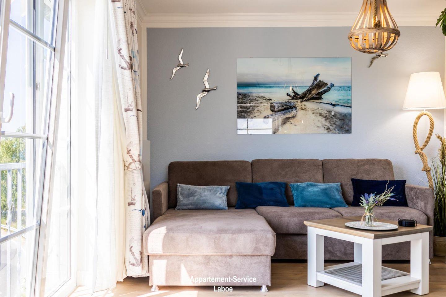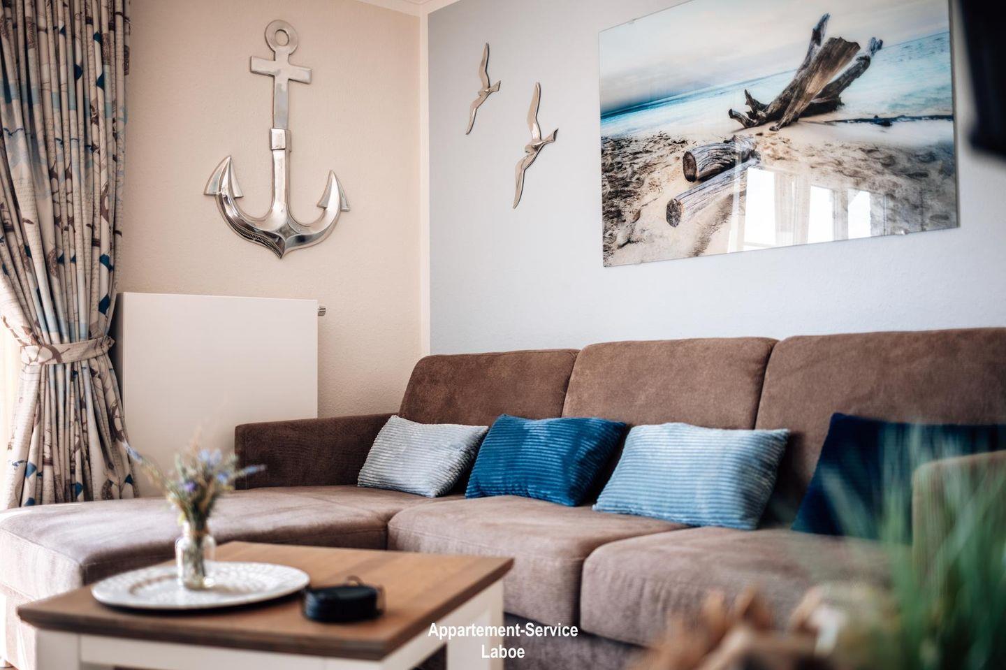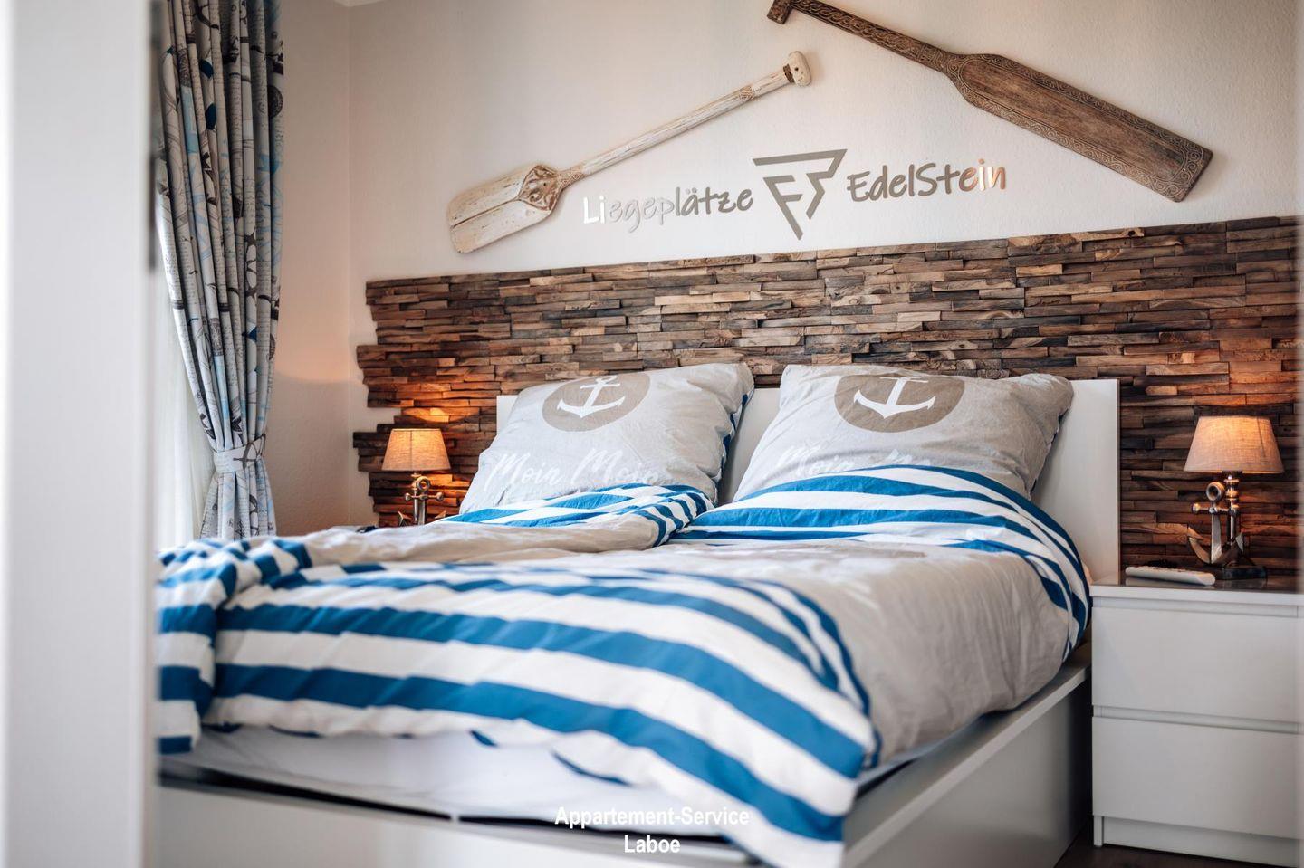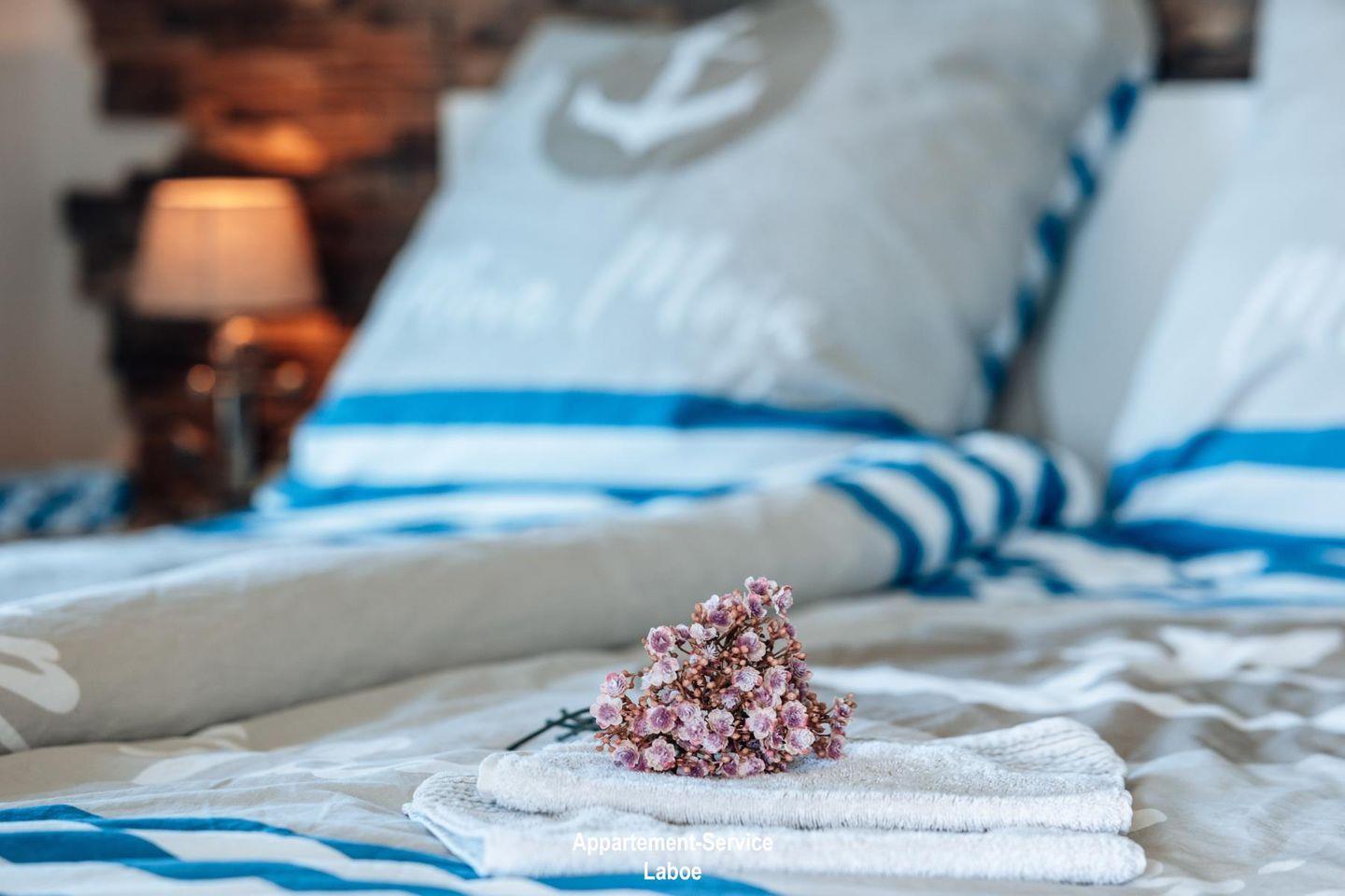 Diese mit Liebe zum Detail maritim, modern und hochwertig eingerichtete Wohnung besticht durch ihre traumhafte Lage und Weitsicht! Sie bietet bis zu 3 Personen Platz auf fast 40 m² und befindet sich im 2. Obergeschoss. Hervorzuheben sind die bodentiefen Fenster mit französischen Balkonen, die dem Appartement viel Licht und Weite verleihen. Das Herzstück der Wohnung EdelStein ist der offene Wohn- und Essbereich mit seinem hochwertigen Bodenbelag in Eiche-Optik, ausgestattet mit massiven Echtholz-Möbeln, einem modernen 4K Smart-TV und einem eleganten Schlafsofa, welches sich durch einfache Handgriffe in einen weiteren Schlafplatz verwandeln lässt.