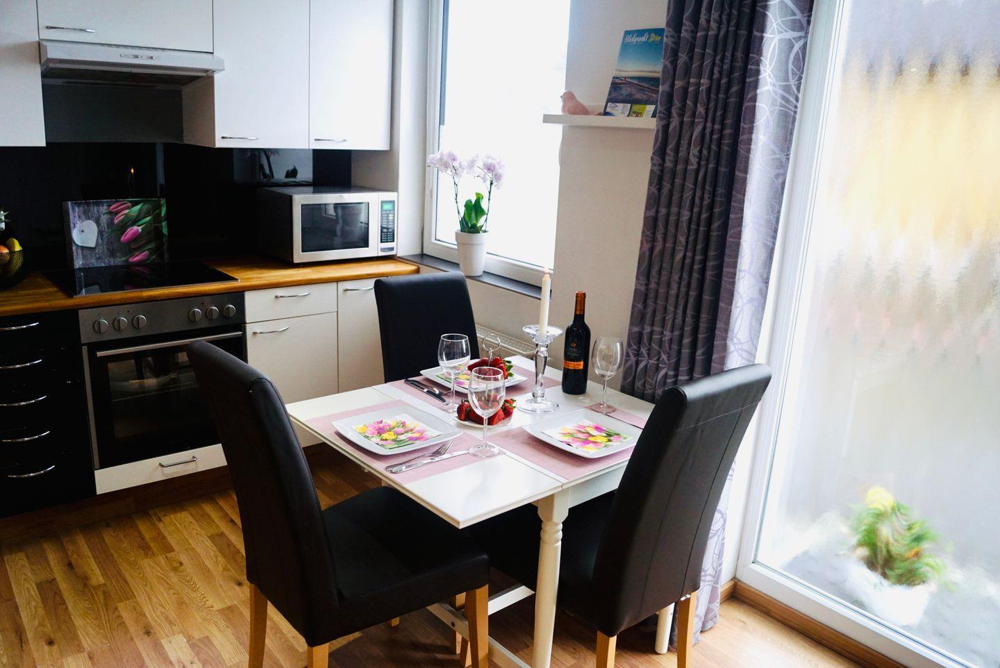 Die voll ausgestattete Küche mit Spülmaschine, Kühlschrank, Gefrierschank, Backofen und Ceran-Kochfeld ermöglicht es Ihnen, Ihre Lieblingsgerichte zuzubereiten. Oder aber Sie erkunden die nahegelegenen Restaurants und probieren regionale Spezialitäten frisch aus dem Meer.