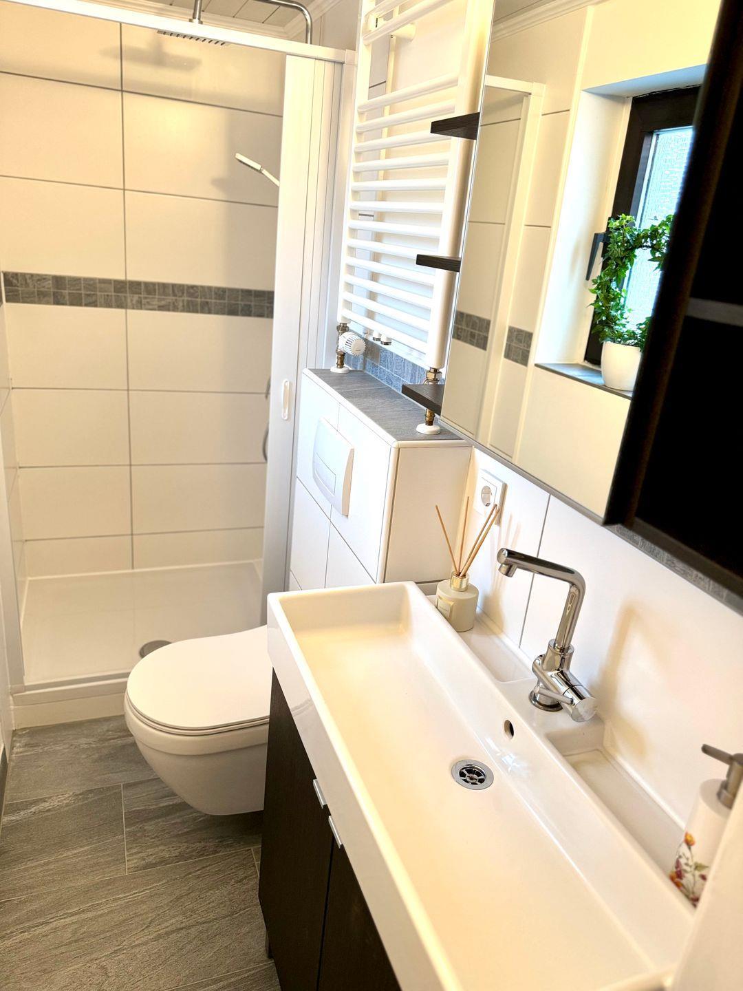 Das Badezimmer grenzt direkt an das Schlafzimmer an und verfügt über eine wohlige Regendusche, Waschbecken, Toilette und einen Handtuchwärmer.