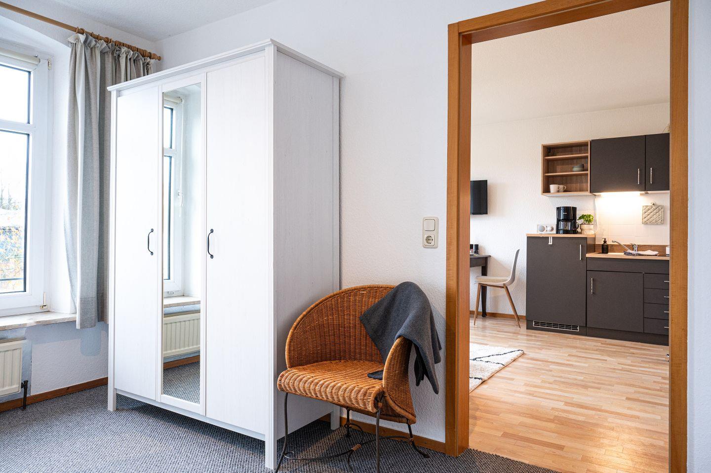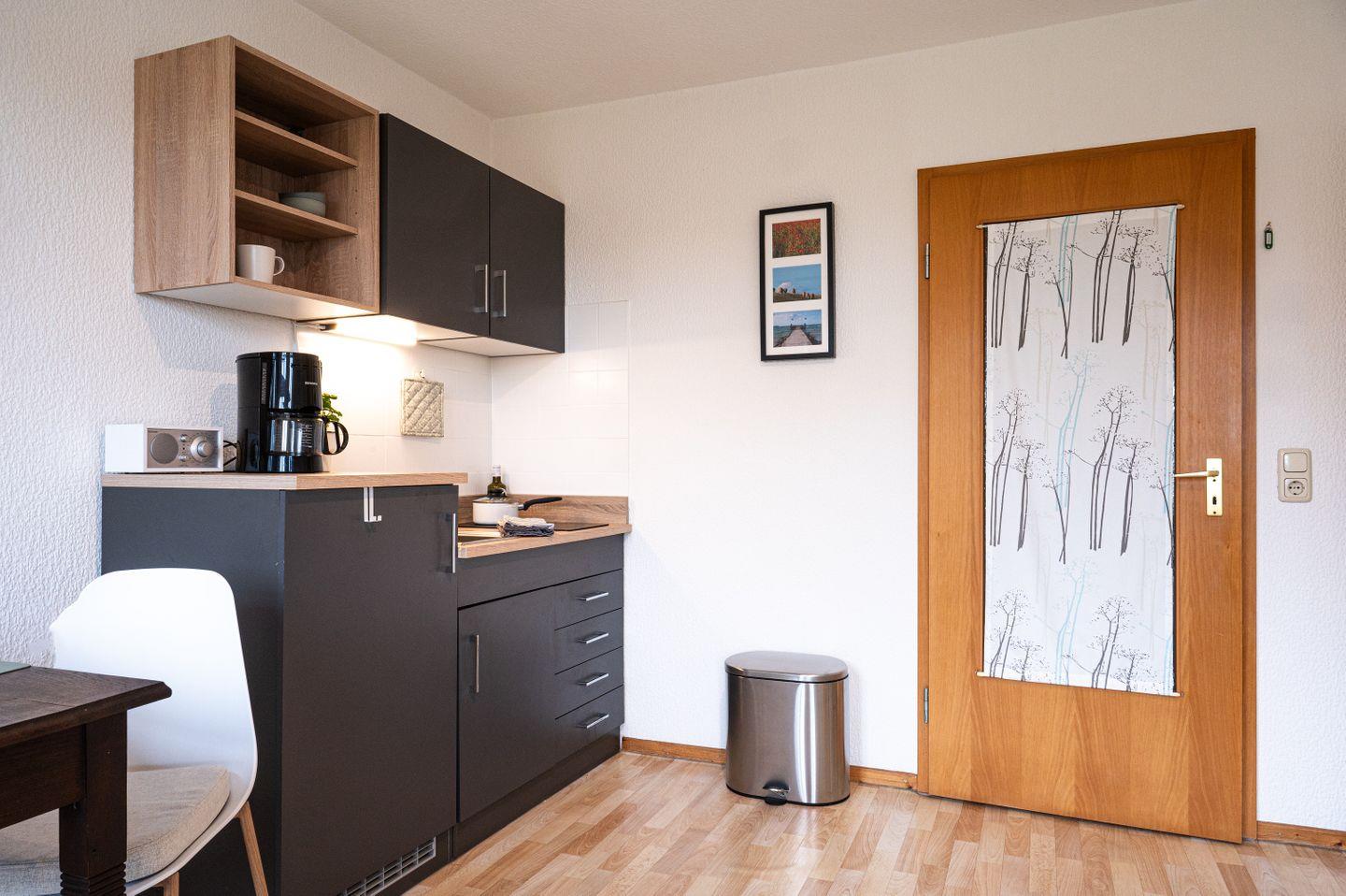 Die Ferienwohnung für 2 Personen ist ca. 30m² groß und mit einem 1,80m breiten Bett ausgestattet, im Wohnen/Kochen- Bereich gibt es eine Pantry mit Esstisch, sowie einen bequemen Sitzbereich. Das Bad ist mit Dusche und Fenster ausgestattet.