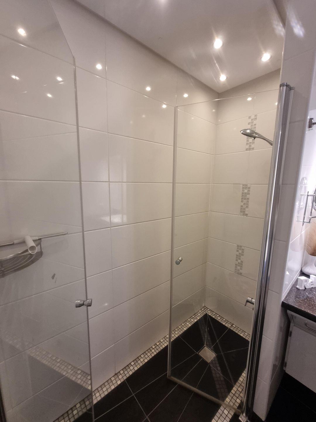 Das Badezimmer ist funktional gestaltet und verfügt über eine bodengleiche Dusche, WC, Waschbecken, Spiegel, Kosmetikspiegel und Haartrockner. Warmes Wasser ist jederzeit verfügbar.
