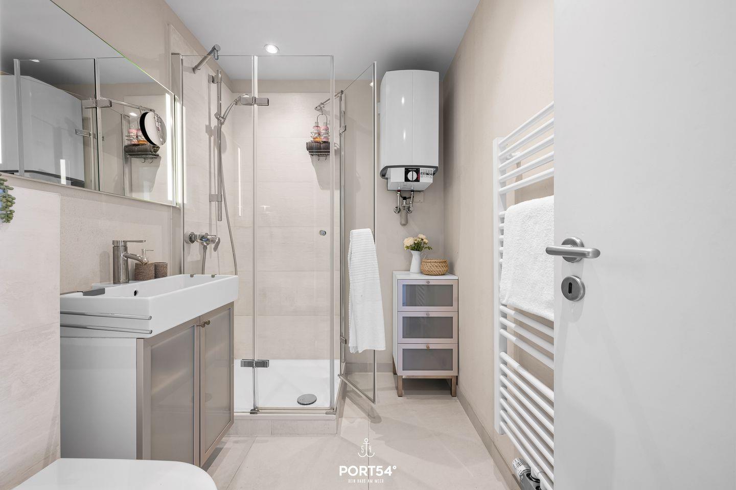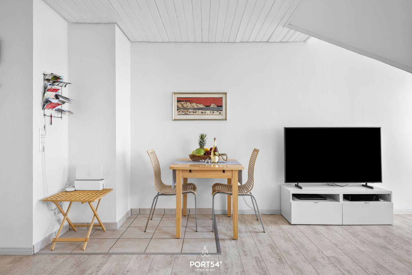 Die Wohnung ist mit schnellem WLAN-Internet ausgestattet und verfügt über ein Schlafzimmer mit Doppelbett, ein modern gestaltetes Duschbad und ein Wohnzimmer mit Küchenzeile incl. Geschirrspüler, Umluftherd und Cerankochfeld. Im Wohnzimmer befinden sich ein Schlafsofa für 2 Personen (1.60 x 2.00m), ein großer moderner Flachbildfernseher mit Satelliten-Empfang und den üblichen Smart-TV-Apps sowie ein Radio. Der zur Ostsee hin ausgerichtete, mit Holzbohlen belegte Balkon kann zur Hälfte genutzt werden und ist mit einem kleinem Holztisch und 2 Gartenstühlen möbliert. Münz- Waschmaschine und Münz-Trockner sind im Haus vorhanden.