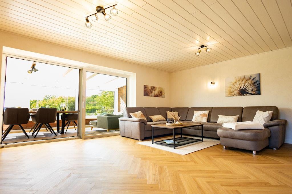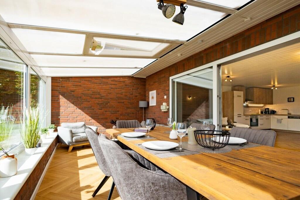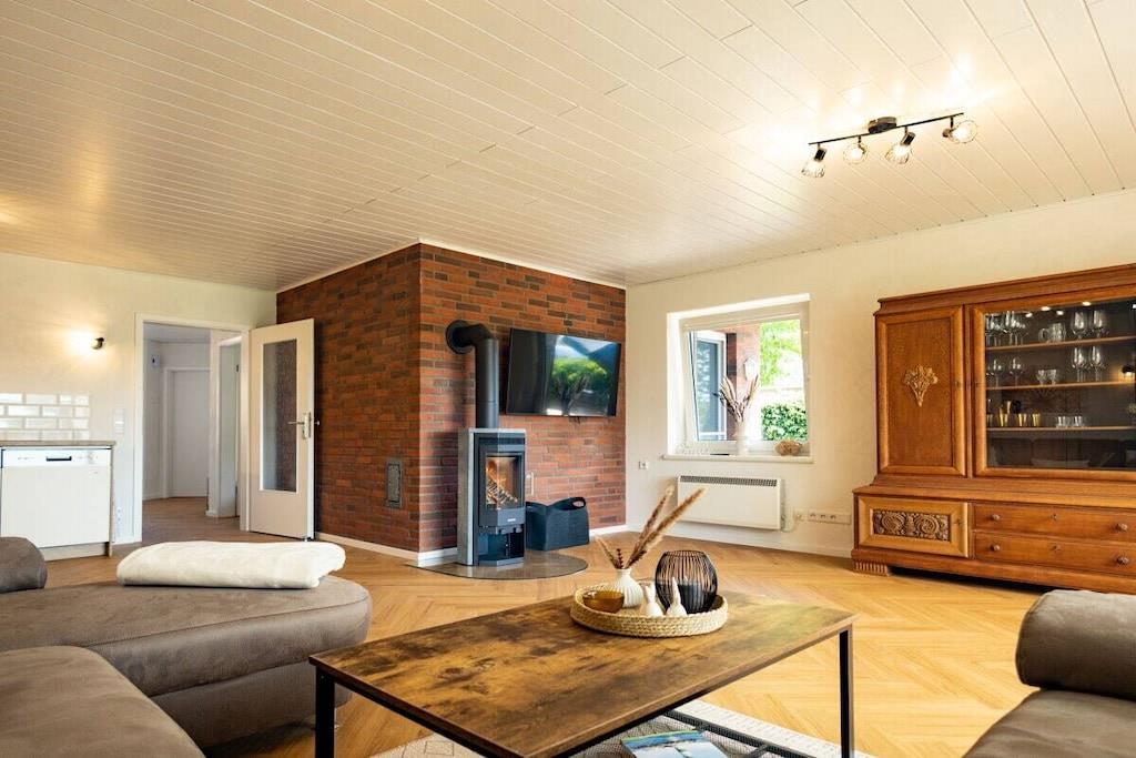 Gemütliches Ferienhaus nahe Ostseestrand mit Kamin, Wintergarten und großem Garten für entspannte Familienzeit.