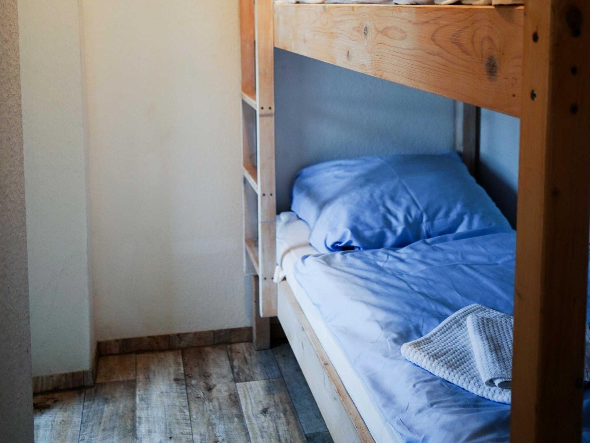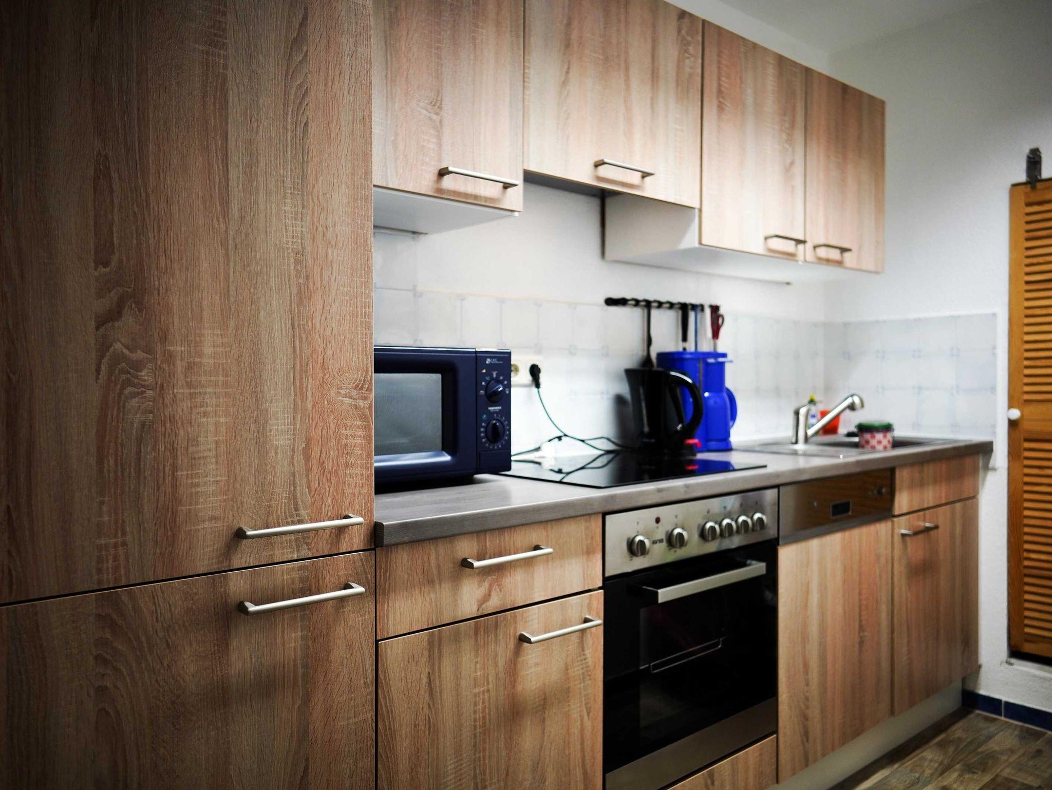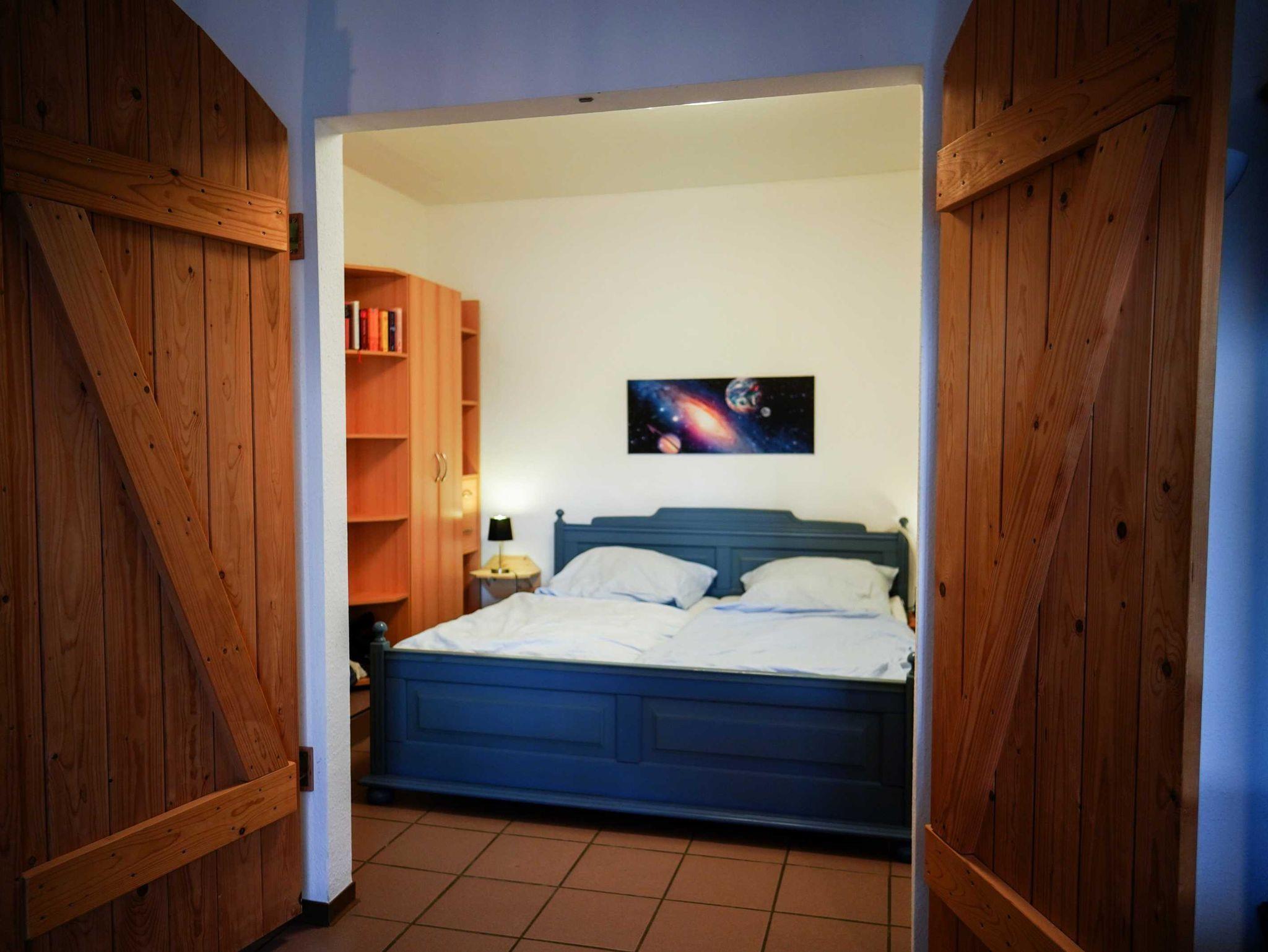 Das hölzerne Tor zum Elternschlafzimmer ist das Markenzeichen dieser 54 qm Ferienwohnung. Die Erdgeschoss-Wohnung bietet Platz für bis zu 4 Personen und verfügt neben einem Wohnraum, einer Küche und einem Bad mit Dusche und WC über 2 Schlafzimmer (1x mit Doppelbett, 1x mit Etagenbett). Von der gemütlichen Ledercouch blickt man direkt auf den Garten und den Teich. Zu dieser schönen Wohnung gehört auch eine eigene Terrasse.