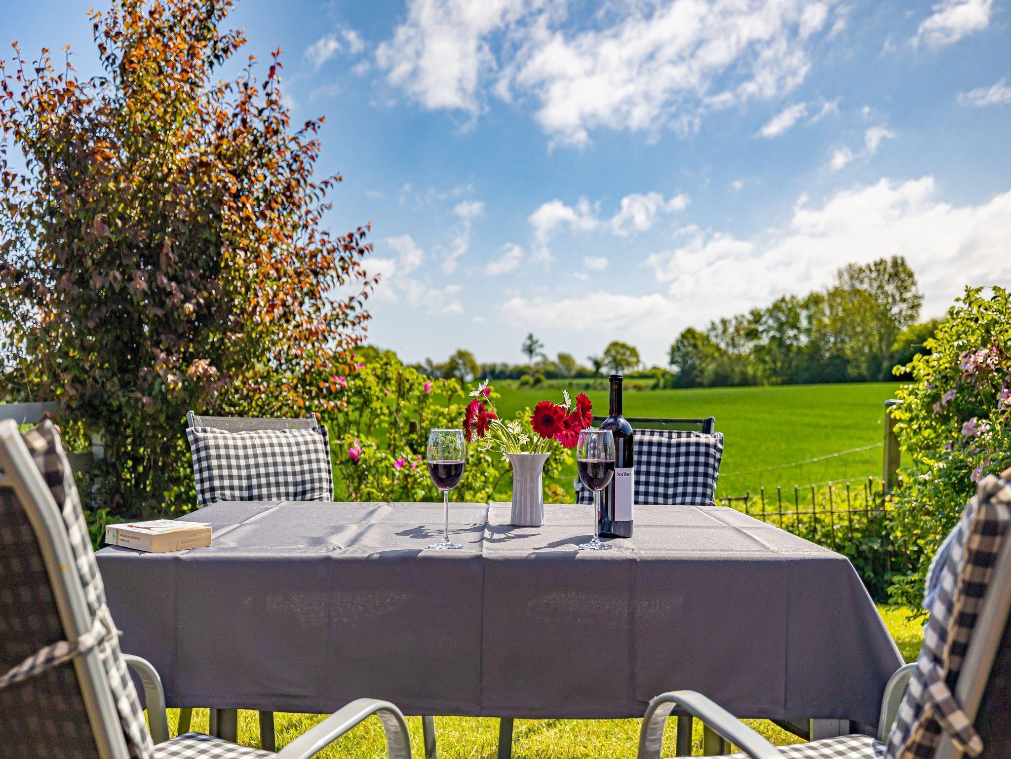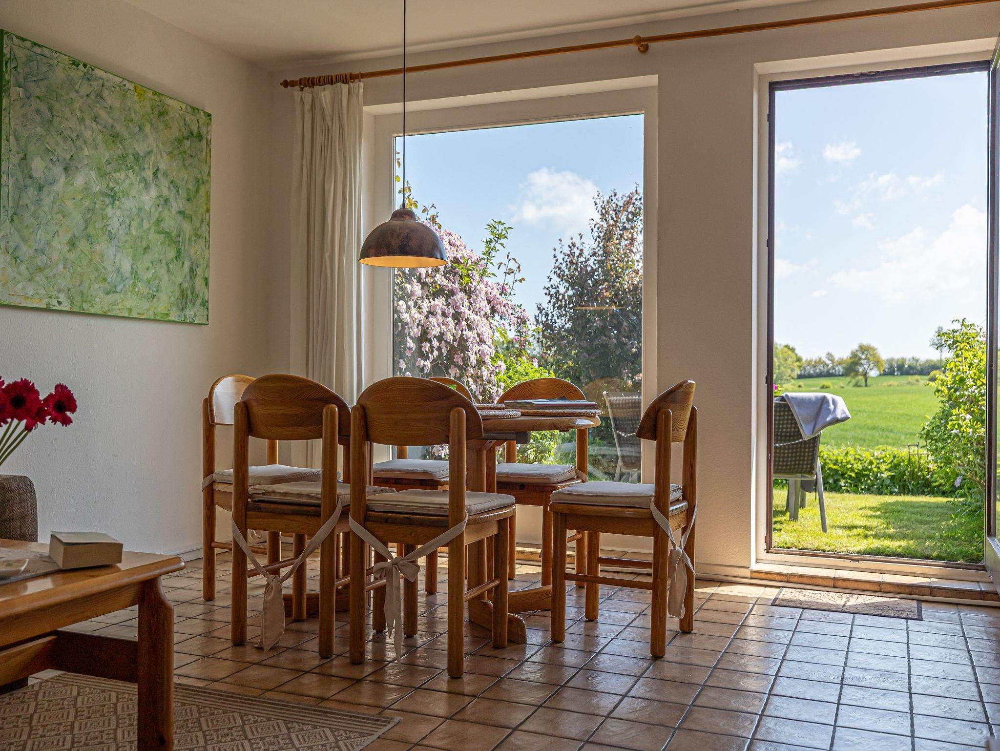 Hinter dem Haus ziehen sich Wiesen und Weiden dahin. Eingegrenzt von den typischen „Knicks“, aus denen morgens und abends Rehe und Fasane zum äsen kommen. Von Ihrer Terrasse aus gut zu beobachten.