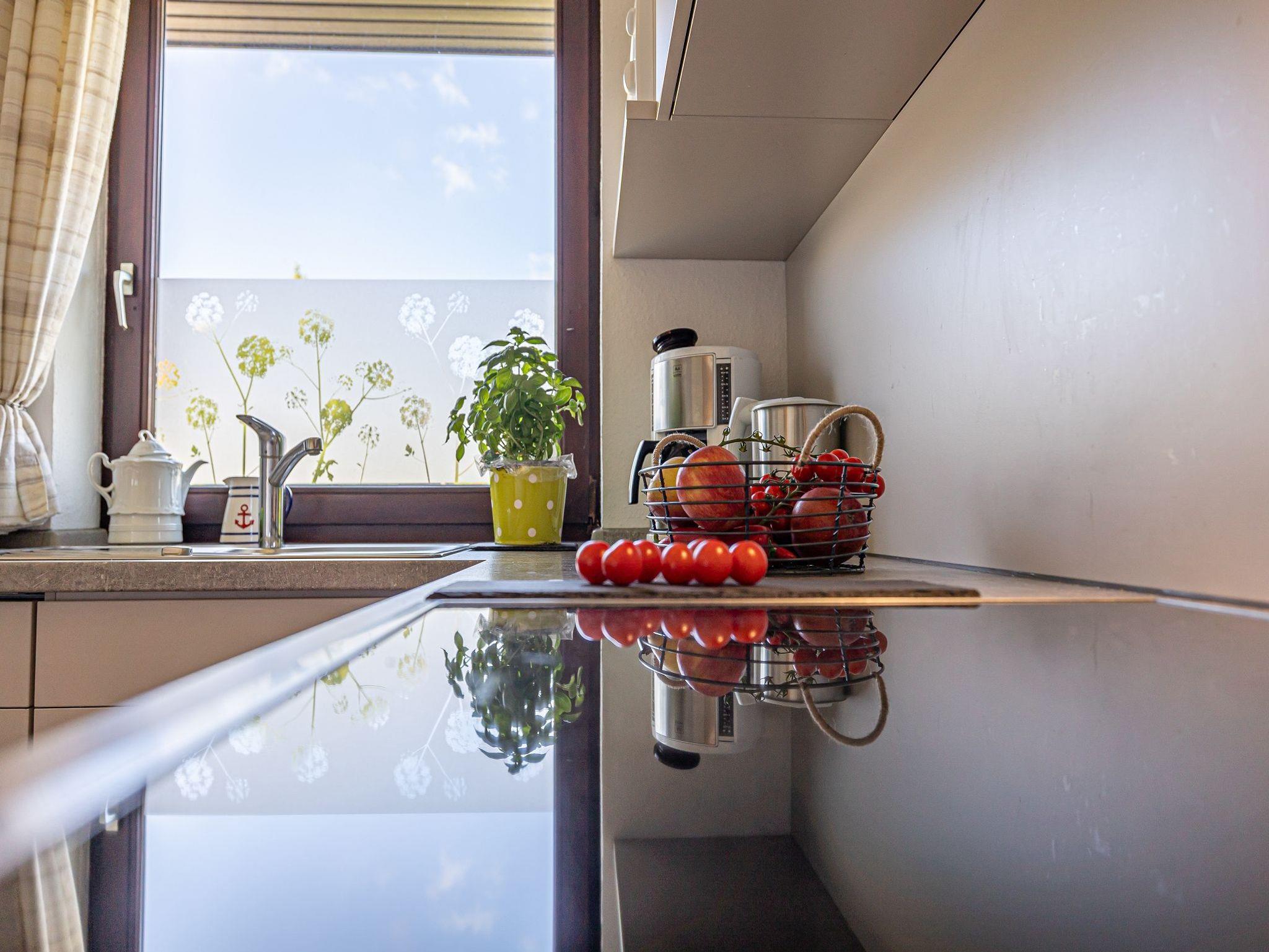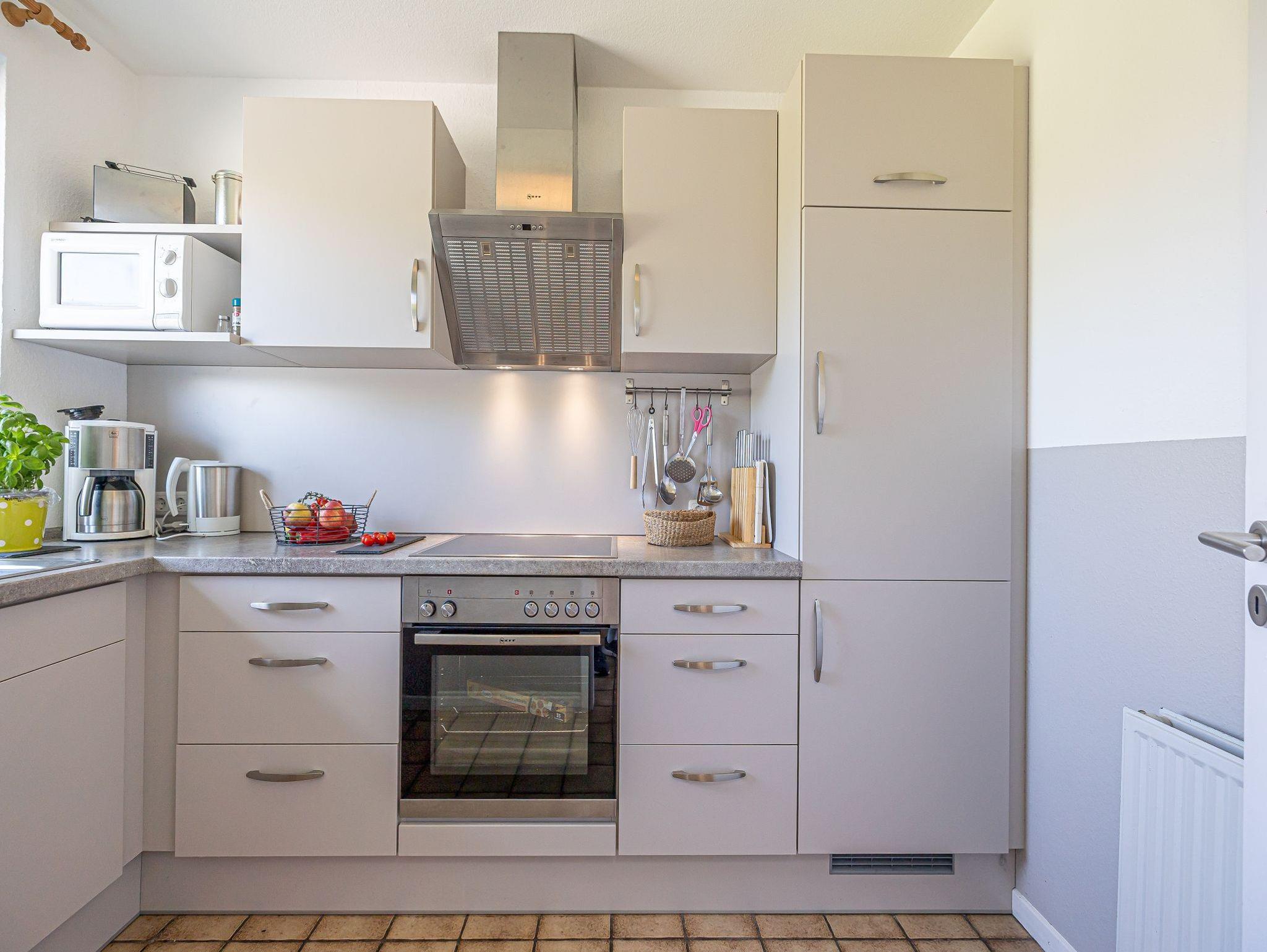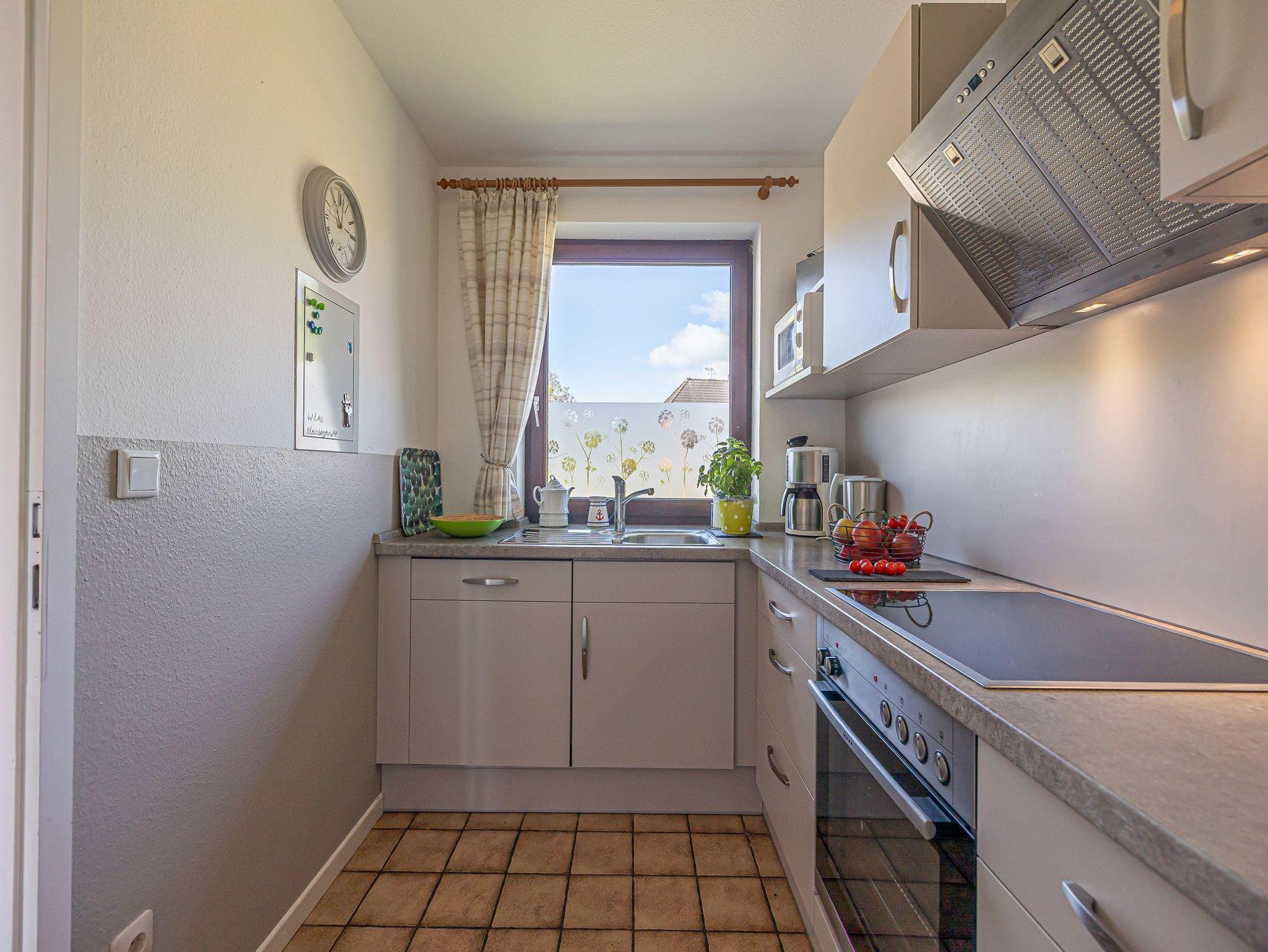 Gleich neben dem Eingang ist eine separate Küche. Sie ist modern eingerichtet und besitzt einen Herd mit Backofen, Mikrowelle, Geschirrspüler, natürlich auch Toaster, Wasserkocher und Kaffeemaschine. In den Schränken finden Sie genügend Geschirr und Töpfe. Ich denke, hier lässt sich gut kochen.