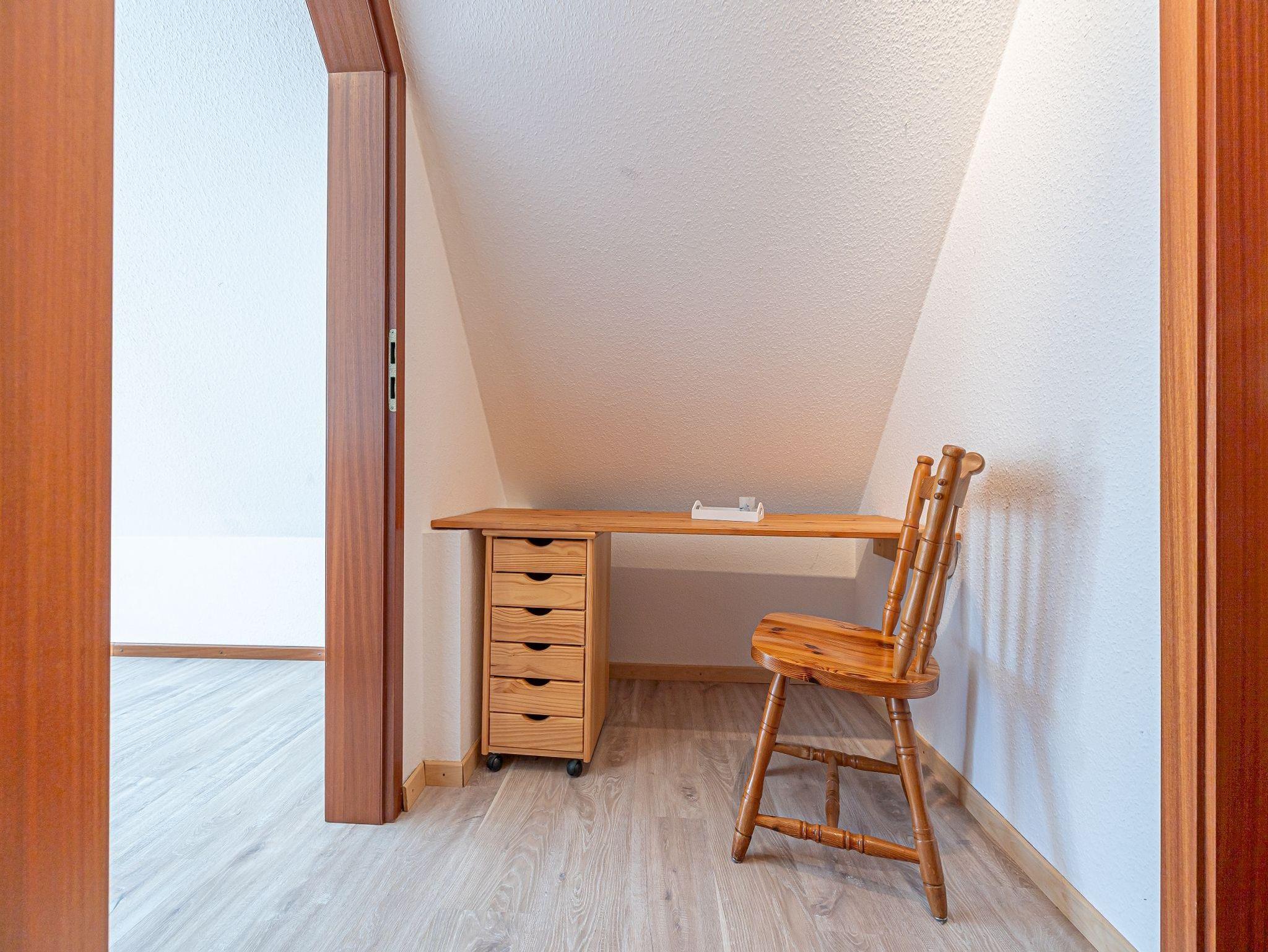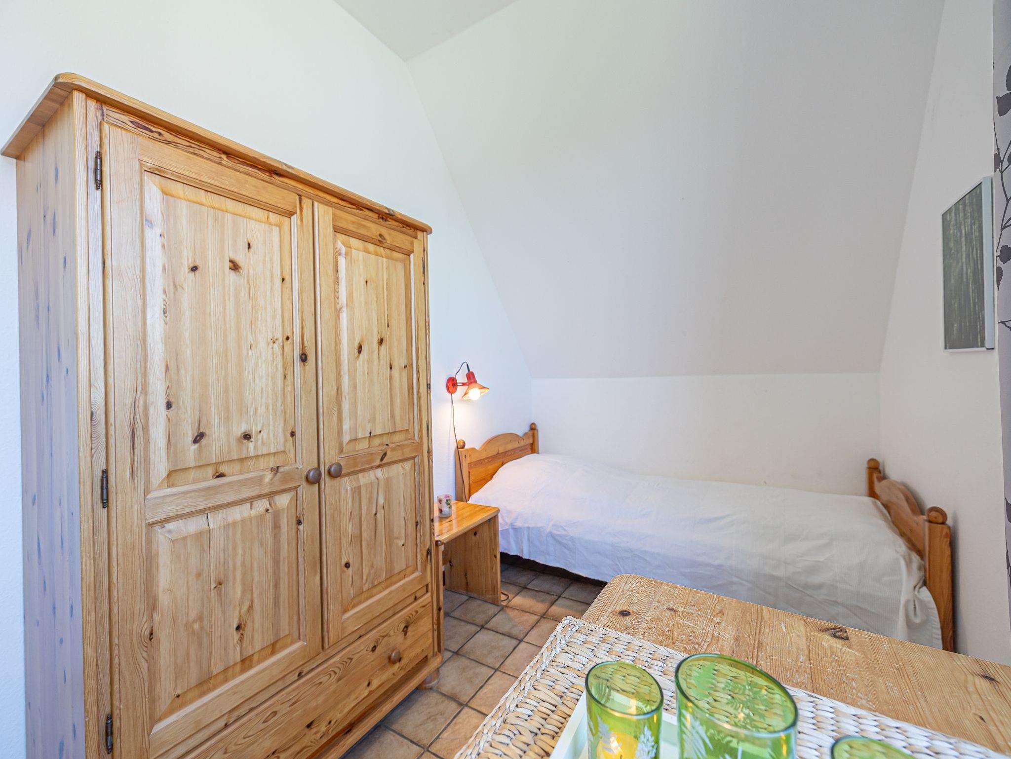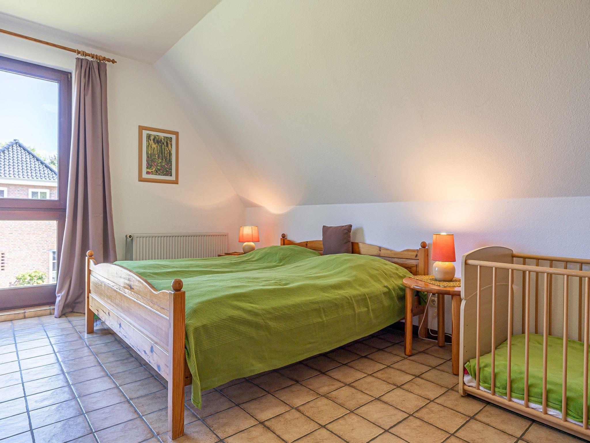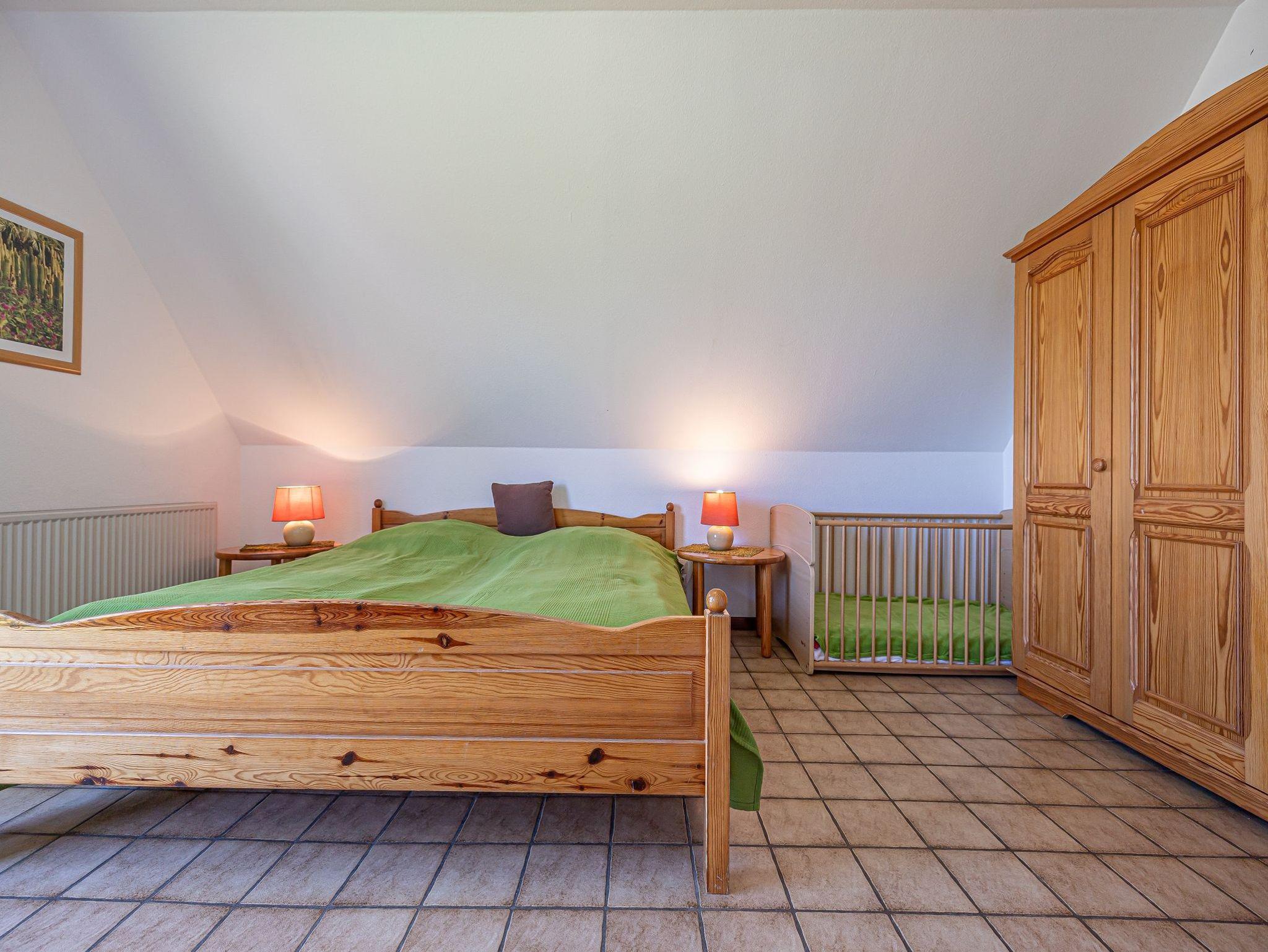 Über eine Holztreppe steigen Sie nun in die 1. Etage. Dort ist ein Schlafzimmer mit bequemen Doppelbett, einem Kinderbett und Schrank darin. Durch die Fenster kann man schon das Meer hören, wenn es rauscht.