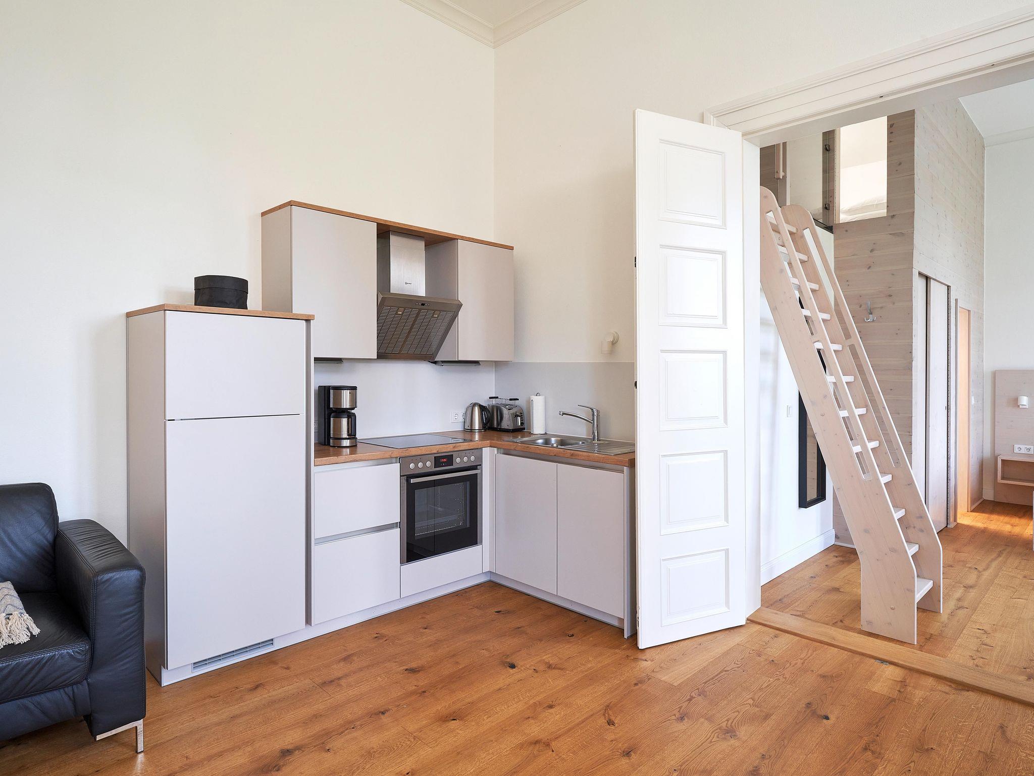 Die Ferienwohnung Herrenhaus I im Obergeschoss mit Blick auf den Hofplatz bietet moderne Ausstattung kombiniert mit historischem Ambiente sowie eine eigene Sauna. Auf dem Schlafboden Hems fühlen sich nicht nur kleine Gäste außerordentlich wohl.