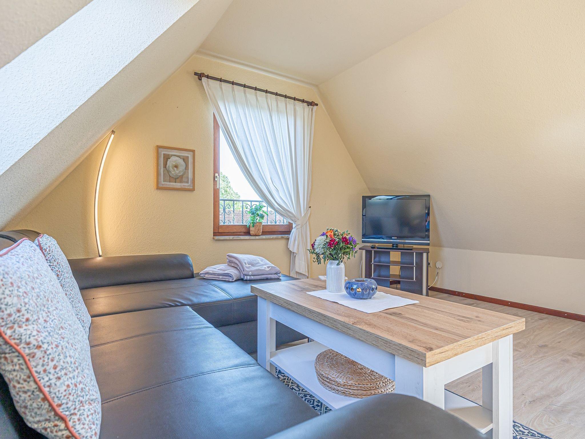 Die kleine helle Wohnung Seestern ist ganz oben im Haus und über eine breite Treppe erreichbar. Gleich beim Betreten sehen Sie rechts einen Essplatz und dahinter steht ein Schreibtisch in einer ruhigen Ecke. Links ist die offene Küche mit Herd und Backofen, Mikrowelle und den anderen üblichen Küchengeräten. Nacheinander stehen zwei Einzelbetten, gegenüber ist die Dusche und WC in einem separaten Raum. Am Ende der Wohnung wird der Raum größer und wenn Sie aus dem Fenster schauen, dann sehen Sie das Meer. Hier befindet sich eine große Couch, die sich auch ausziehen lässt und als zusätzliche Schlafmöglichkeit benutzt werden kann sowie das TV-Gerät. Mit den 5 kleinen Fenstern ist die Wohnung sehr hell und freundlich. Sie ist, außer im Bad, mit Teppich ausgelegt.