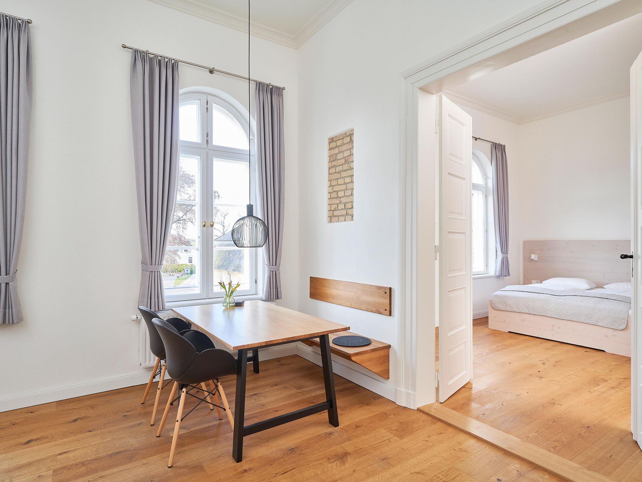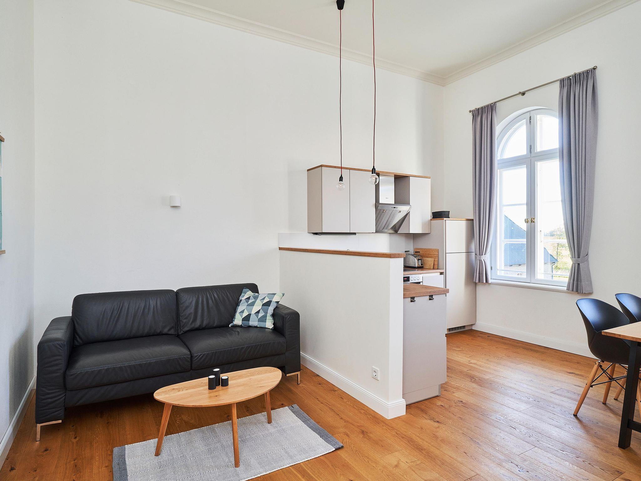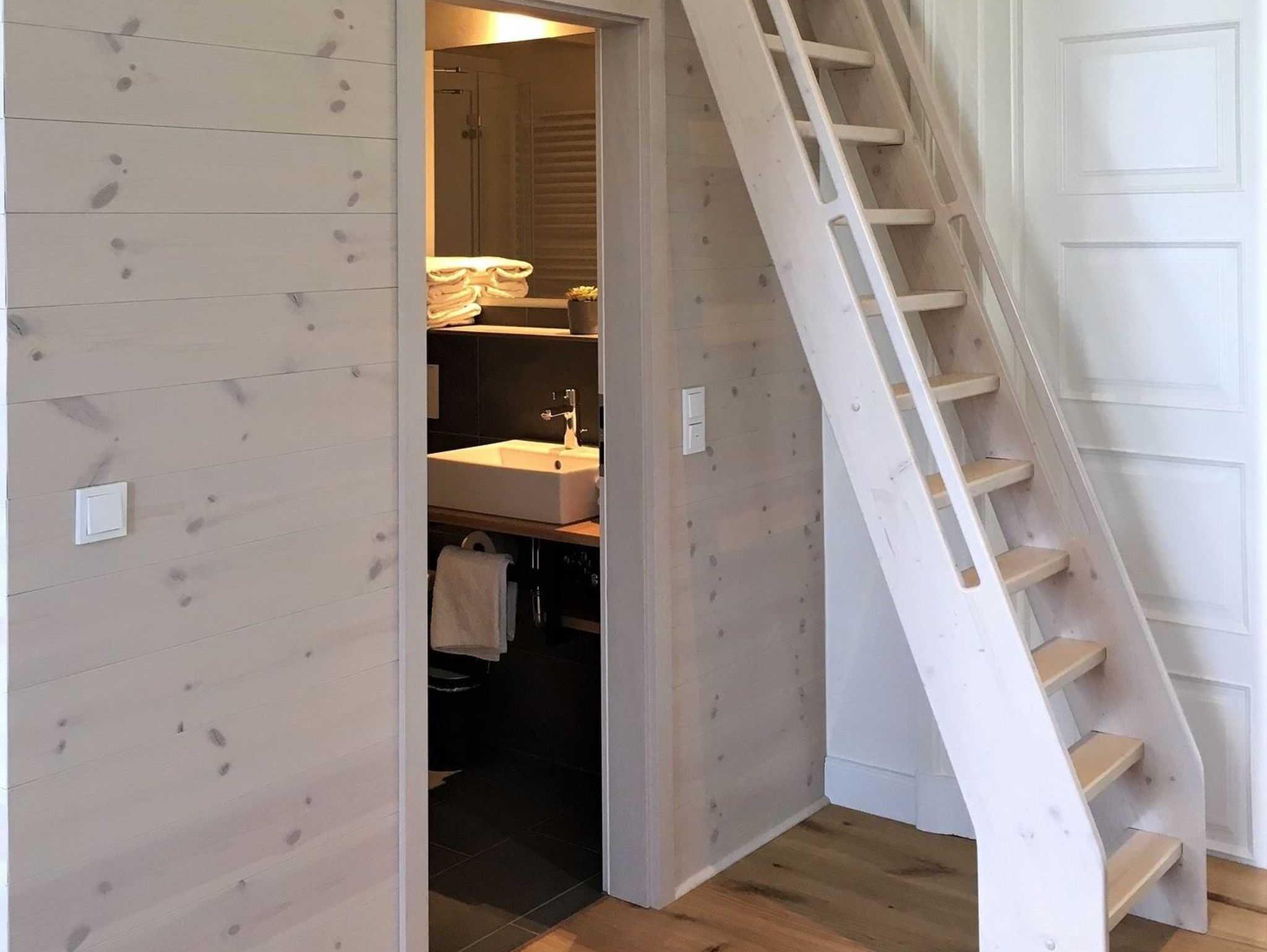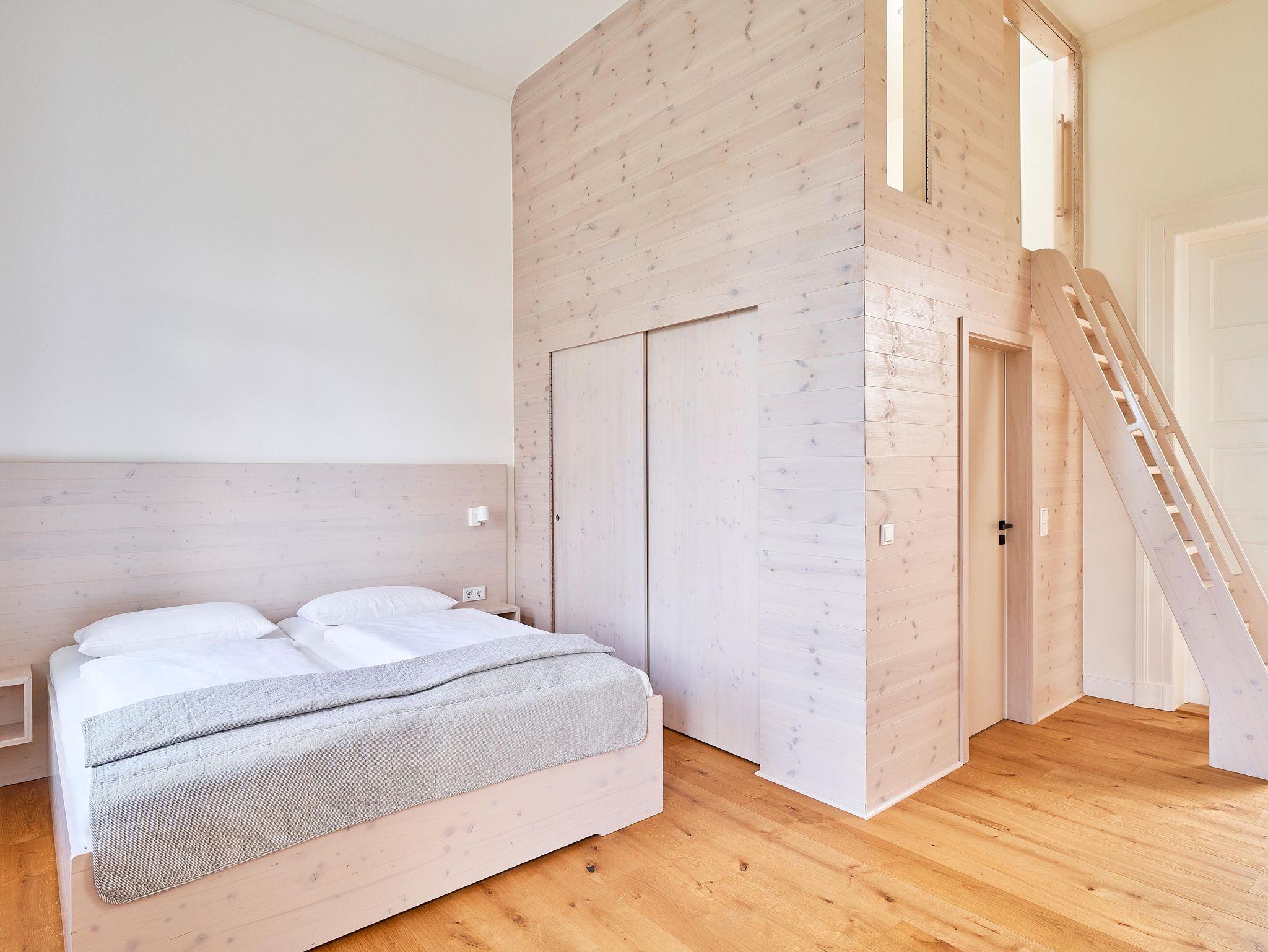 Die Ferienwohnung Herrenhaus II im Obergeschoss mit Blick auf den Hofplatz bietet moderne Ausstattung kombiniert mit historischem Ambiente. Auf dem Schlafboden Hems fühlen sich nicht nur kleine Gäste außerordentlich wohl.