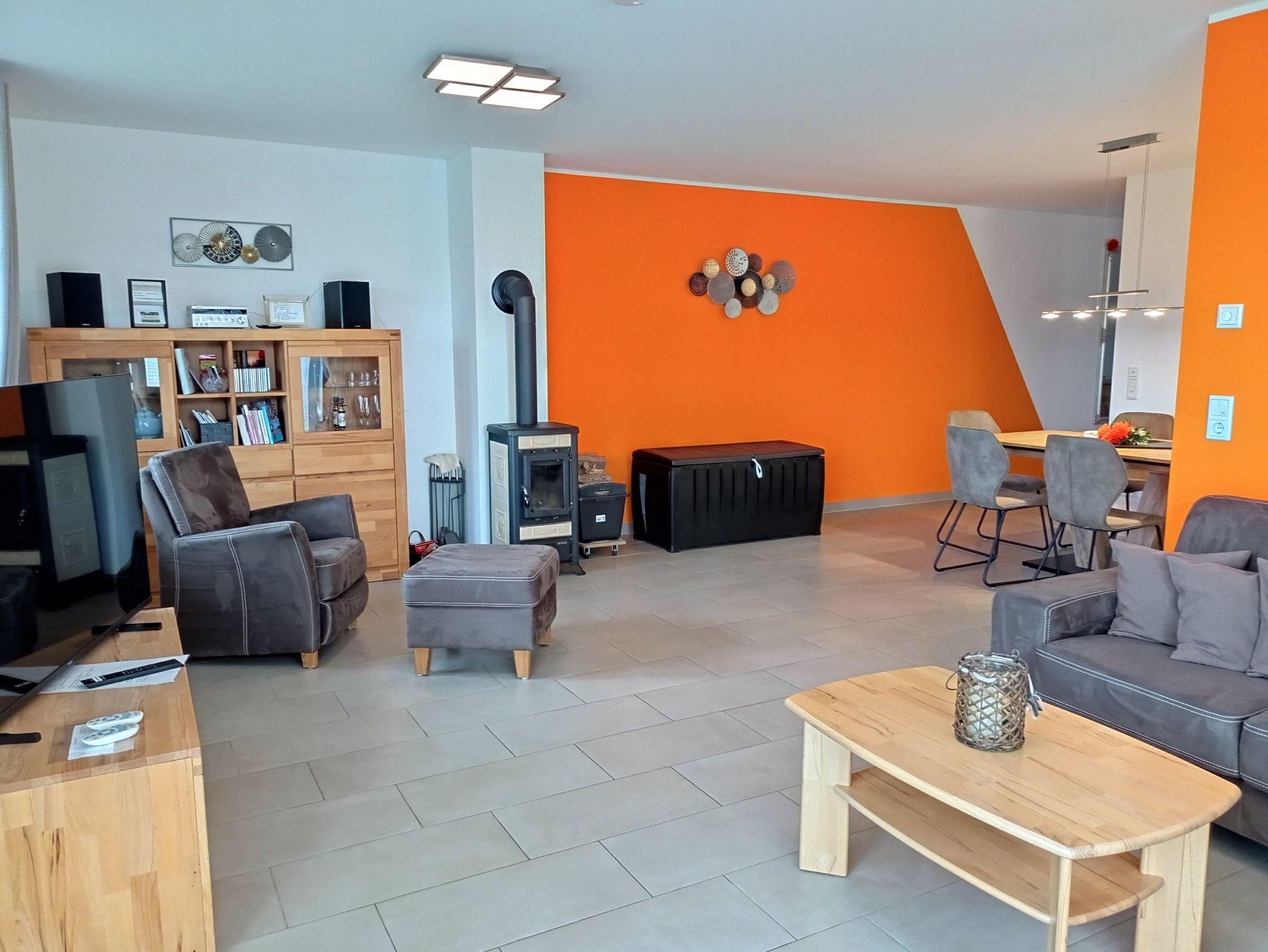 - Offener Wohnbereich mit Kaminofen Essbereich und offener Küche sowie angrenzender Terrasse in südwestlicher Lage
