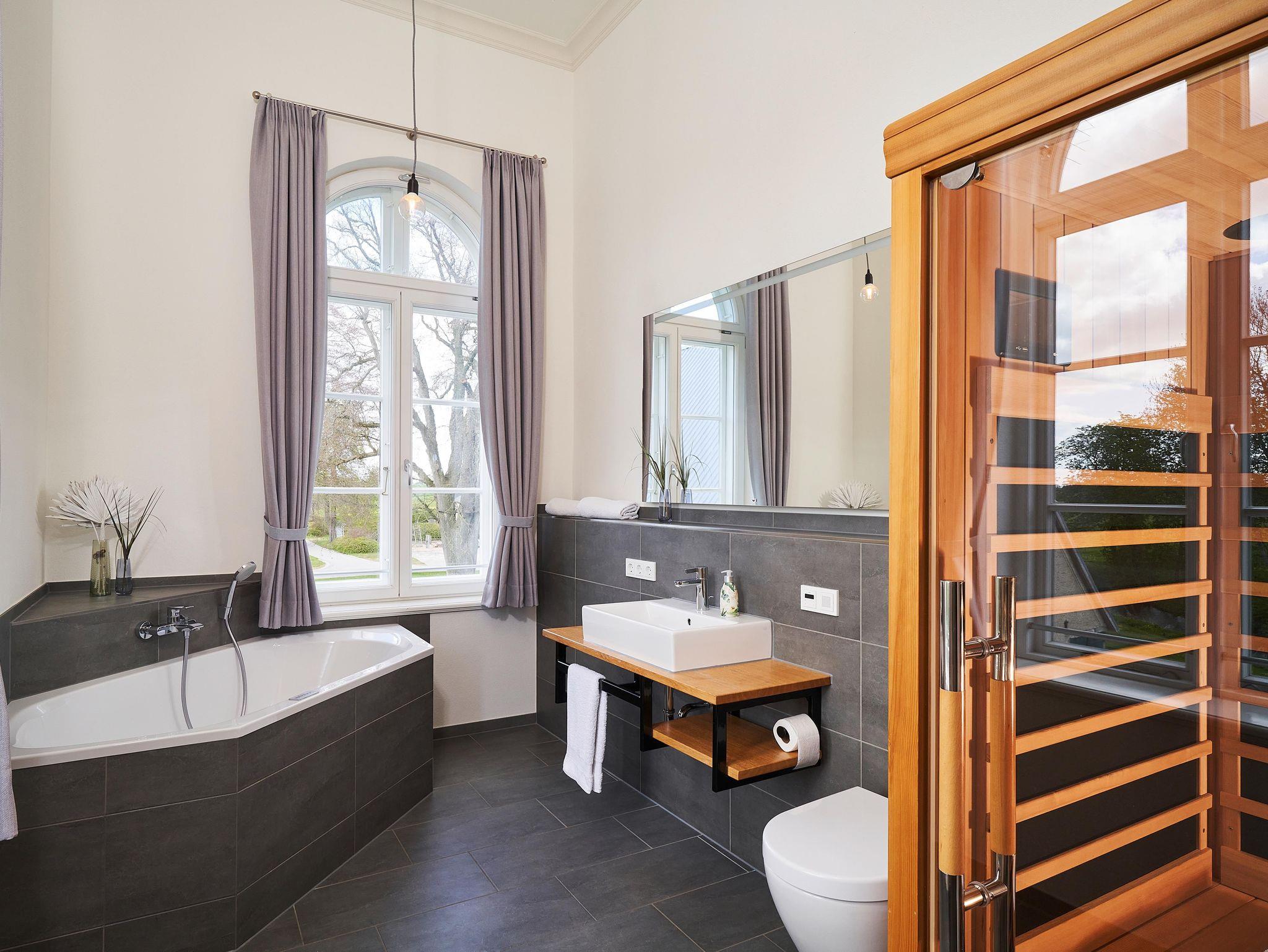 Die Ferienwohnung Herrenhaus V im Obergeschoss mit Blick auf den Garten und den See bietet mit Infrarotkabine, Whirlbadewanne und Kaminofen moderne Ausstattung kombiniert mit historischem Ambiente. Auf dem Schlafboden Hems fühlen sich nicht nur kleine Gäste außerordentlich wohl.