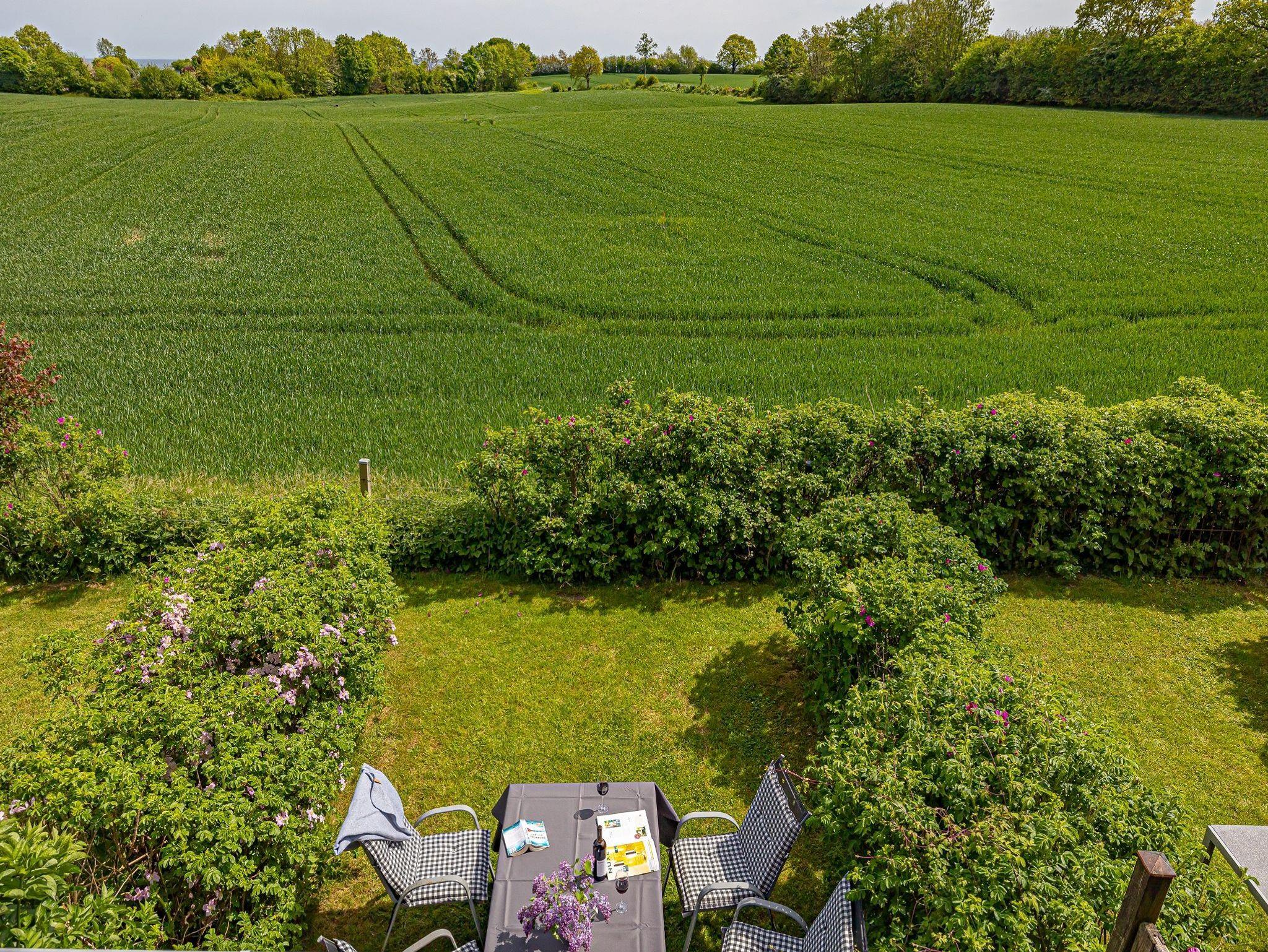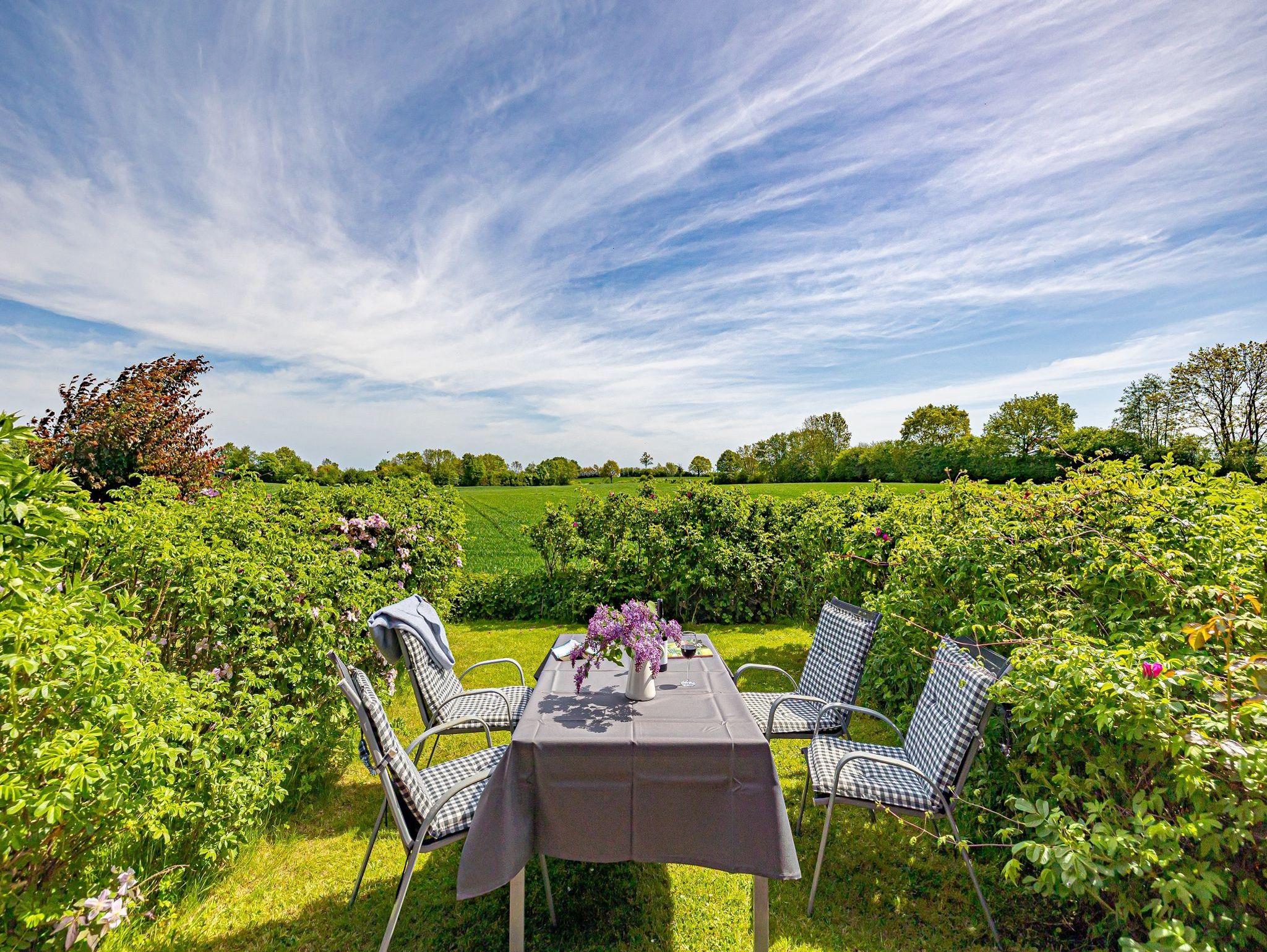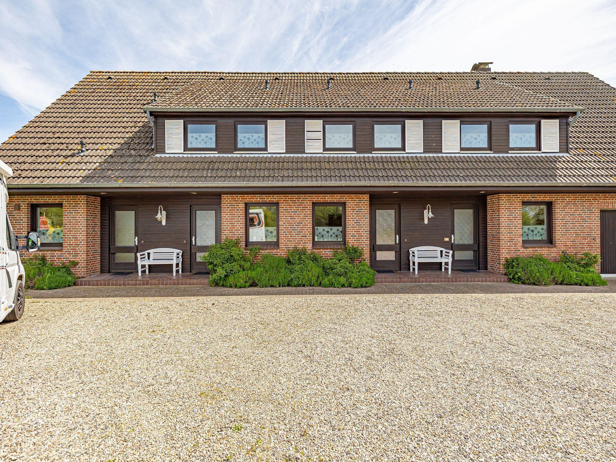Fünf Ferienwohnungen reihen sich nahtlos aneinander. Jede hat einen separaten Eingang und eine eigene Terrasse mit Gartenmöbeln und Grill. Der Panoramablick zeigt Ihnen die Wiesen und Weiden Richtung Meer.