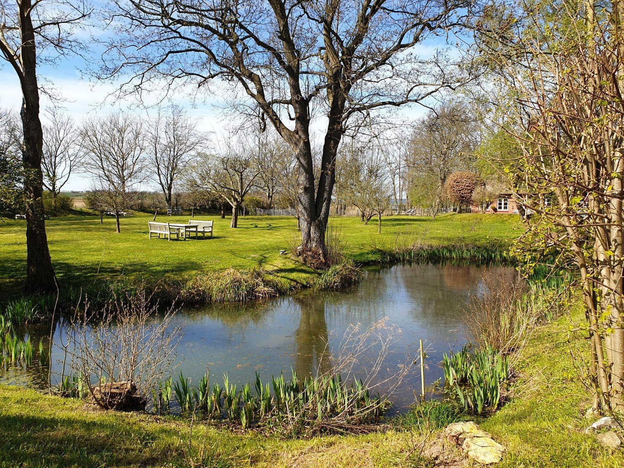 Das parkähnliche Grundstück mit Teichen, alten Bäumen und einer Streuobstwiese lädt zum Verweilen und Entspannen ein. Das angrenzende Habernisser Moor bietet idyllische Wanderwege durch Sumpf, Wiesen und Wald bis zur artesischen Quelle oder zum Naturstrand.