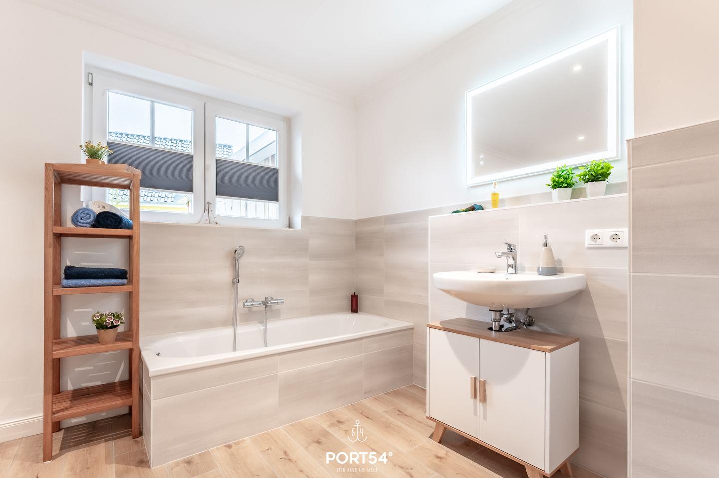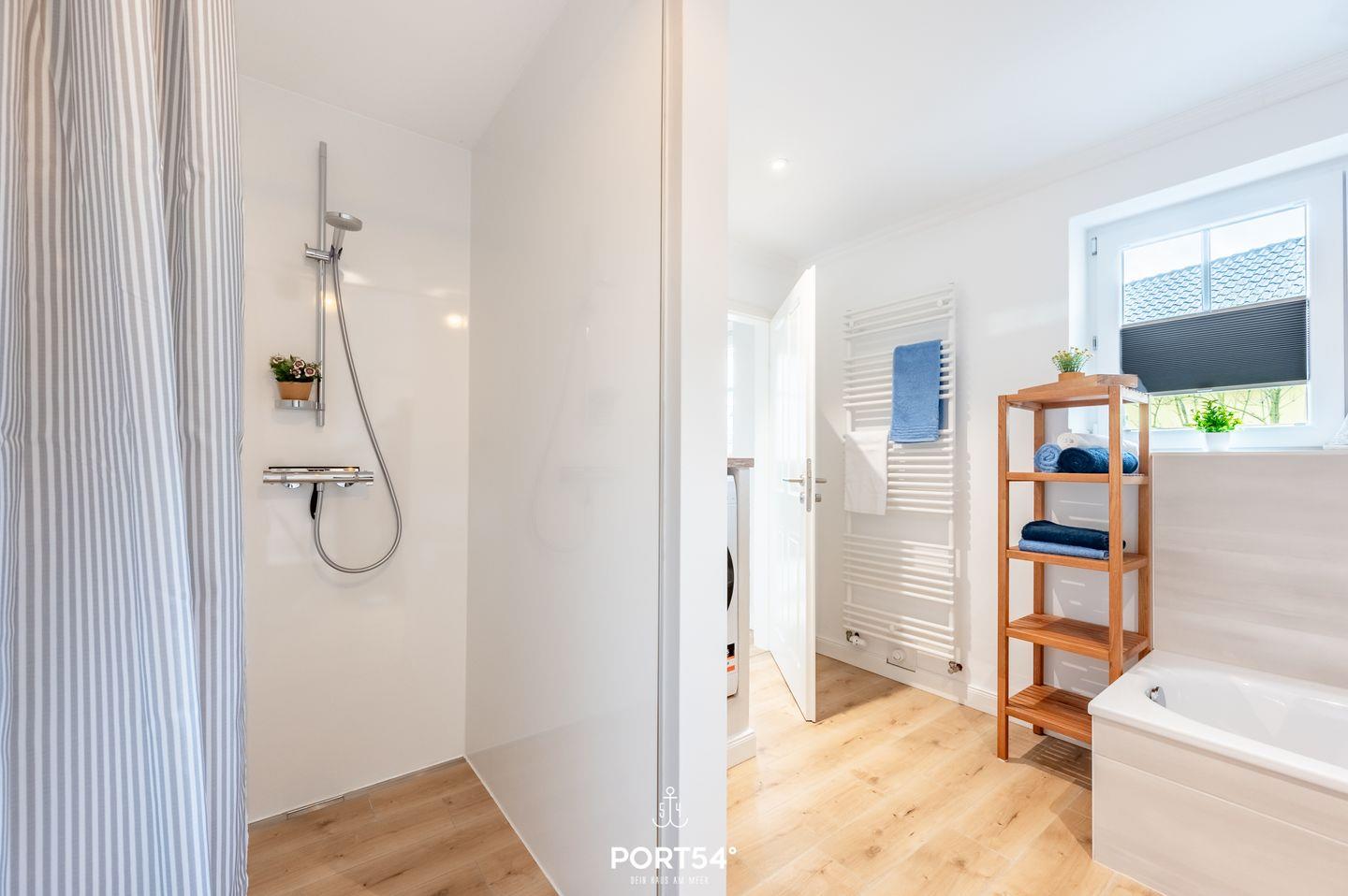 Das Badezimmer bietet Dir neben einem Handtuchtrockner und einem Föhn eine Badewanne sowie eine ebenerdige Dusche.