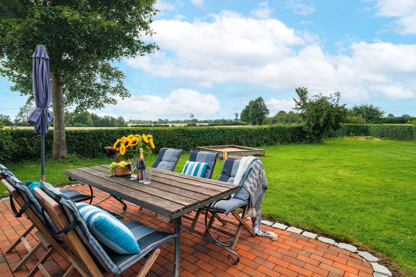 Ein weiteres Highlight bildet die große Terrasse, die direkt an das Wohnzimmer im Erdgeschoss anschließt und mit Gartenmöbeln ausgestattet ist.