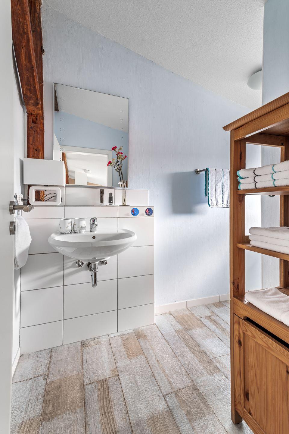 Im Badezimmer des Erdgeschosses ist eine bodengleiche Dusche, ein Waschbecken, ein Spiegel und ein WC vorhanden.