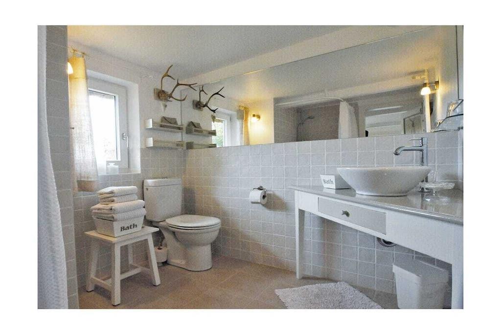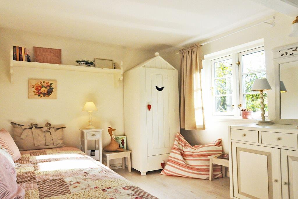 Das Hasenhaus bietet auf 75qm Platz für zu bis 4 Personen. Die individuelle Einrichtung mit vielen liebenswerten Accessoires kombiniert alte, restaurierte Möbel mit modernen Elementen und schafft dadurch eine kuschelige Wohlfühlatmosphäre. Der Wohn– und Essraum mit Kamin und offener Küche ist in Weiß und hellen Pastellfarben gehalten. Die Deckenhöhe in der alten Kate beträgt unter den Balken z.T. weniger als 1,90m. Vom Sofa aus geht der Blick auf die blaue Ostsee, nach Anbruch der Dämmerung wendet man sich dem Kaminfeuer zu und lässt, bei einem Glas Wein, die Eindrücke des Tages auf sich wirken. Die wohnliche Einrichtung jedes der beiden kleinen Schlafzimmer - mit Leinenstoffen, Voilegardinen, Patchworkdecken und schönen Details - ist farblich aufeinander abgestimmt und garantiert erholsamen Schlaf.