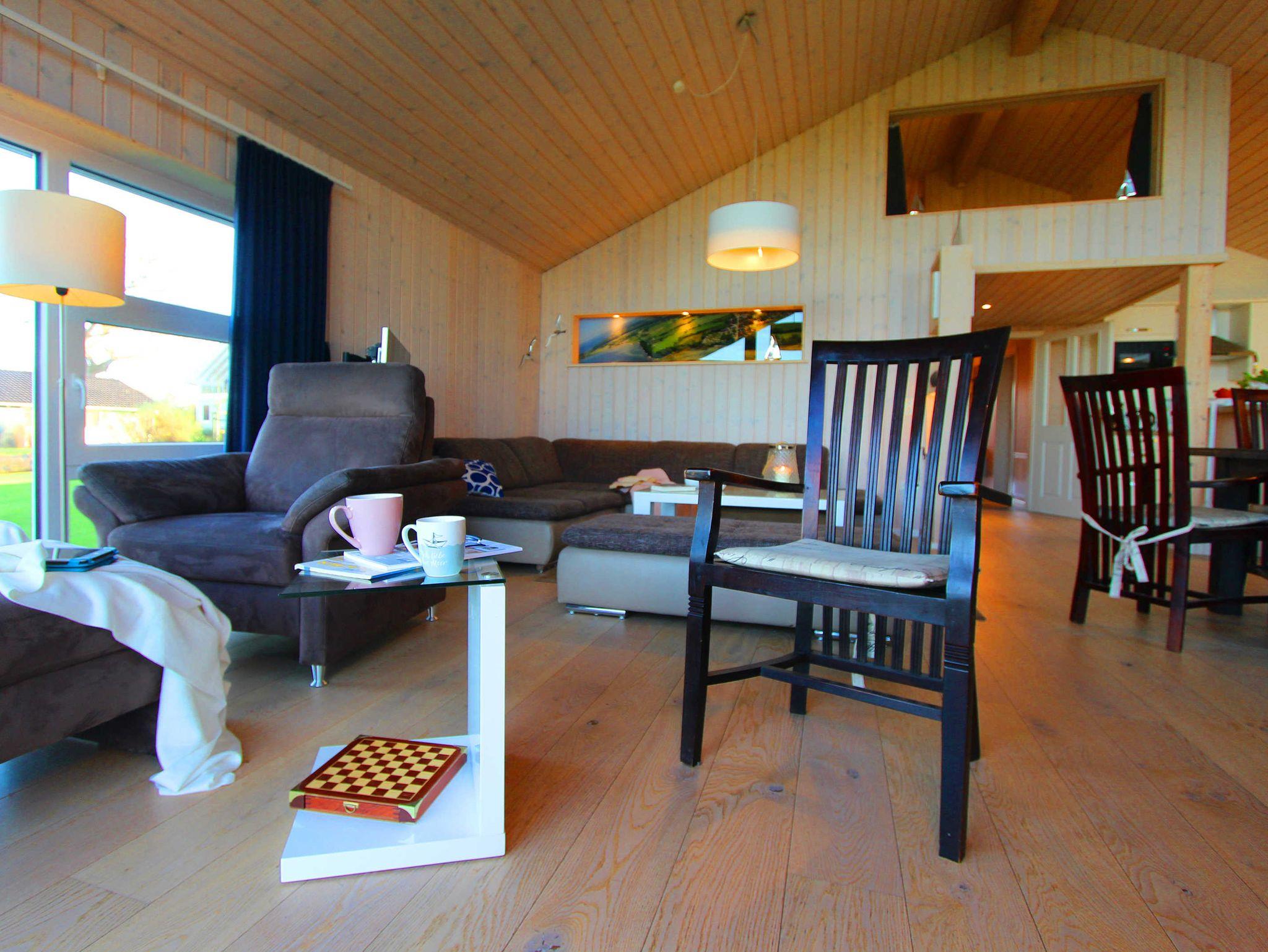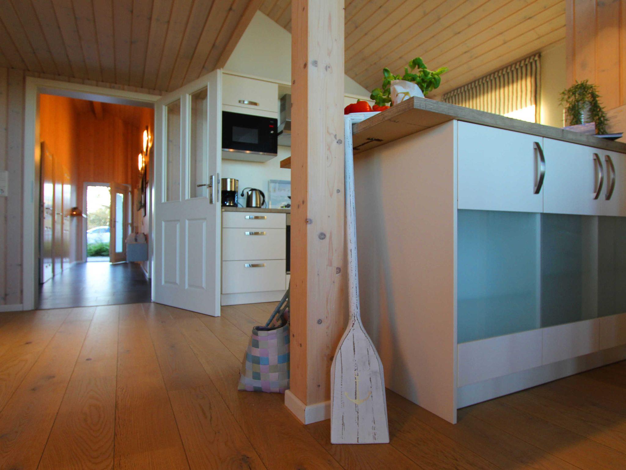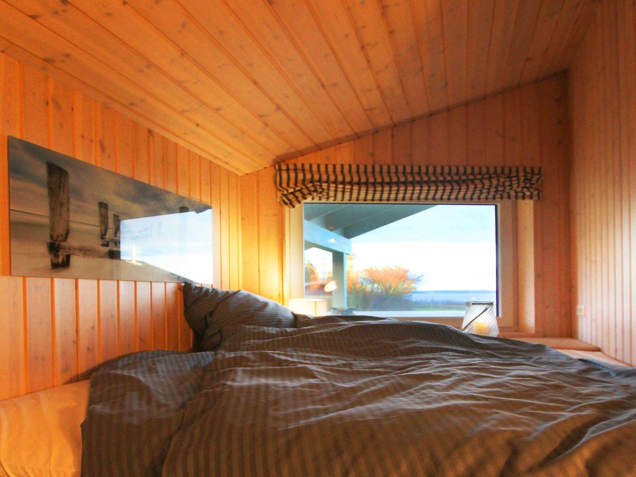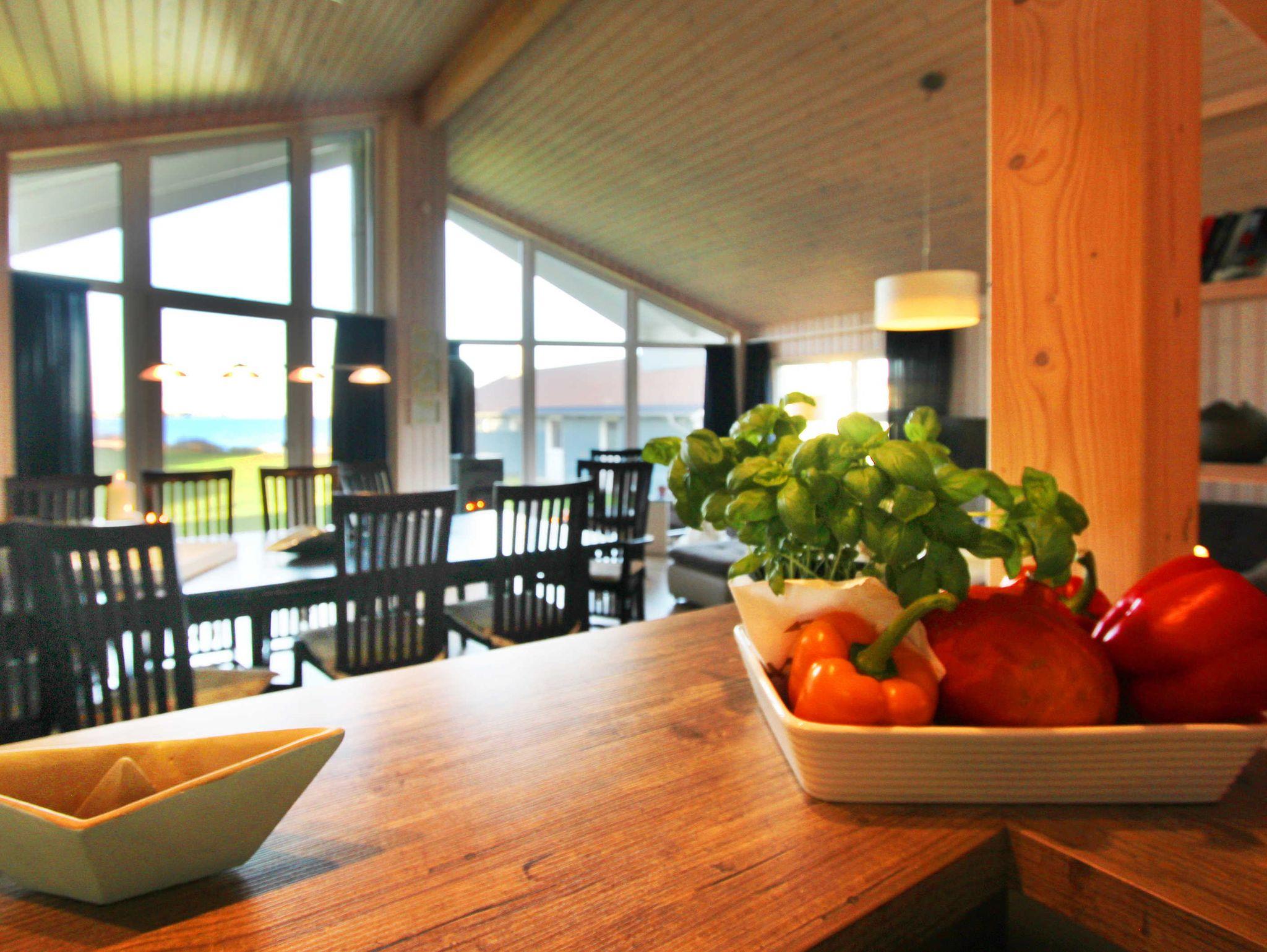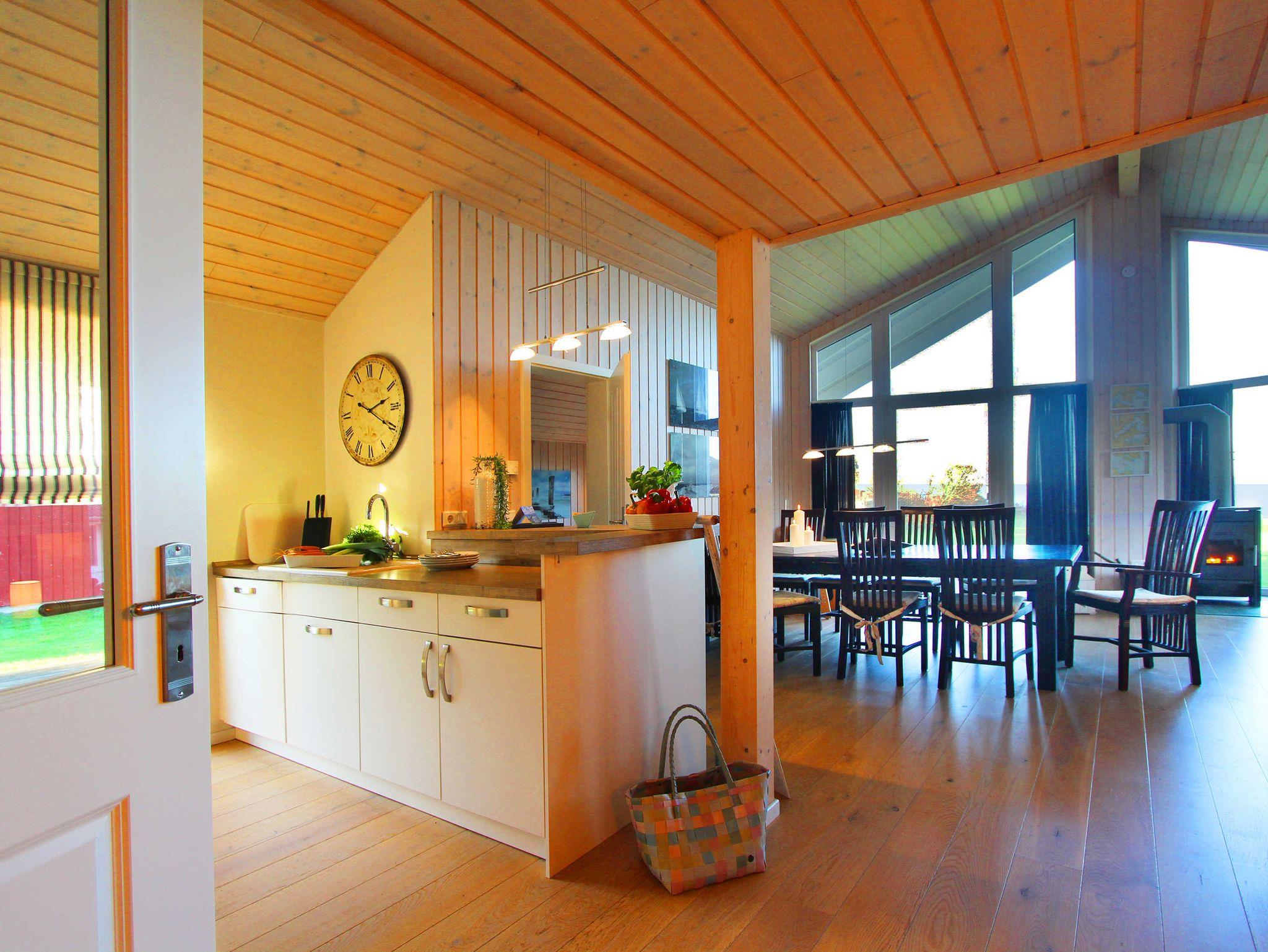 Der helle Wohn- und Essbereich des barrierefreien Hauses ist mit einer offener Küche und einem Kaminofen ausgestattet. Die 4 Schlafzimmer des Hauses laden mit behaglichen Doppelbetten zu erholsamem Schlafen und Träumen ein. Der Hems (Schlafboden) ist mit seinen beiden Schlafmatratzen eine weitere Trauminsel für eine 9. und 10. Person.