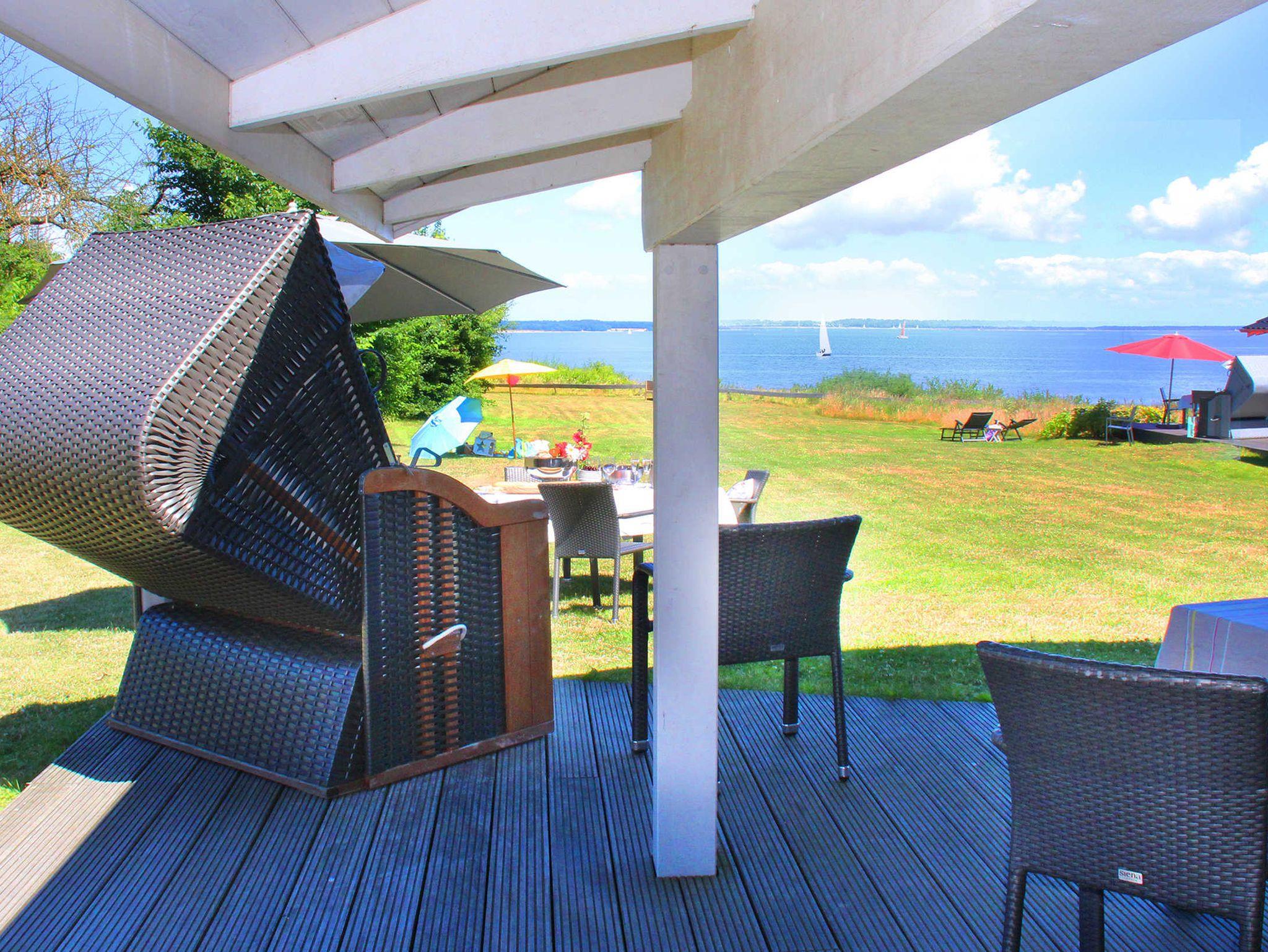 Auf der großen, teilweise überdachten Terrasse lässt es sich mit Meerblick herrlich entspannen, sonnenbaden und grillen.