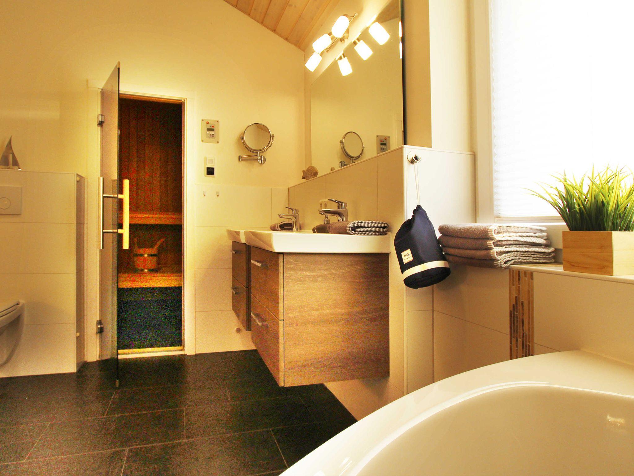Ein Bad mit Whirlpool, ein weiteres Duschbad sowie die hauseigene Sauna sorgen für wohligen Wellness, ganz besonders in den kalten Jahreszeiten.