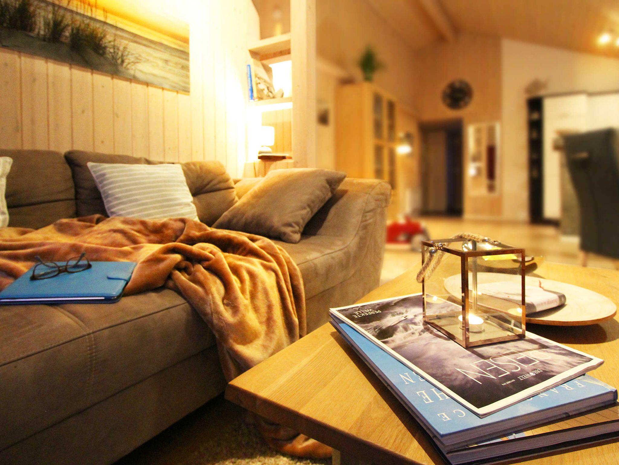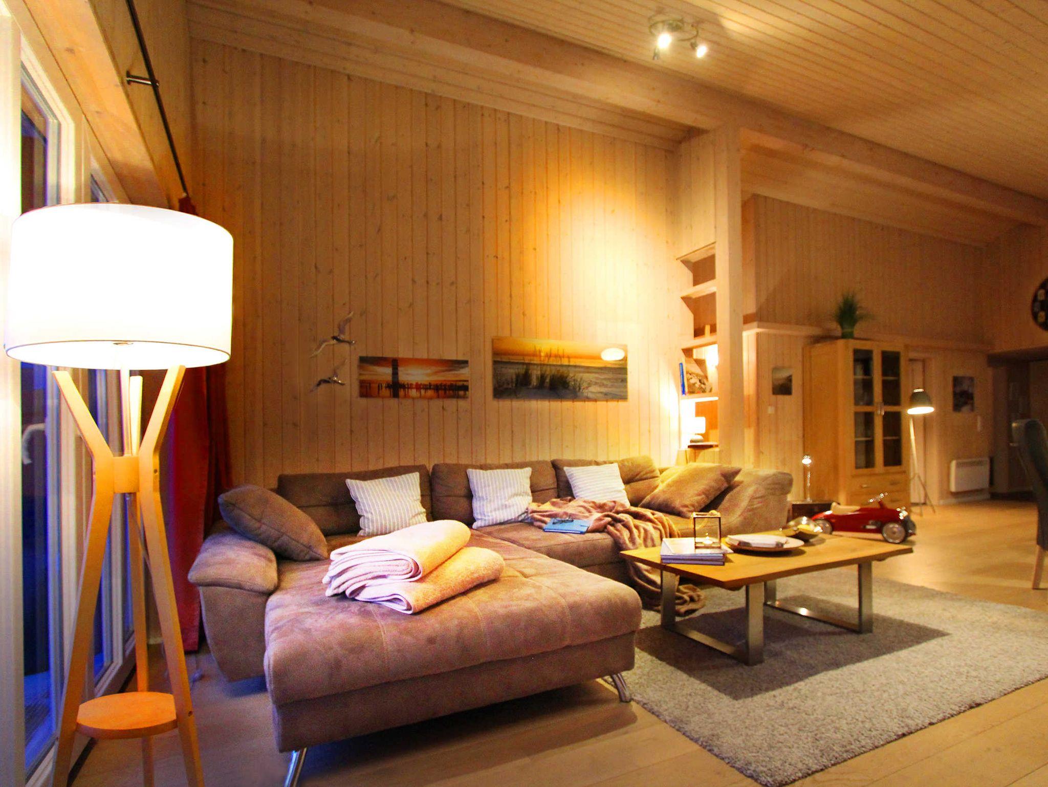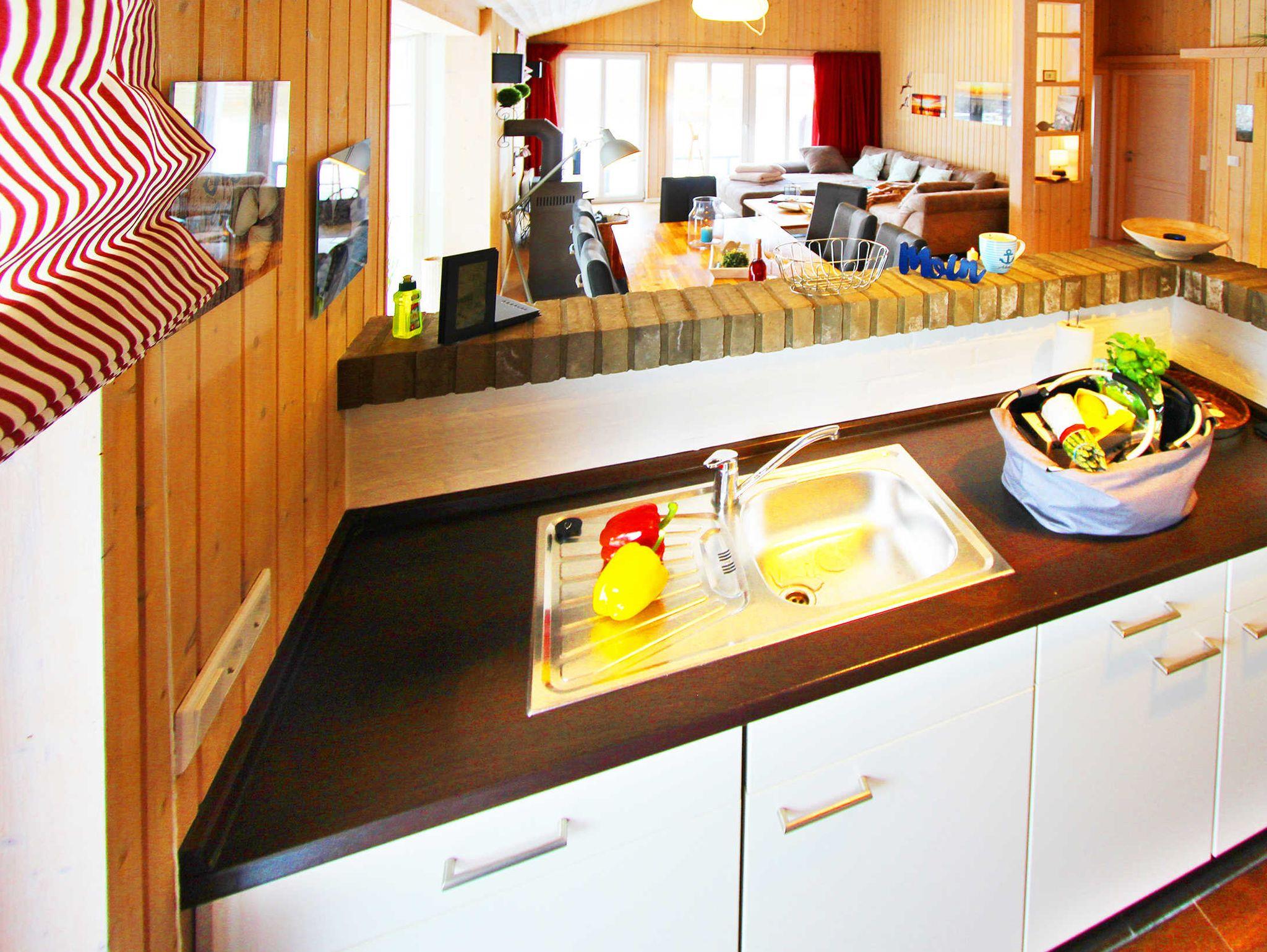 Der helle Wohn- und Essbereich des barrierefreien Hauses ist mit einer offener Küche und einem Kaminofen ausgestattet. Die 3 Schlafzimmer des Hauses laden mit behaglichen Doppelbetten zu erholsamem Schlafen und Träumen ein. Der Hems (Schlafboden) ist mit seinen beiden Schlafmatratzen eine weitere Trauminsel für eine 7. und 8. Person.