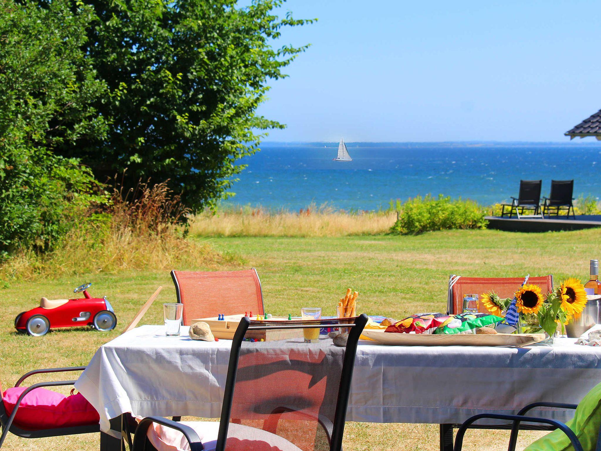 Auf der großen, teilweise überdachten Terrasse lässt es sich mit Meerblick herrlich entspannen, sonnenbaden und grillen.