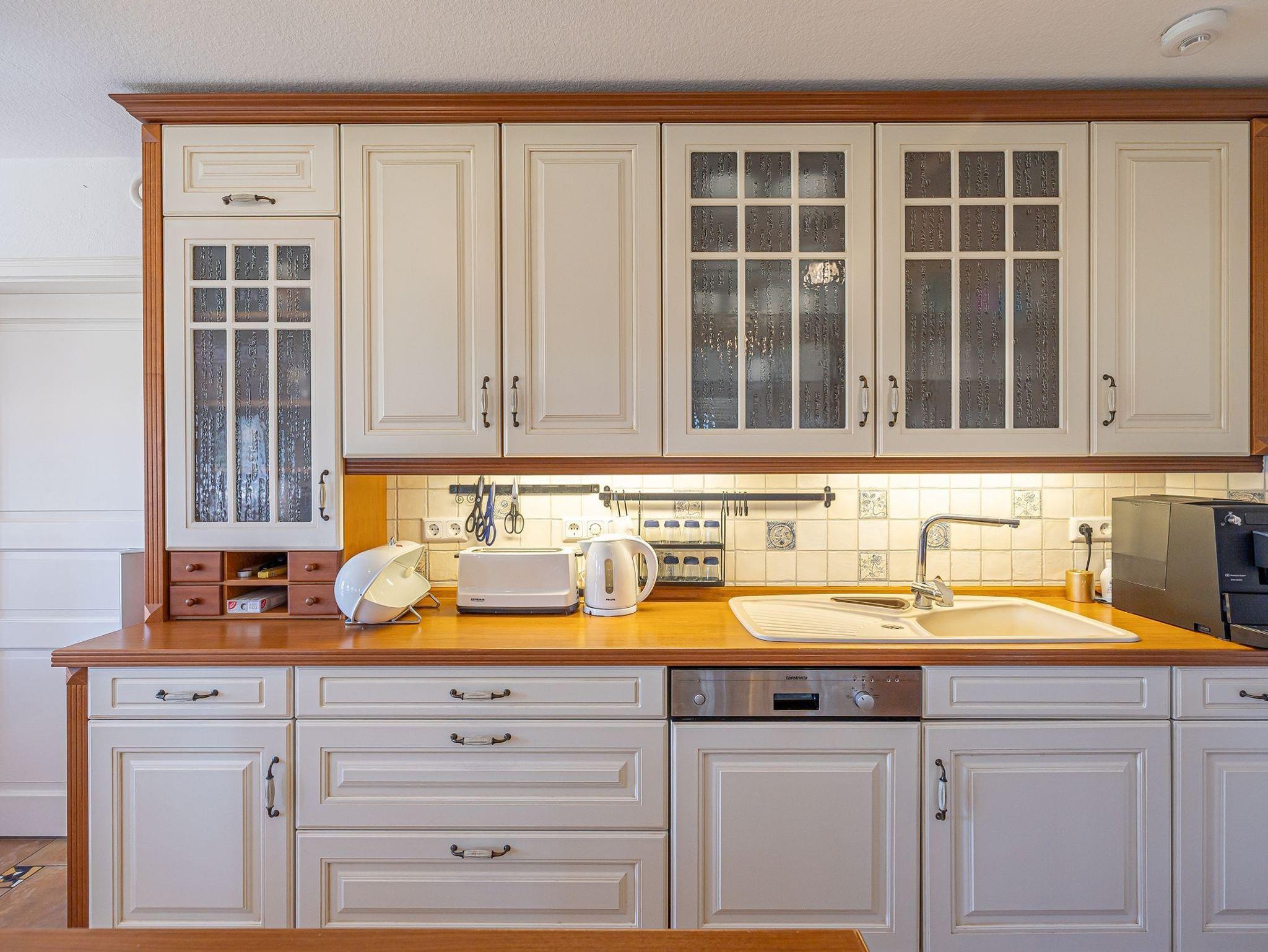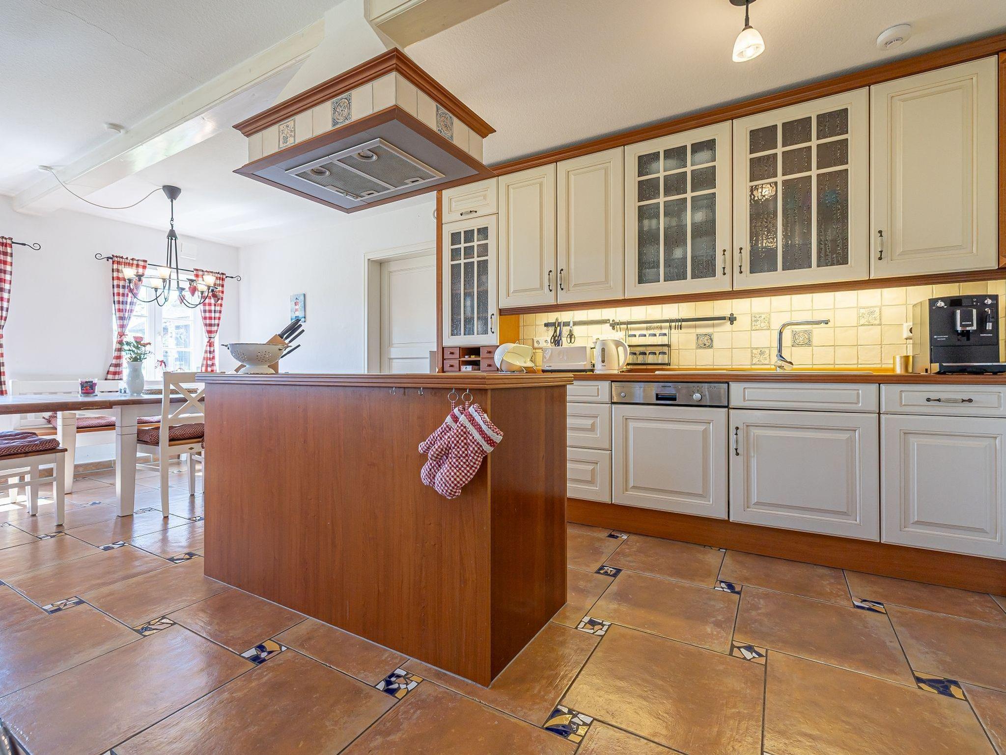 • Großzügiger Wohn- und Essbereich mit Kachelofen/offenem Kamin und angrenzender Küche mit Kochinsel