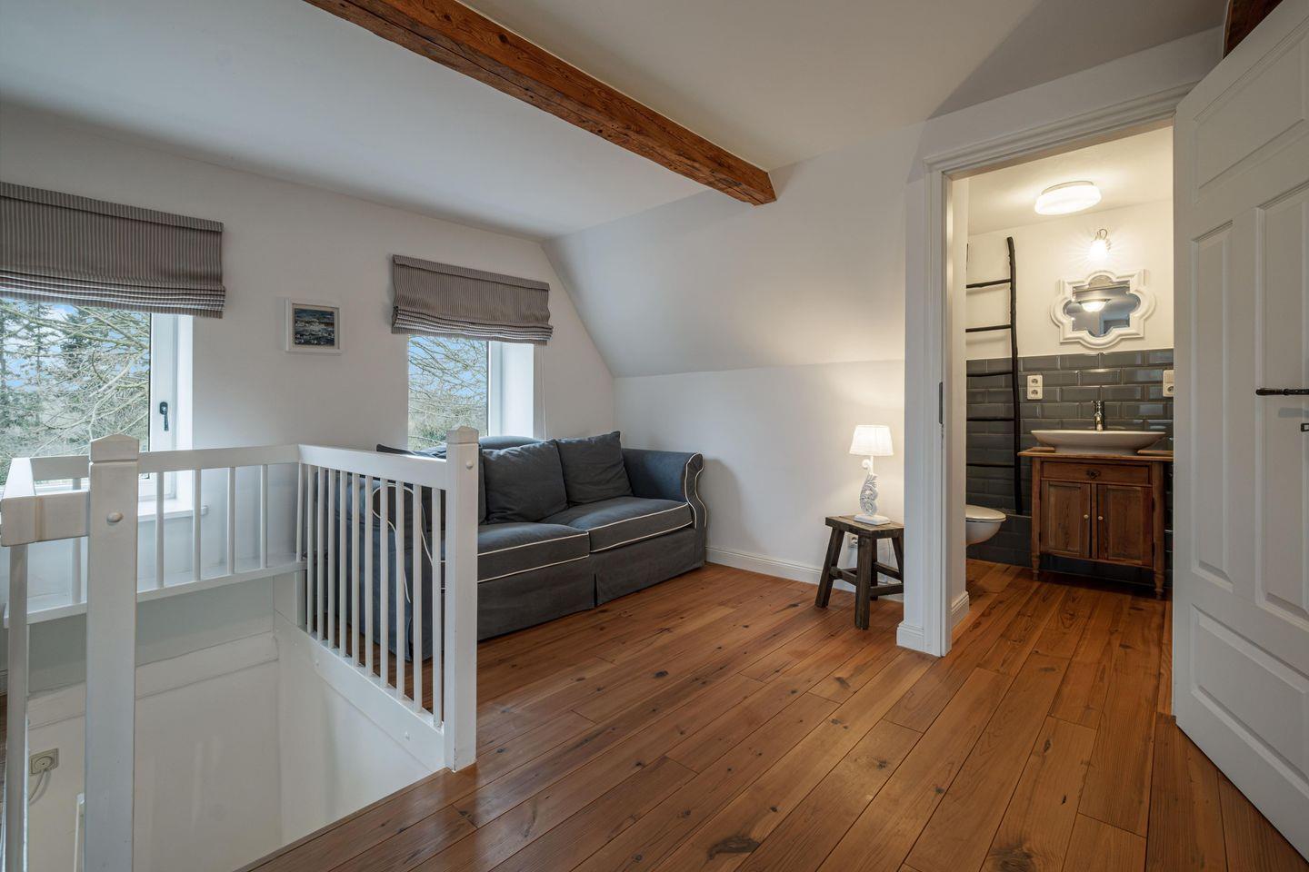 Das Landhaus verfügt über zwei Schlafzimmer mit Doppelbetten. Ein Schlafzimmer ist im Obergeschoss und hat einen eigenen Fernseher. Das zweite Schlafzimmer ist im Erdgeschoss und somit barrierearm (ohne Stufen) erreichbar.