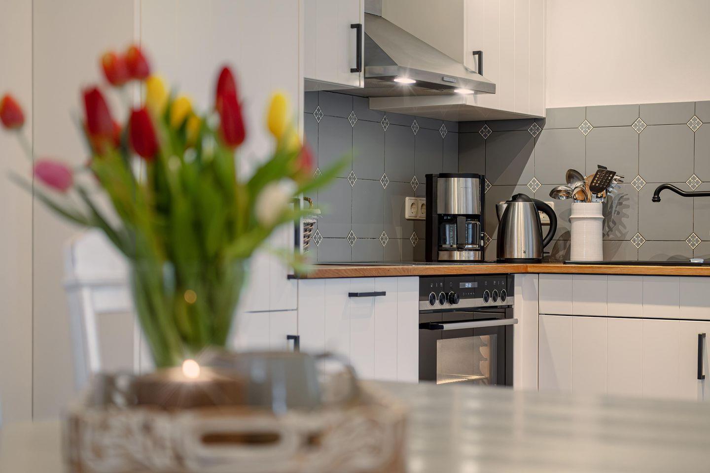 Die Küche, mit den liebevoll aufgearbeiteten Möbeln ist voll ausgestattet. Hier können Sie sich nach Lust und Laune selbst versorgen. Unseren Gästen bieten wir ein kostenfreies Starterset Feuerholz für den Ofen, dass bei Anreise bereit steht. So lassen sich vom ersten Moment an kuschelige Abende mit knisterndem Feuer, warmem Licht und ganz viel Förde-Gefühl genießen – perfekt nach einem Strandspaziergang oder einem langen Tag an der frischen Meeresluft.