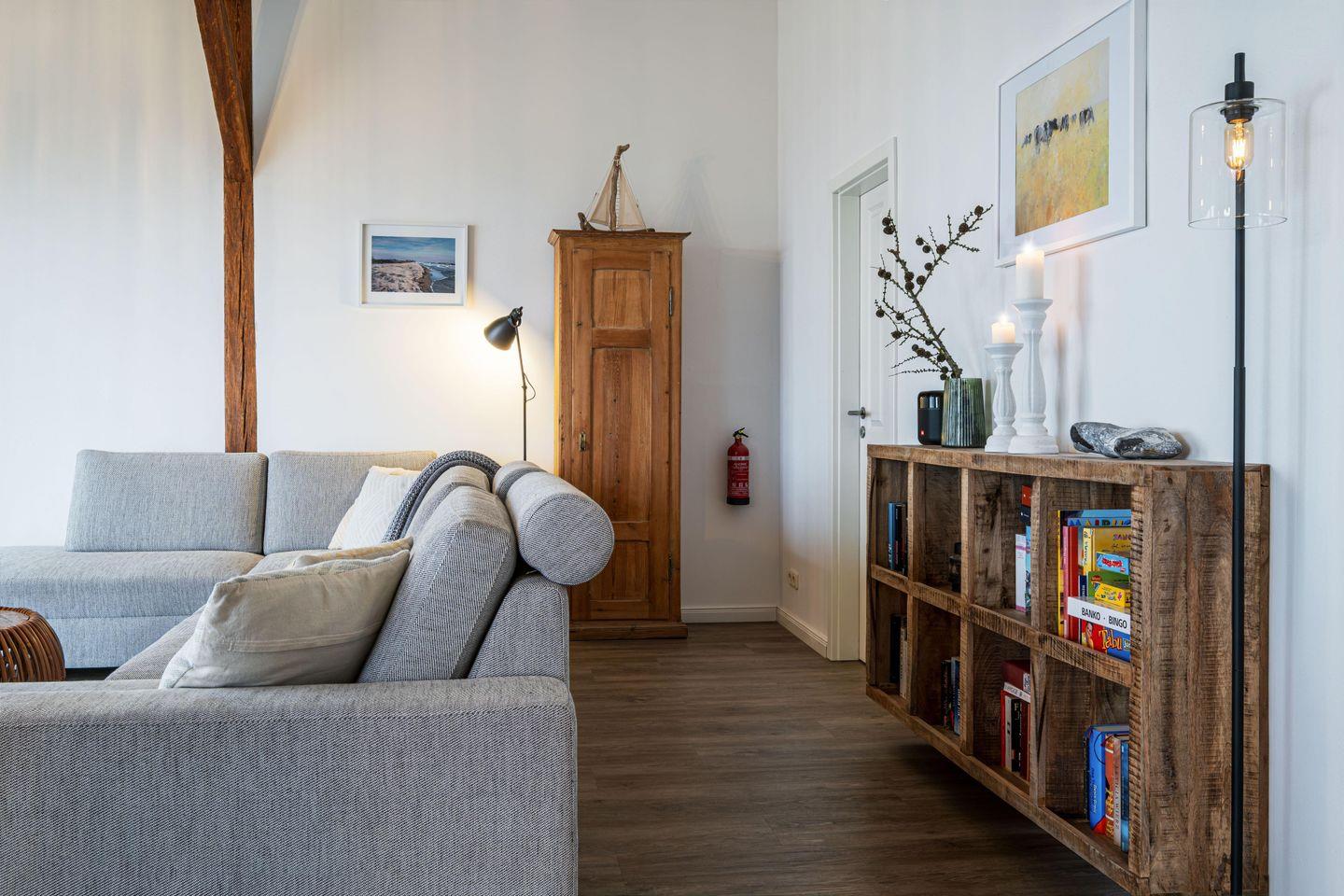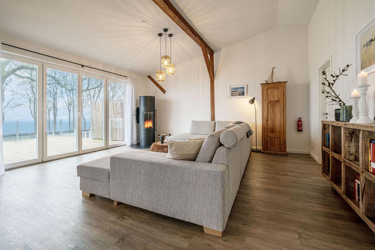 Eine private Sauna, freigelegte Deckenbalken, ein Ofen, schöne Dielenböden und die individuelle sowie geschmackvolle Einrichtung runden das Angebot ab. Unseren Gästen bieten wir ein kostenfreies Starterset Feuerholz für den Ofen, dass bei Anreise bereit steht. So lassen sich vom ersten Moment an kuschelige Abende mit knisterndem Feuer, warmem Licht und ganz viel Förde-Gefühl genießen – perfekt nach einem Strandspaziergang oder einem langen Tag an der frischen Meeresluft.