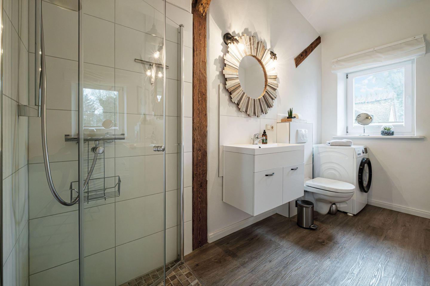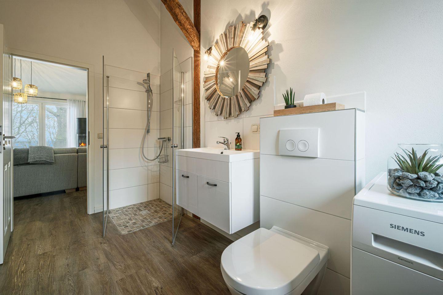 Das moderne Badezimmer verfügt über eine bodentiefe Dusche und Fußbodenheizung zum Entspannen. Hier finden Sie auch die Waschmaschine.