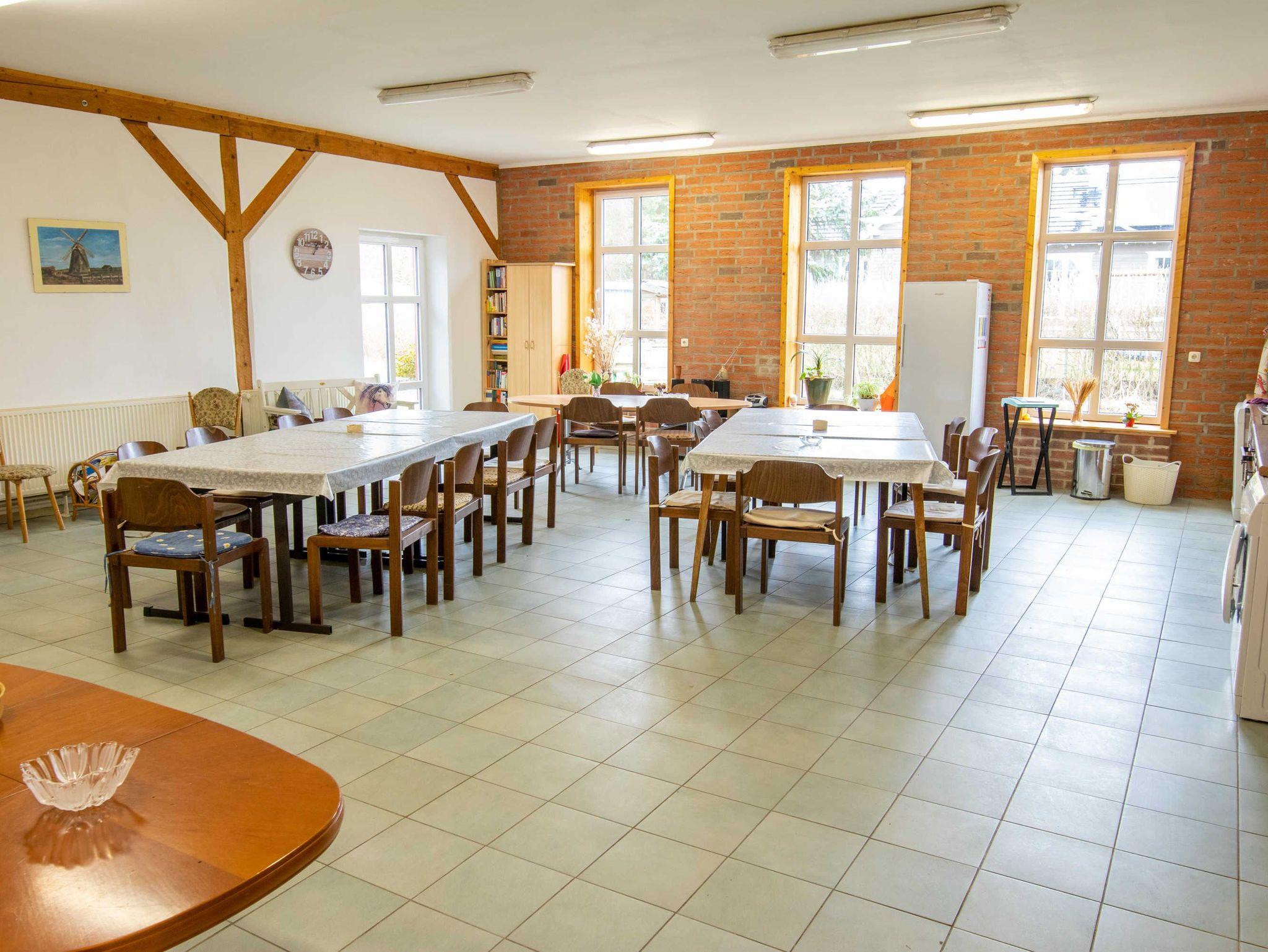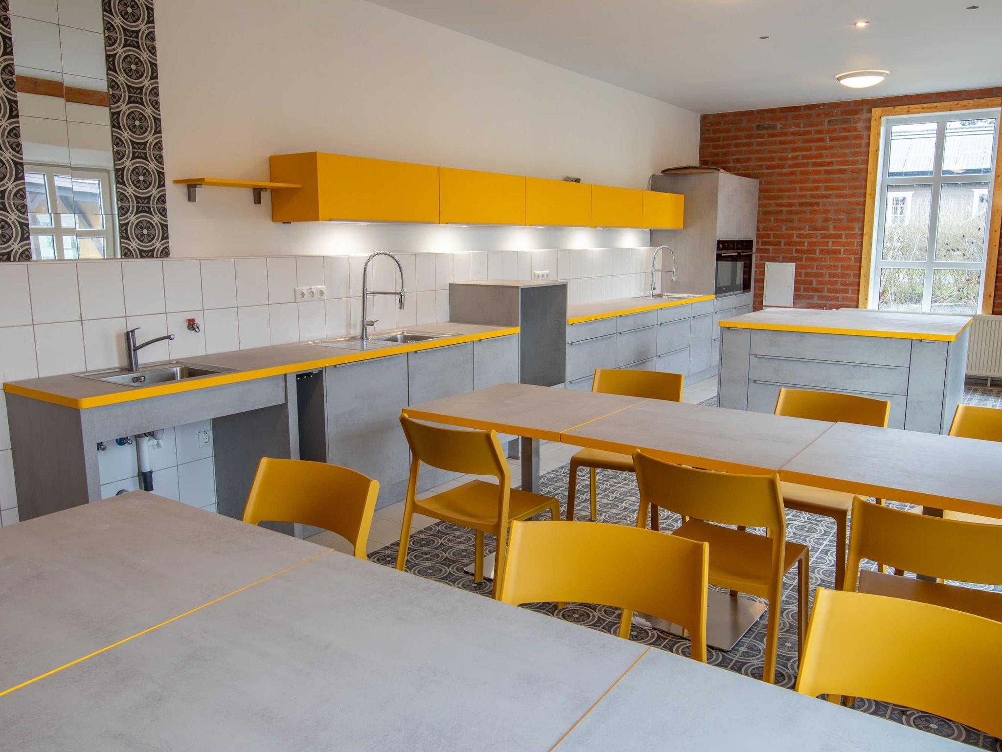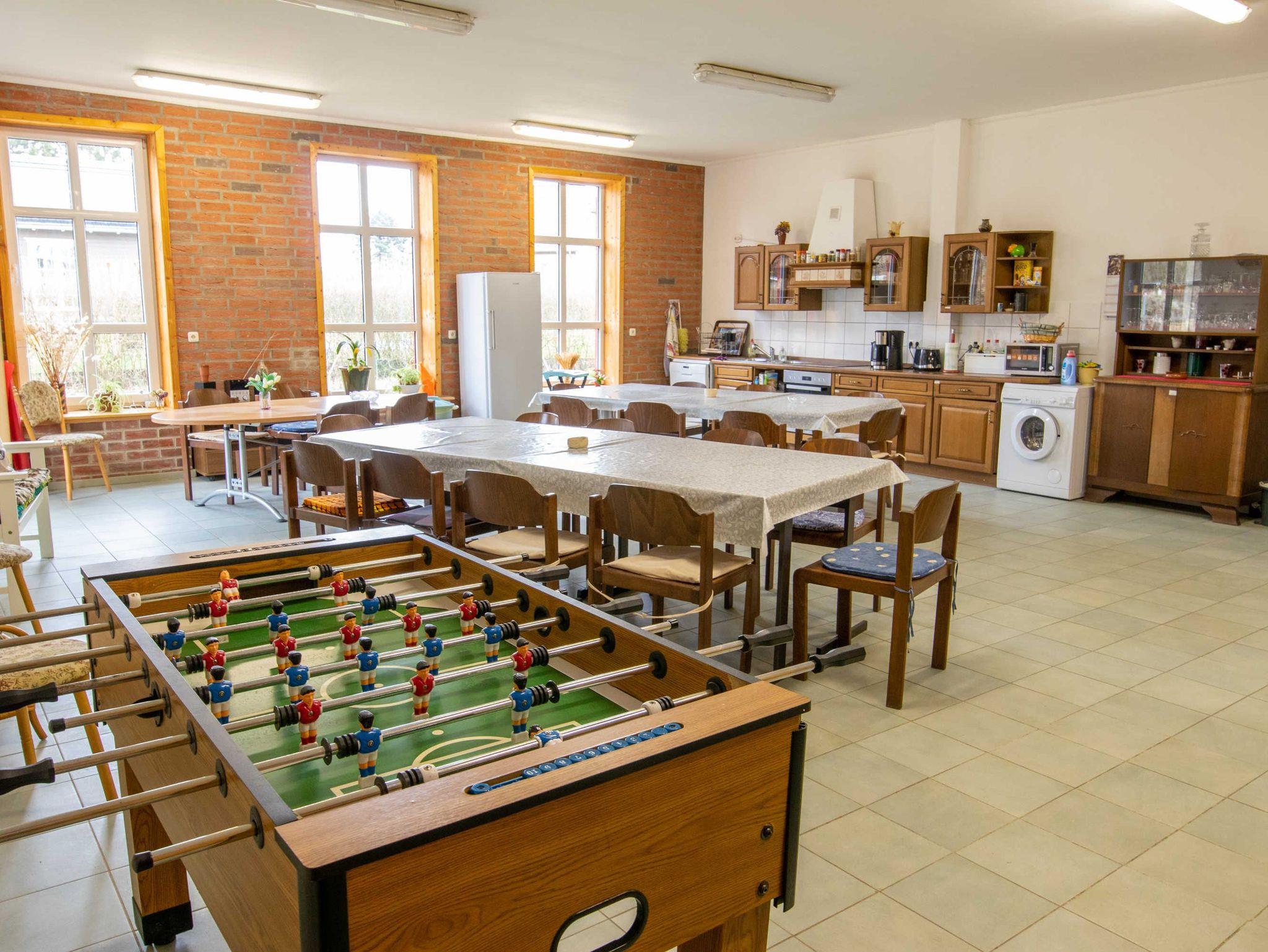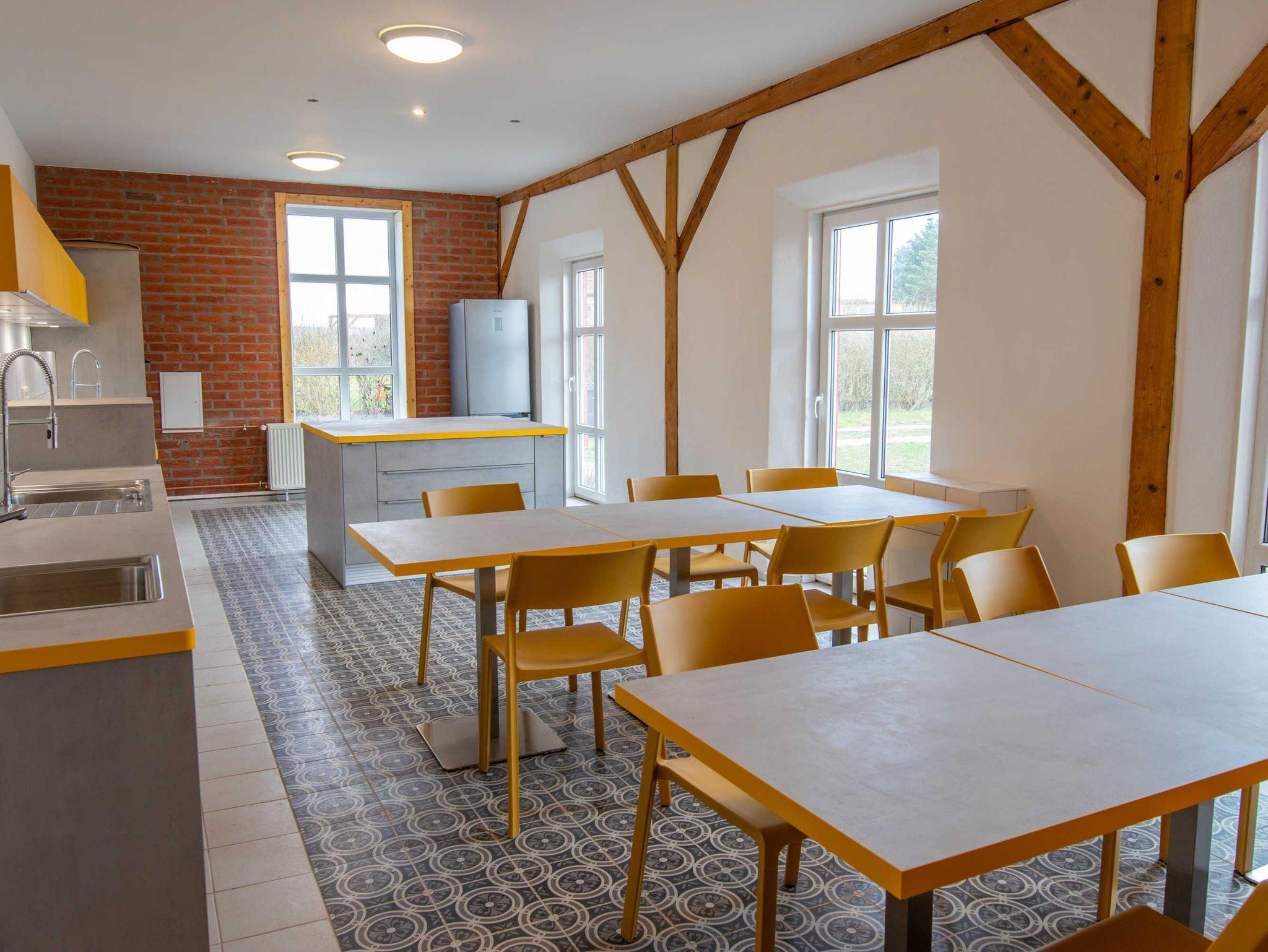 Das 170 m² große Ferienhaus bietet Platz für bis zu 20 Erwachsene und 10 Kinder. Im Haupthaus befindet sich ein 80 m² großer Gemeinschaftsraum, der mit einer offenen, großen Küche, einem Kaminofen und ausreichend Sitzmöglichkeiten inklusive Tischen eingerichtet ist. Die Küche ist mit Kühl-Gefriermöglichkeit, 4-Platten-Herd, Backofen und Geschirrspüler ausgestattet. Das Ferienhaus bietet sich perfekt für Klassenfahrten oder Schulausflüge an.