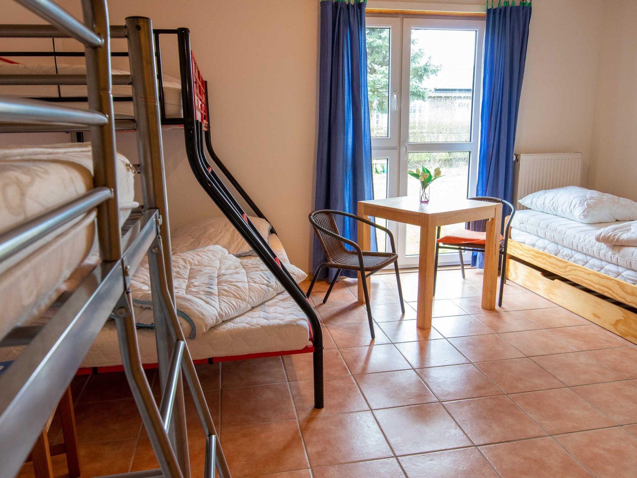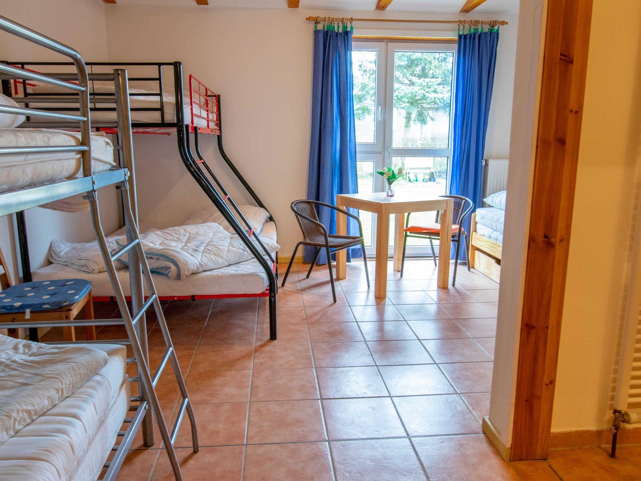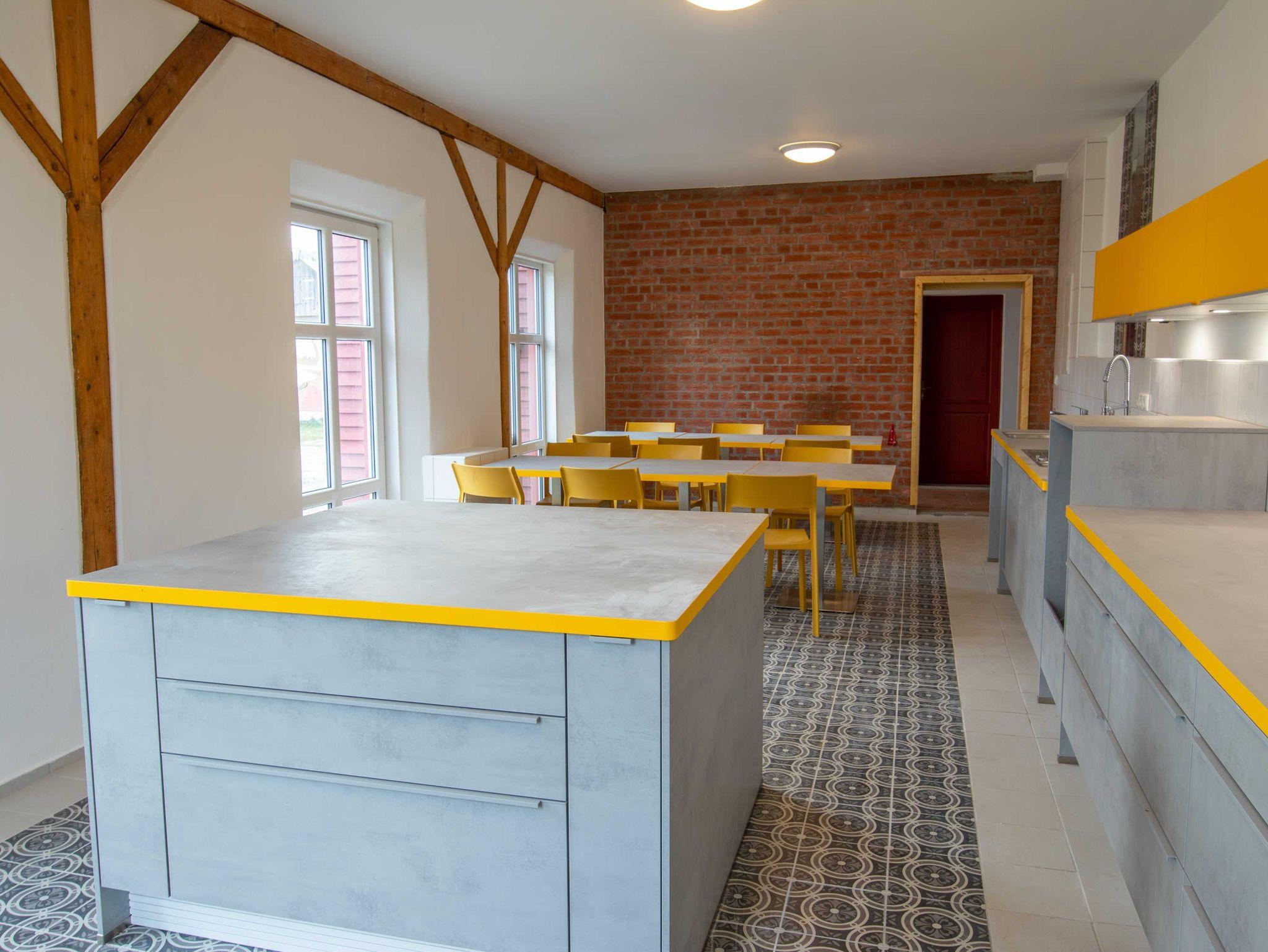 Das 170 m² große Ferienhaus bietet Platz für bis zu 20 Erwachsene und 10 Kinder. Im Haupthaus befindet sich ein 80 m² großer Gemeinschaftsraum, der mit einer offenen, großen Küche, einem Kaminofen und ausreichend Sitzmöglichkeiten inklusive Tischen eingerichtet ist. Die Küche ist mit Kühl-Gefriermöglichkeit, 4-Platten-Herd, Backofen und Geschirrspüler ausgestattet. Das Ferienhaus bietet sich perfekt für Klassenfahrten oder Schulausflüge an.