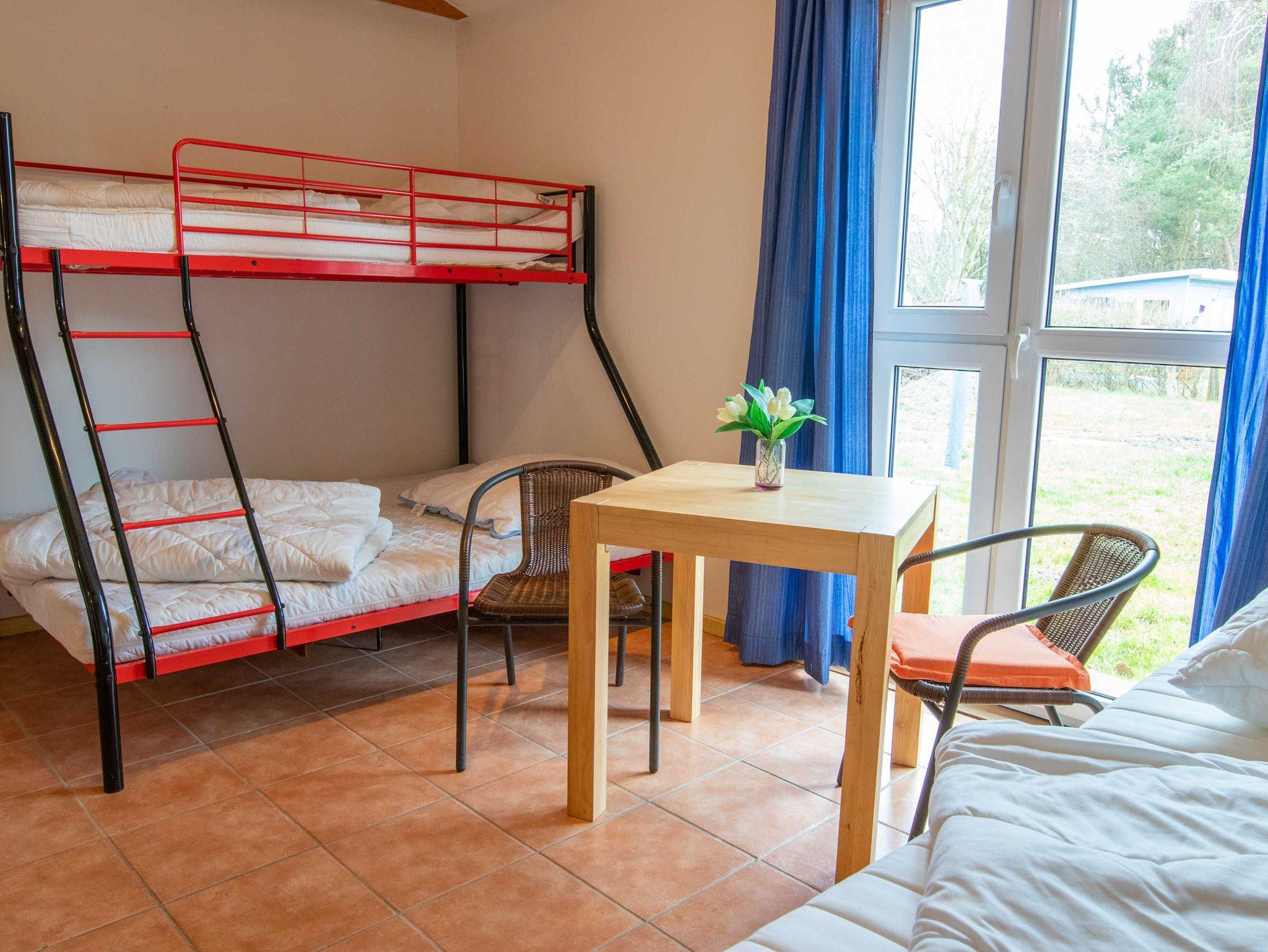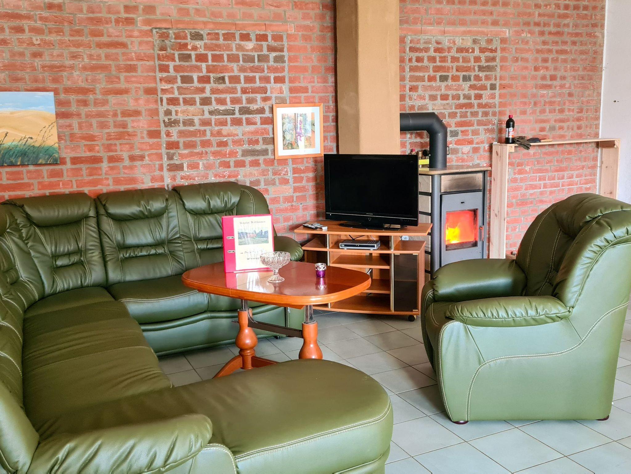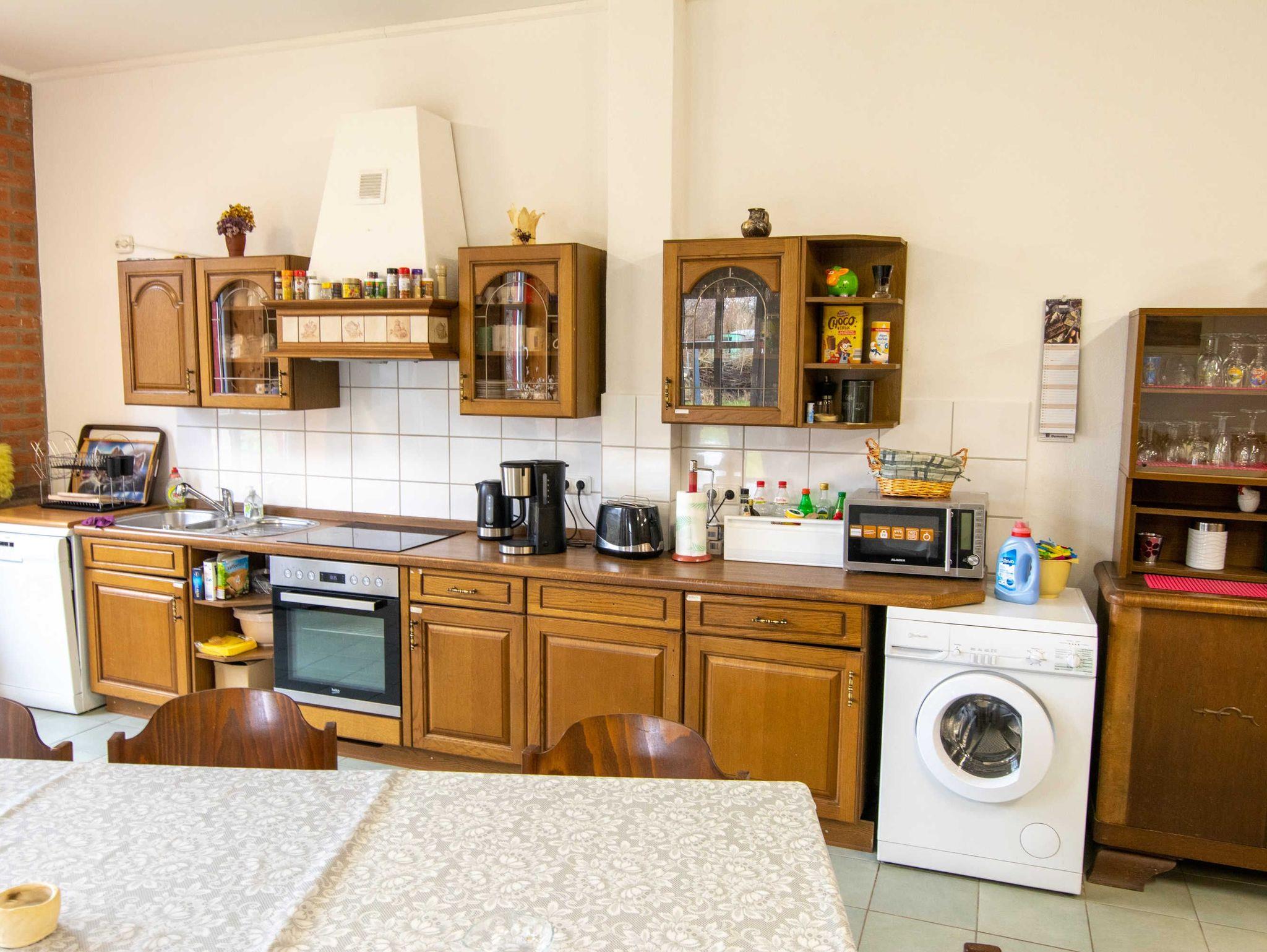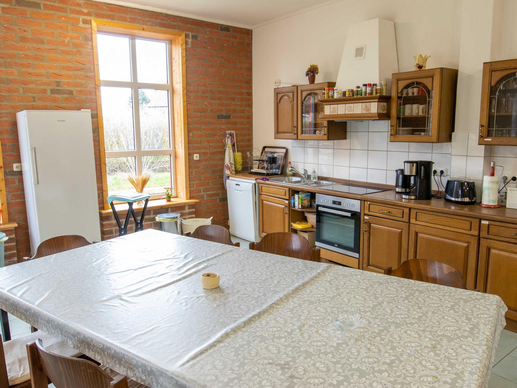 Das 170 m² große Ferienhaus bietet Platz für bis zu 20 Erwachsene und 10 Kinder. Im Haupthaus befindet sich ein 80 m² großer Gemeinschaftsraum, der mit einer offenen, großen Küche, einem Kaminofen und ausreichend Sitzmöglichkeiten inklusive Tischen eingerichtet ist. Die Küche ist mit Kühl-Gefriermöglichkeit, 4-Platten-Herd, Backofen und Geschirrspüler ausgestattet. Das Ferienhaus bietet sich perfekt für Klassenfahrten oder Schulausflüge an.
