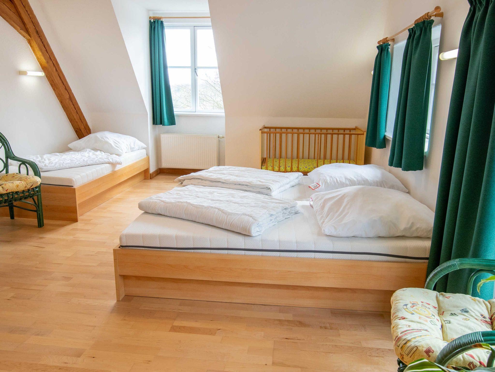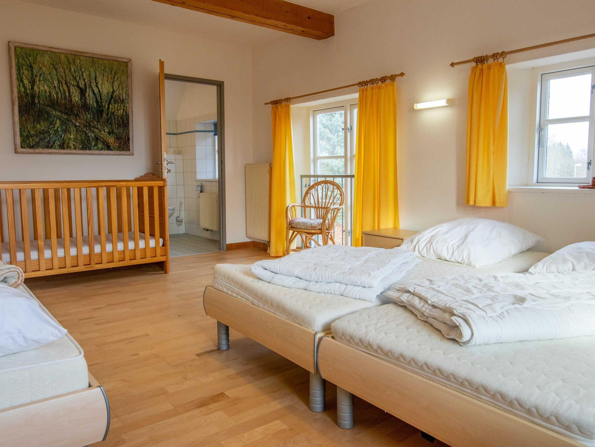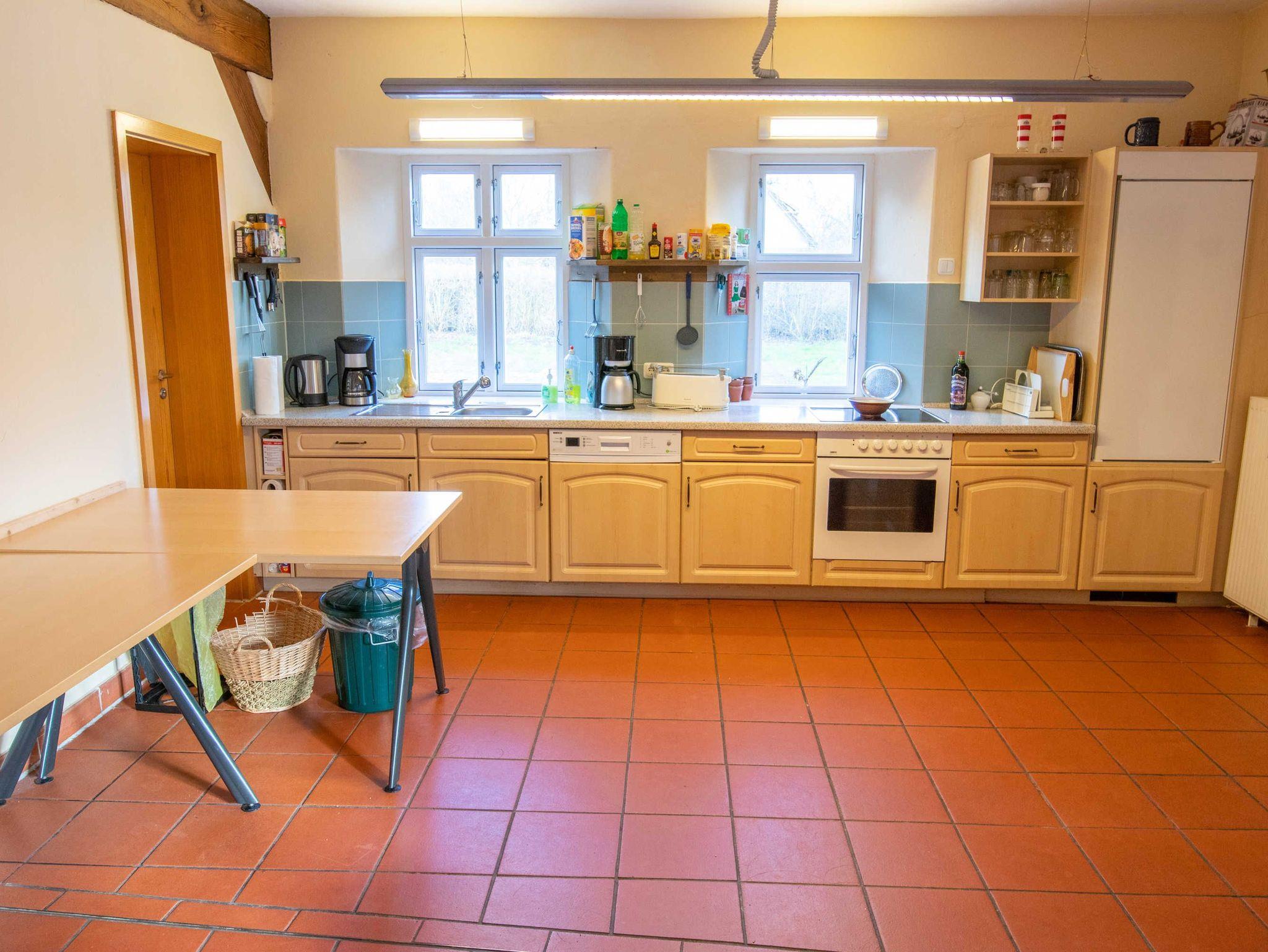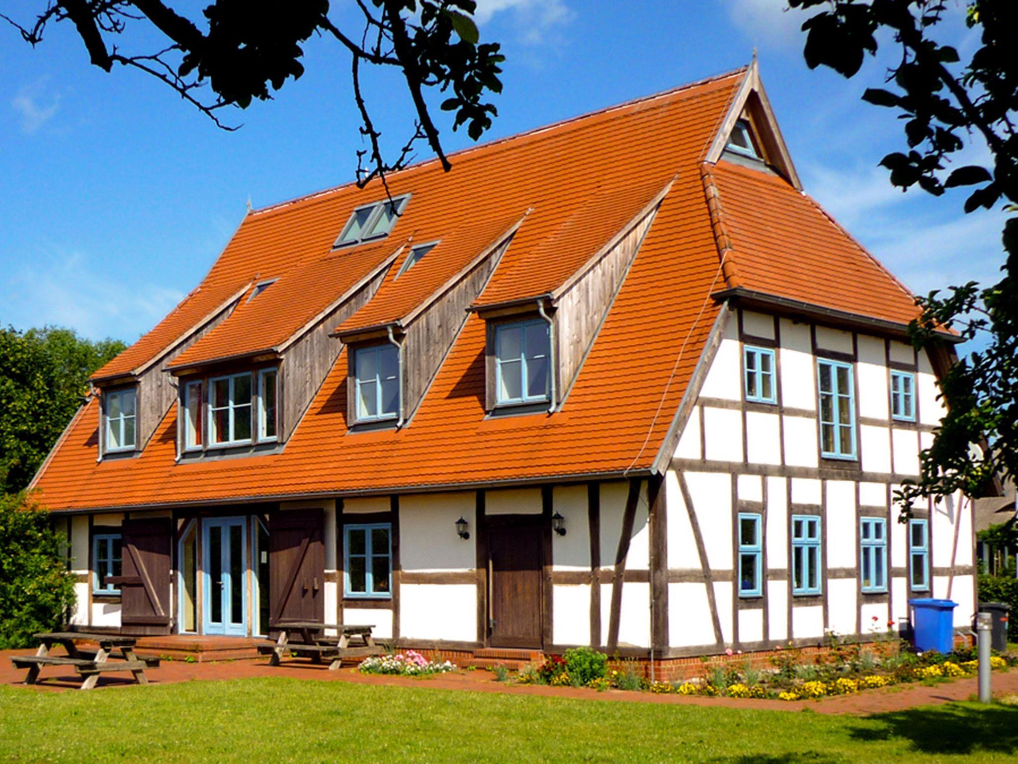 Im 3-stöckigen 170 m² großen mit Lehm ausgefachteten Fachwerkhaus ist Platz für bis zu 14 Personen. Die vordere Eingangstür ist über eine Rampe erreichbar. Im Erdgeschoss des Ferienhauses befindet sich der große Aufenthaltsraum mit vielen Sitzmöglichkeiten und einem TV. Die offene Küche ist mit einem Herd, Backofen, Kühlschrank und einer Spülmaschine ausgestattet. Geschirr, Besteck, eine Kaffeemaschine und ein Wasserkocher sind ebenfalls vorhanden. 2 Gäste-WC vervollständigen diesen Bereich. Außerdem befindet sich im Erdgeschoss ein behindertengerechtes Schlafzimmer (zwei getrennte Betten, 90x200cm) mit rollstuhlgerechtem Badezimmer, welches mit einer befahrbaren Dusche, Duschsitz, Waschbecken und WC eingerichtet ist. Über eine Treppe erreicht man die erste Etage. Dort befinden sich die vier weiteren Schlafzimmer (1x Zweibettzimmer, 2x Dreibettzimmer, 1x Vierbettzimmer, jeweils 90x200). Alle Schlafzimmer verfügen über einen Kleiderschrank, Tisch und Stühle. Zu jedem Schlafzimmer gehört ein Bad mit Dusche, Waschbecken und WC, zwei davon sind über den Flur erreichbar. Ein Zustellbett steht zusätzlich zur Verfügung. Im Dachgeschoss gibt es einen weiteren Aufenthaltsbereich mit Sitzmöglichkeiten, Büchern und Flachbild-TV. Am hinteren Ausgang schließt sich eine Terrasse mit Holzbänken, Grillmöglichkeit, Feuerstelle und eine große Wiese an.