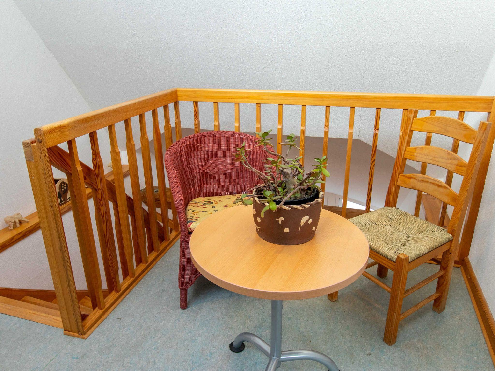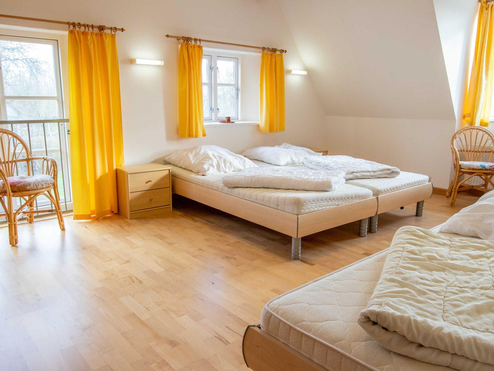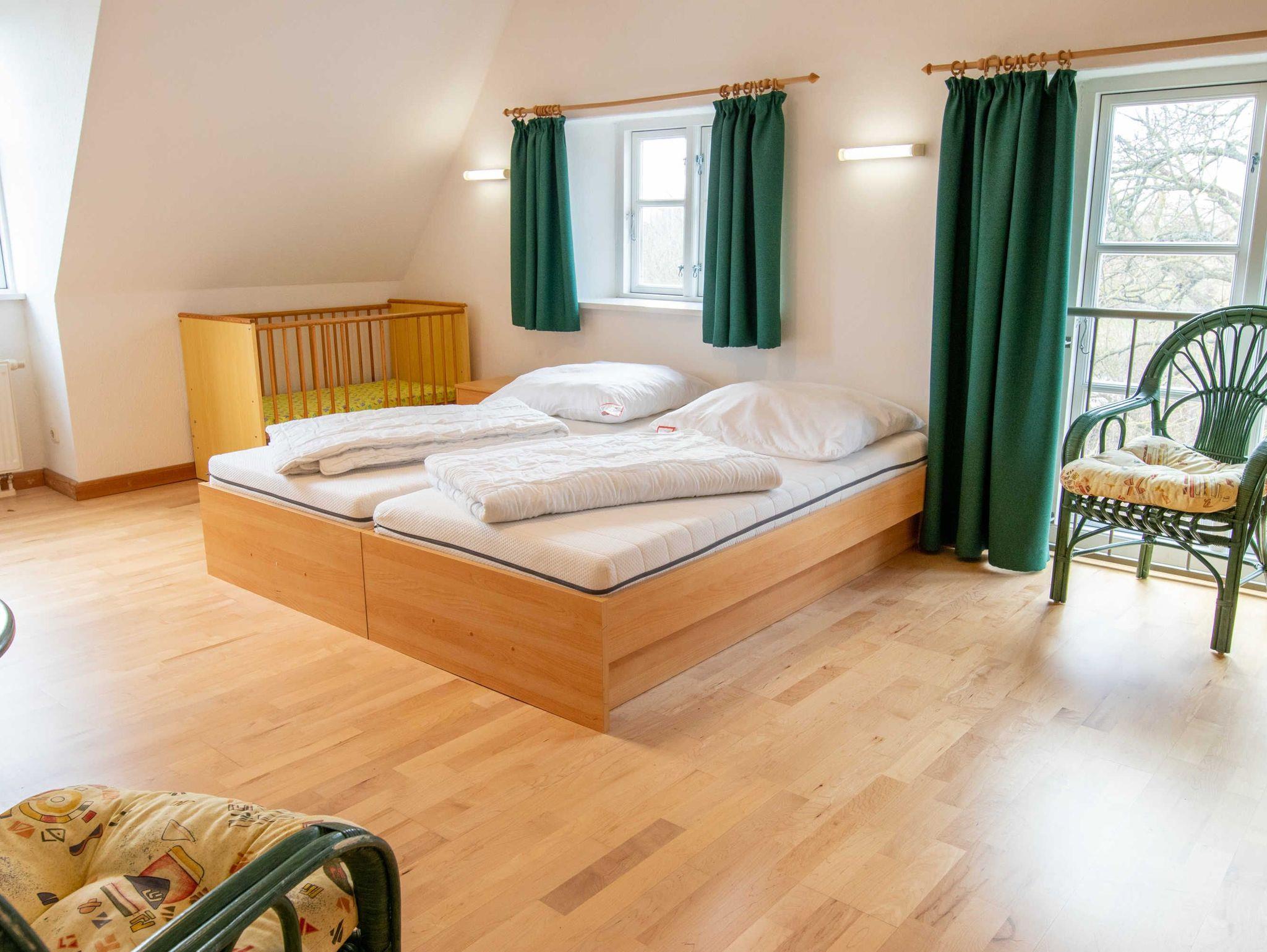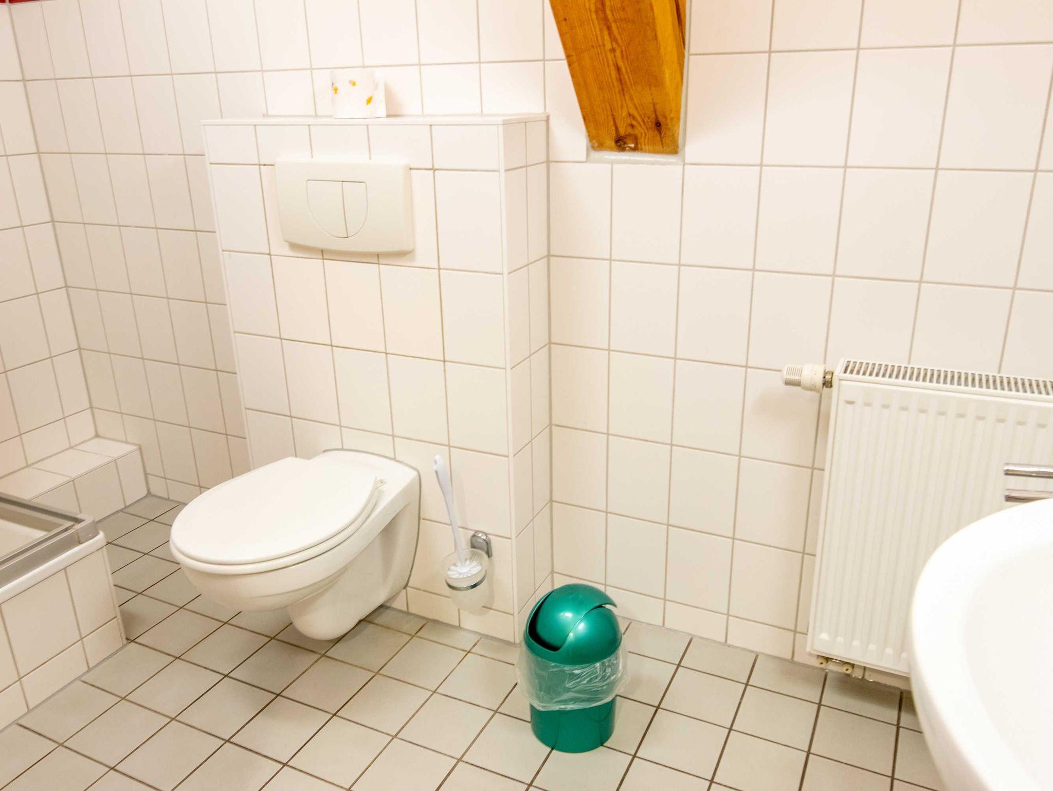Im 3-stöckigen 170 m² großen mit Lehm ausgefachteten Fachwerkhaus ist Platz für bis zu 14 Personen. Die vordere Eingangstür ist über eine Rampe erreichbar. Im Erdgeschoss des Ferienhauses befindet sich der große Aufenthaltsraum mit vielen Sitzmöglichkeiten und einem TV. Die offene Küche ist mit einem Herd, Backofen, Kühlschrank und einer Spülmaschine ausgestattet. Geschirr, Besteck, eine Kaffeemaschine und ein Wasserkocher sind ebenfalls vorhanden. 2 Gäste-WC vervollständigen diesen Bereich. Außerdem befindet sich im Erdgeschoss ein behindertengerechtes Schlafzimmer (zwei getrennte Betten, 90x200cm) mit rollstuhlgerechtem Badezimmer, welches mit einer befahrbaren Dusche, Duschsitz, Waschbecken und WC eingerichtet ist. Über eine Treppe erreicht man die erste Etage. Dort befinden sich die vier weiteren Schlafzimmer (1x Zweibettzimmer, 2x Dreibettzimmer, 1x Vierbettzimmer, jeweils 90x200). Alle Schlafzimmer verfügen über einen Kleiderschrank, Tisch und Stühle. Zu jedem Schlafzimmer gehört ein Bad mit Dusche, Waschbecken und WC, zwei davon sind über den Flur erreichbar. Ein Zustellbett steht zusätzlich zur Verfügung. Im Dachgeschoss gibt es einen weiteren Aufenthaltsbereich mit Sitzmöglichkeiten, Büchern und Flachbild-TV. Am hinteren Ausgang schließt sich eine Terrasse mit Holzbänken, Grillmöglichkeit, Feuerstelle und eine große Wiese an.