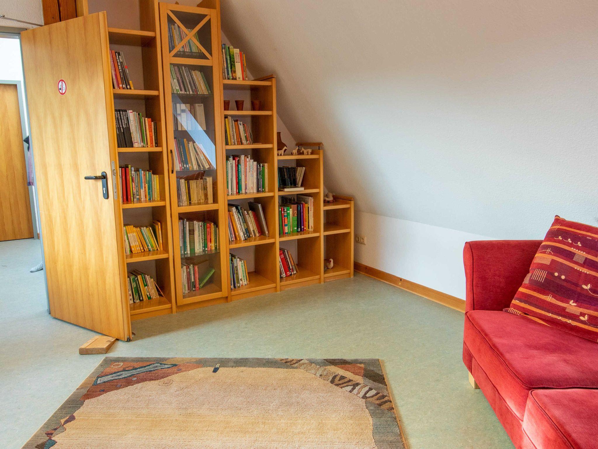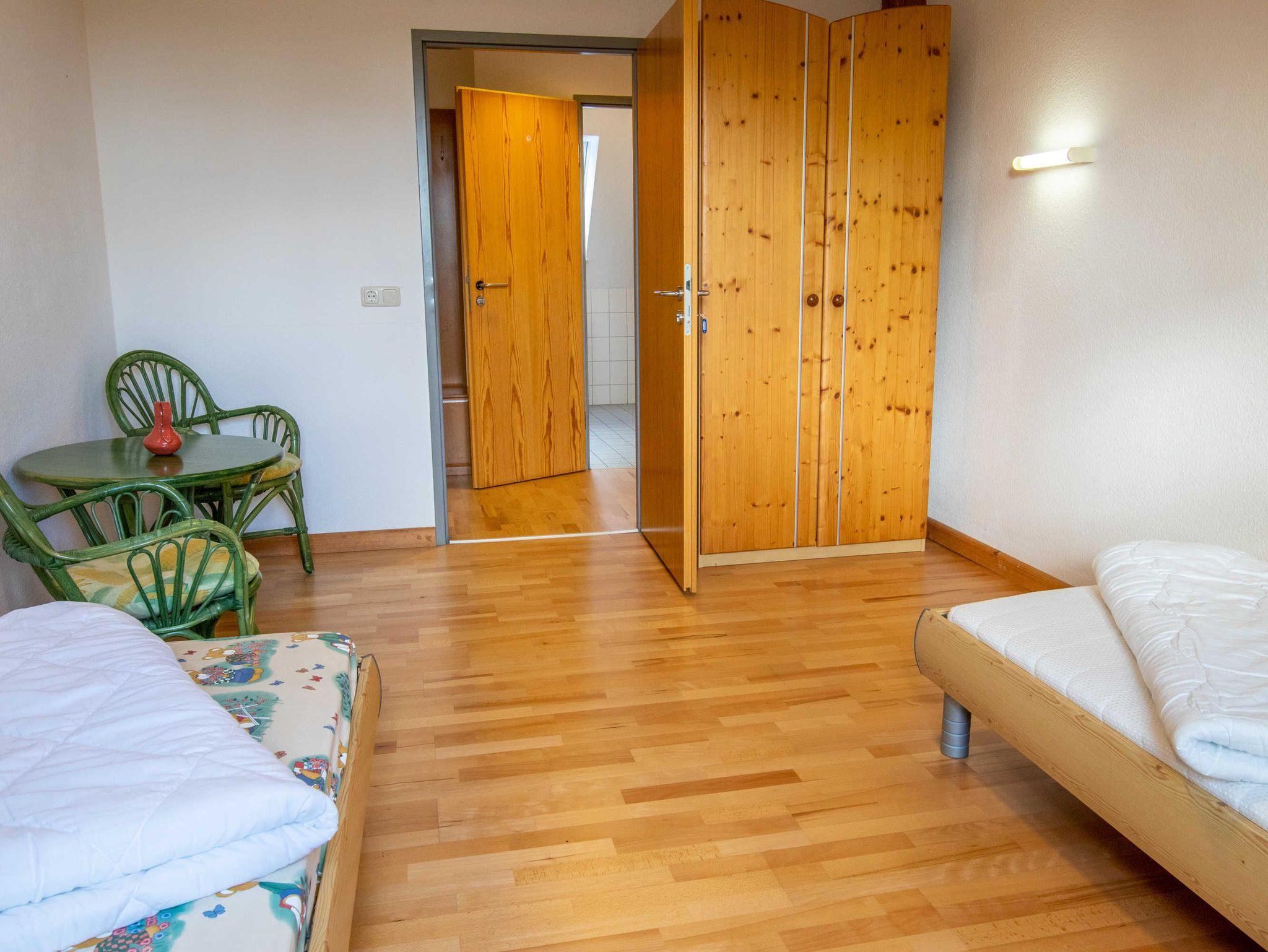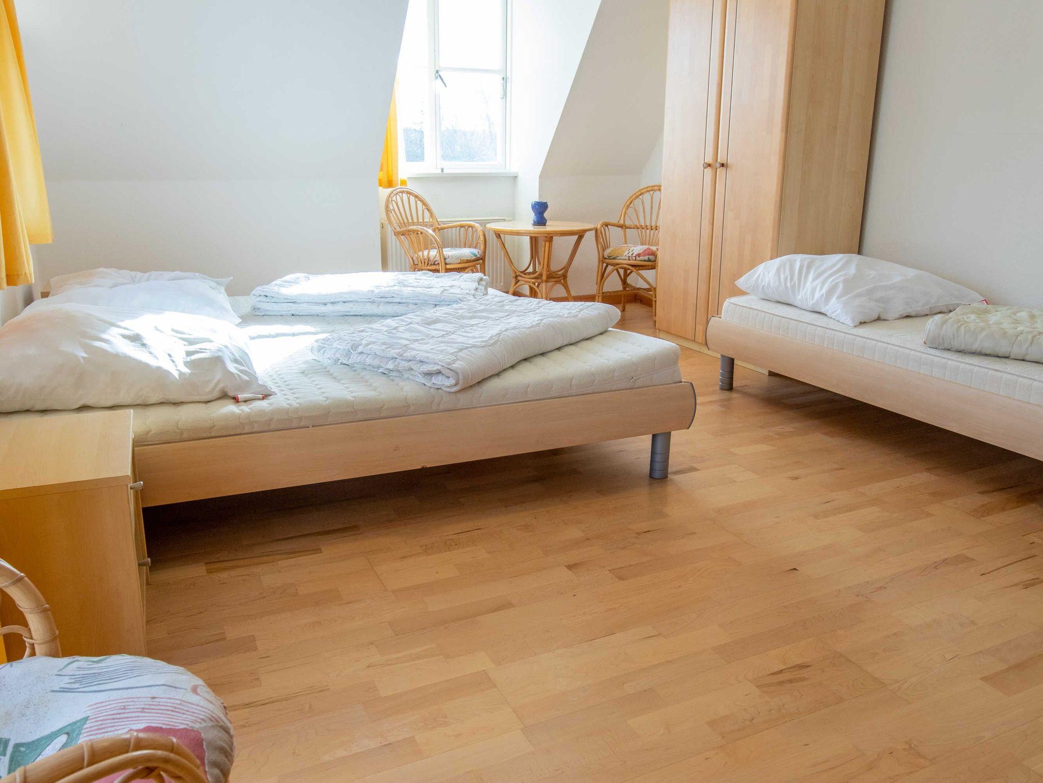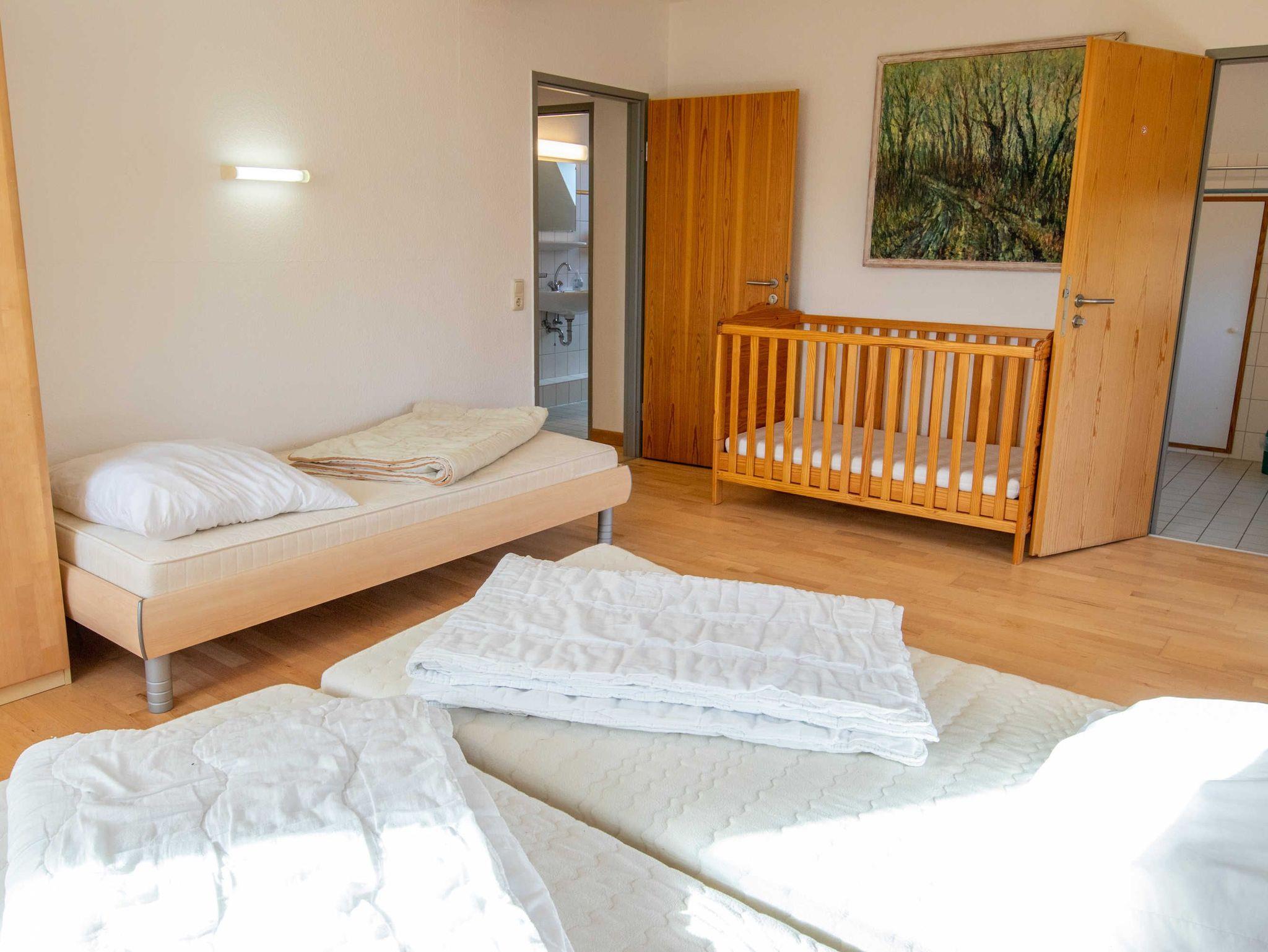 Im 3-stöckigen 170 m² großen mit Lehm ausgefachteten Fachwerkhaus ist Platz für bis zu 14 Personen. Die vordere Eingangstür ist über eine Rampe erreichbar. Im Erdgeschoss des Ferienhauses befindet sich der große Aufenthaltsraum mit vielen Sitzmöglichkeiten und einem TV. Die offene Küche ist mit einem Herd, Backofen, Kühlschrank und einer Spülmaschine ausgestattet. Geschirr, Besteck, eine Kaffeemaschine und ein Wasserkocher sind ebenfalls vorhanden. 2 Gäste-WC vervollständigen diesen Bereich. Außerdem befindet sich im Erdgeschoss ein behindertengerechtes Schlafzimmer (zwei getrennte Betten, 90x200cm) mit rollstuhlgerechtem Badezimmer, welches mit einer befahrbaren Dusche, Duschsitz, Waschbecken und WC eingerichtet ist. Über eine Treppe erreicht man die erste Etage. Dort befinden sich die vier weiteren Schlafzimmer (1x Zweibettzimmer, 2x Dreibettzimmer, 1x Vierbettzimmer, jeweils 90x200). Alle Schlafzimmer verfügen über einen Kleiderschrank, Tisch und Stühle. Zu jedem Schlafzimmer gehört ein Bad mit Dusche, Waschbecken und WC, zwei davon sind über den Flur erreichbar. Ein Zustellbett steht zusätzlich zur Verfügung. Im Dachgeschoss gibt es einen weiteren Aufenthaltsbereich mit Sitzmöglichkeiten, Büchern und Flachbild-TV. Am hinteren Ausgang schließt sich eine Terrasse mit Holzbänken, Grillmöglichkeit, Feuerstelle und eine große Wiese an.