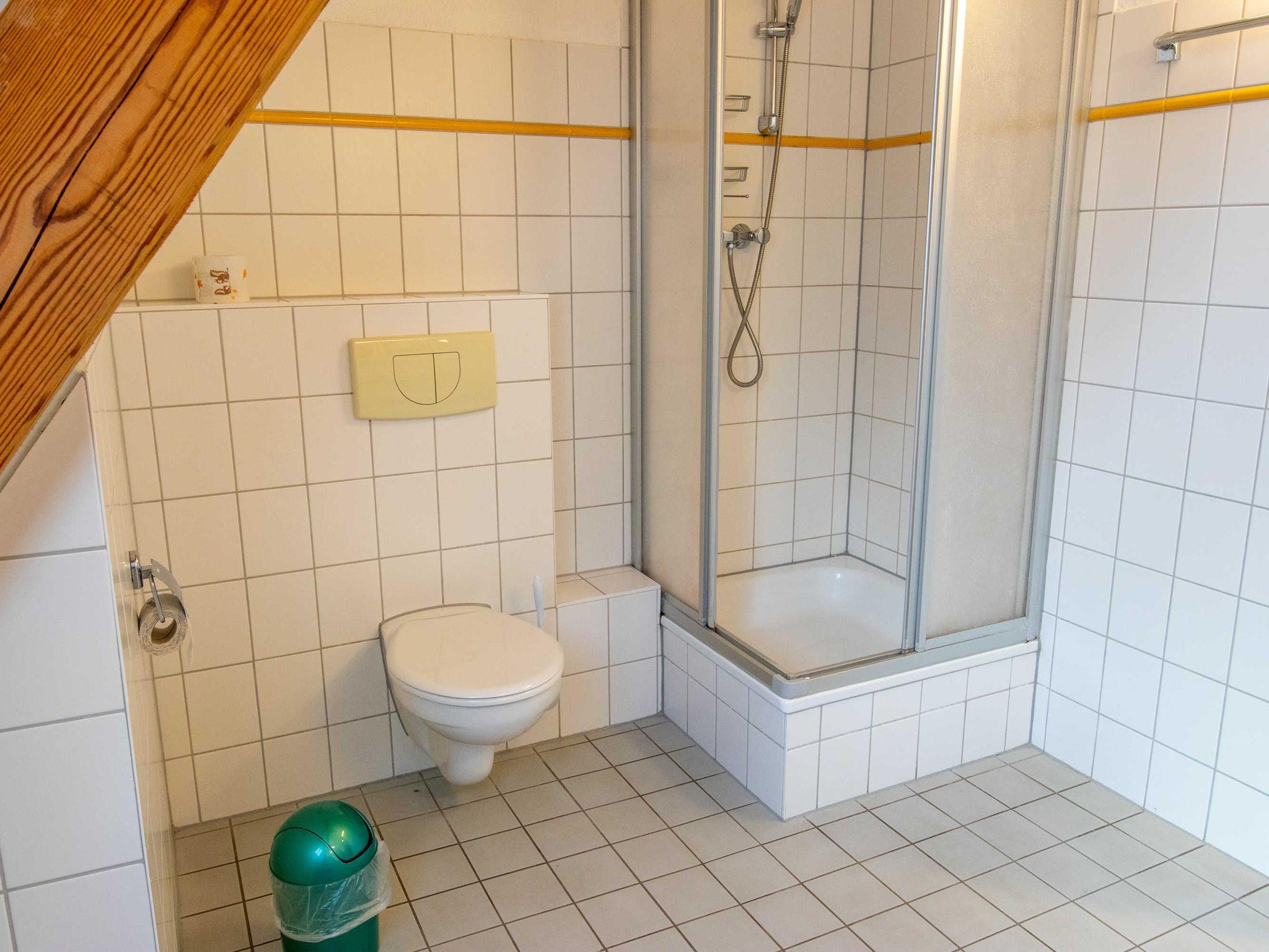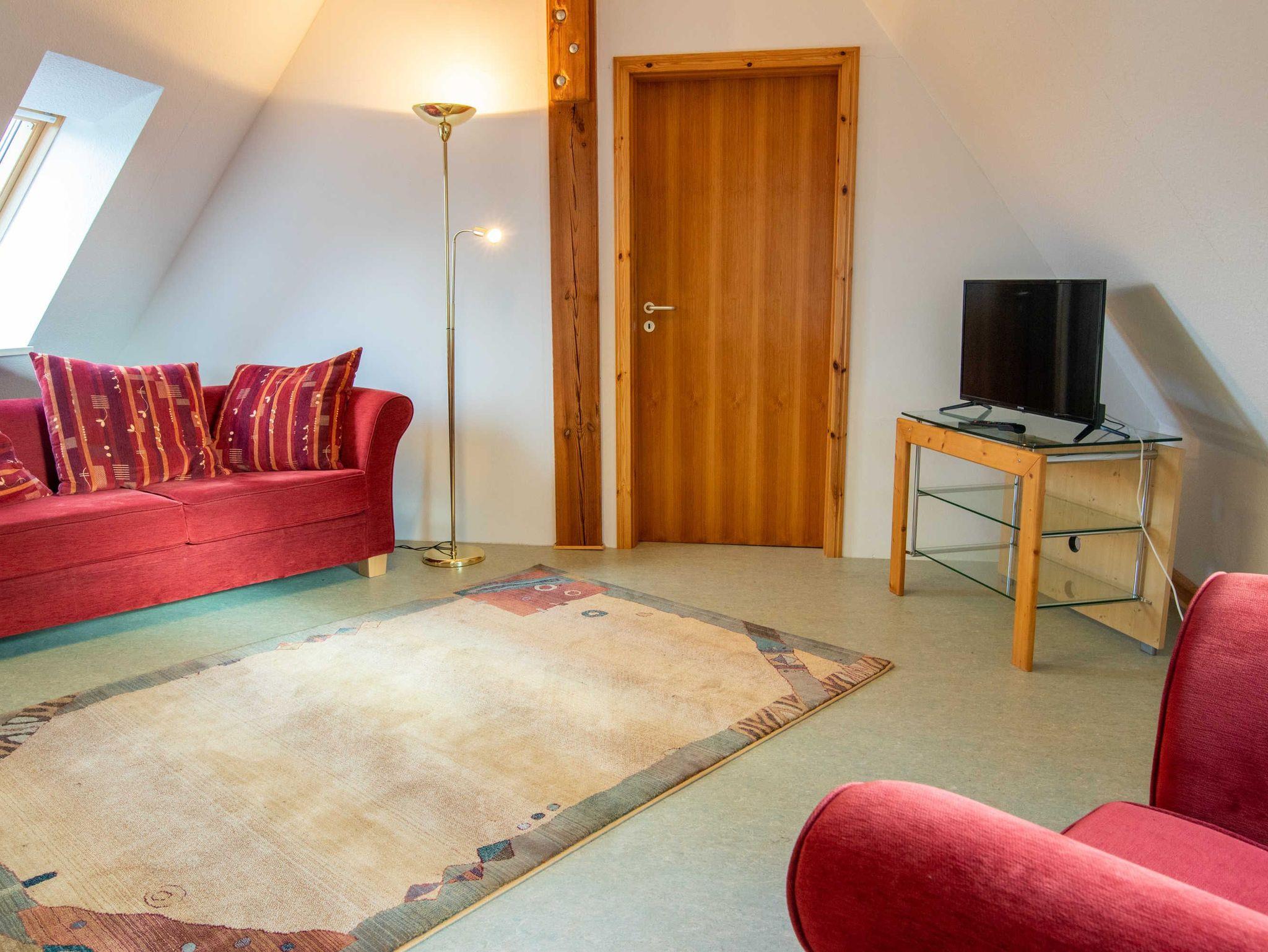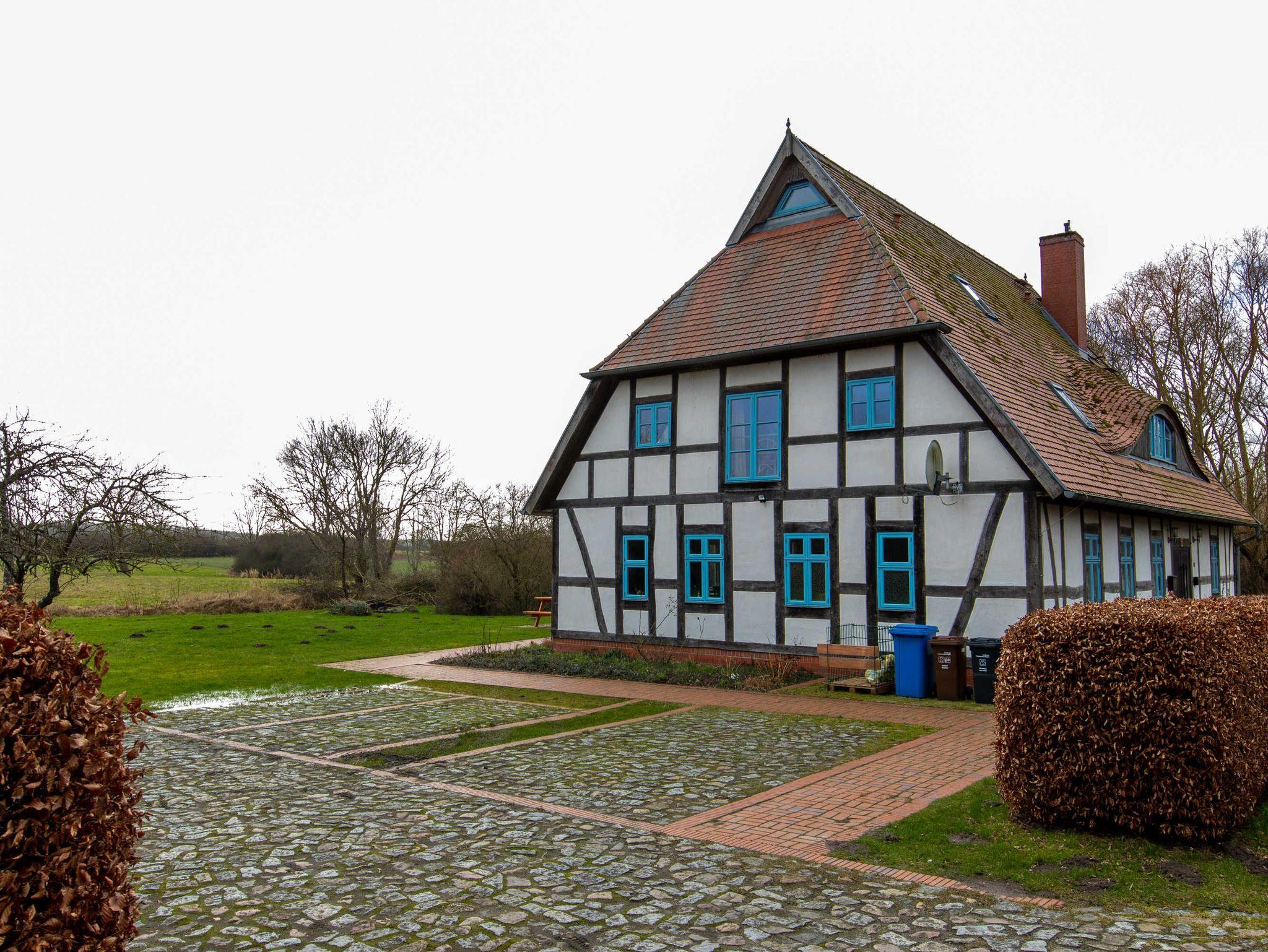Im 3-stöckigen 170 m² großen mit Lehm ausgefachteten Fachwerkhaus ist Platz für bis zu 14 Personen. Die vordere Eingangstür ist über eine Rampe erreichbar. Im Erdgeschoss des Ferienhauses befindet sich der große Aufenthaltsraum mit vielen Sitzmöglichkeiten und einem TV. Die voll ausgestattete offene Küche mit einem Herd, Backofen, Kühlschrank und einer Spülmaschine. 2 Gäste-WC vervollständigen diesen Bereich. Außerdem befindet sich im Erdgeschoss ein behindertengerechtes Schlafzimmer (zwei getrennte Betten, 90x200cm) mit rollstuhlgerechtem Badezimmer, welches mit einer befahrbaren Dusche, Duschsitz, Waschbecken und WC eingerichtet ist. Über eine Treppe erreicht man die erste Etage. Dort befinden sich die vier weiteren Schlafzimmer (1x Zweibettzimmer, 2x Dreibettzimmer, 1x Vierbettzimmer, jeweils 90x200). Zu jedem Schlafzimmer gehört ein Bad mit Dusche, Waschbecken und WC, zwei davon sind über den Flur erreichbar. Ein Zustellbett steht zusätzlich zur Verfügung. Im Dachgeschoss gibt es einen weiteren Aufenthaltsbereich mit Sitzmöglichkeiten, Büchern und Flachbild-TV. Am hinteren Ausgang schließt sich eine Terrasse mit Holzbänken, Grillmöglichkeit, Feuerstelle und eine große Wiese an.