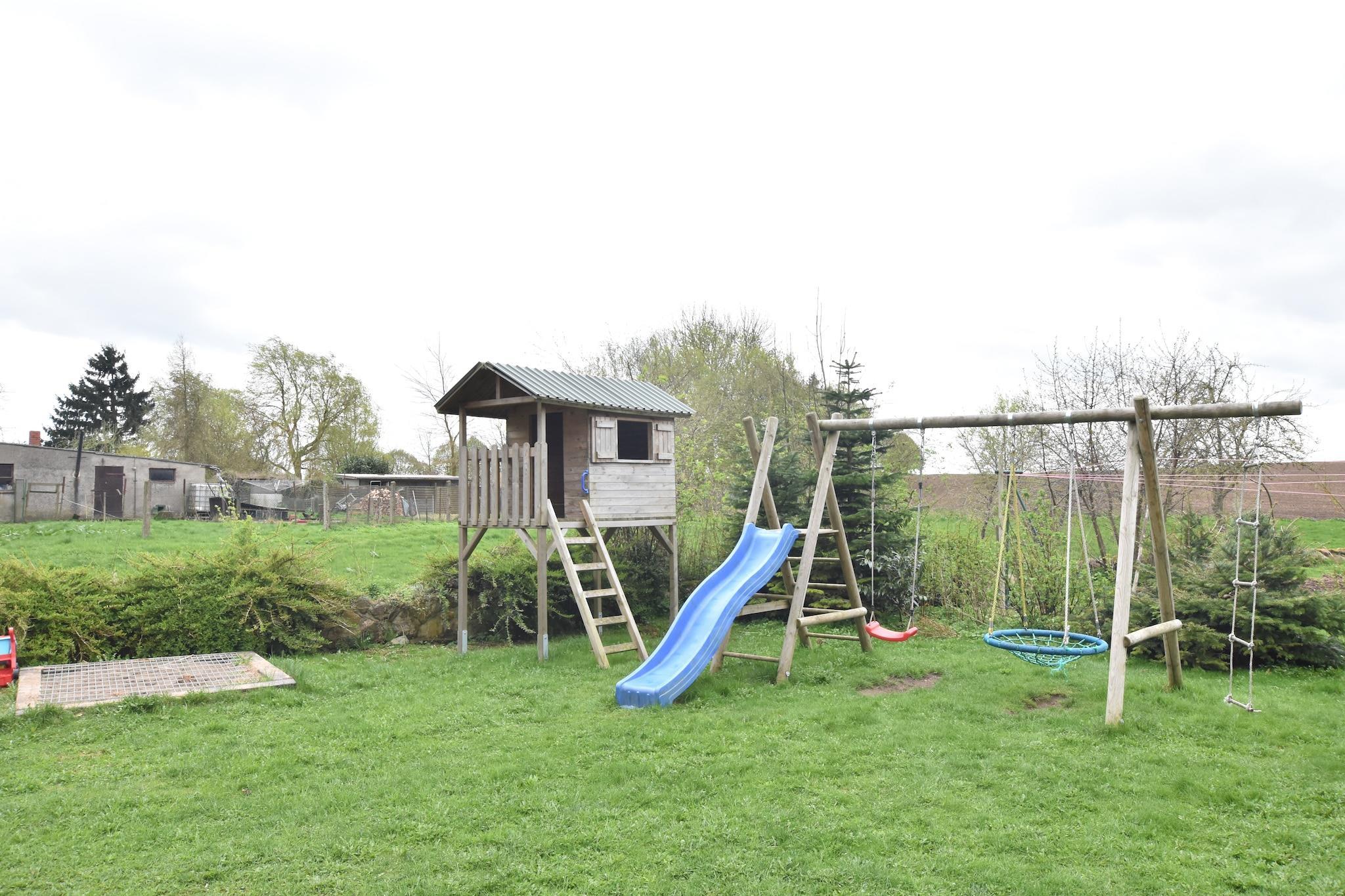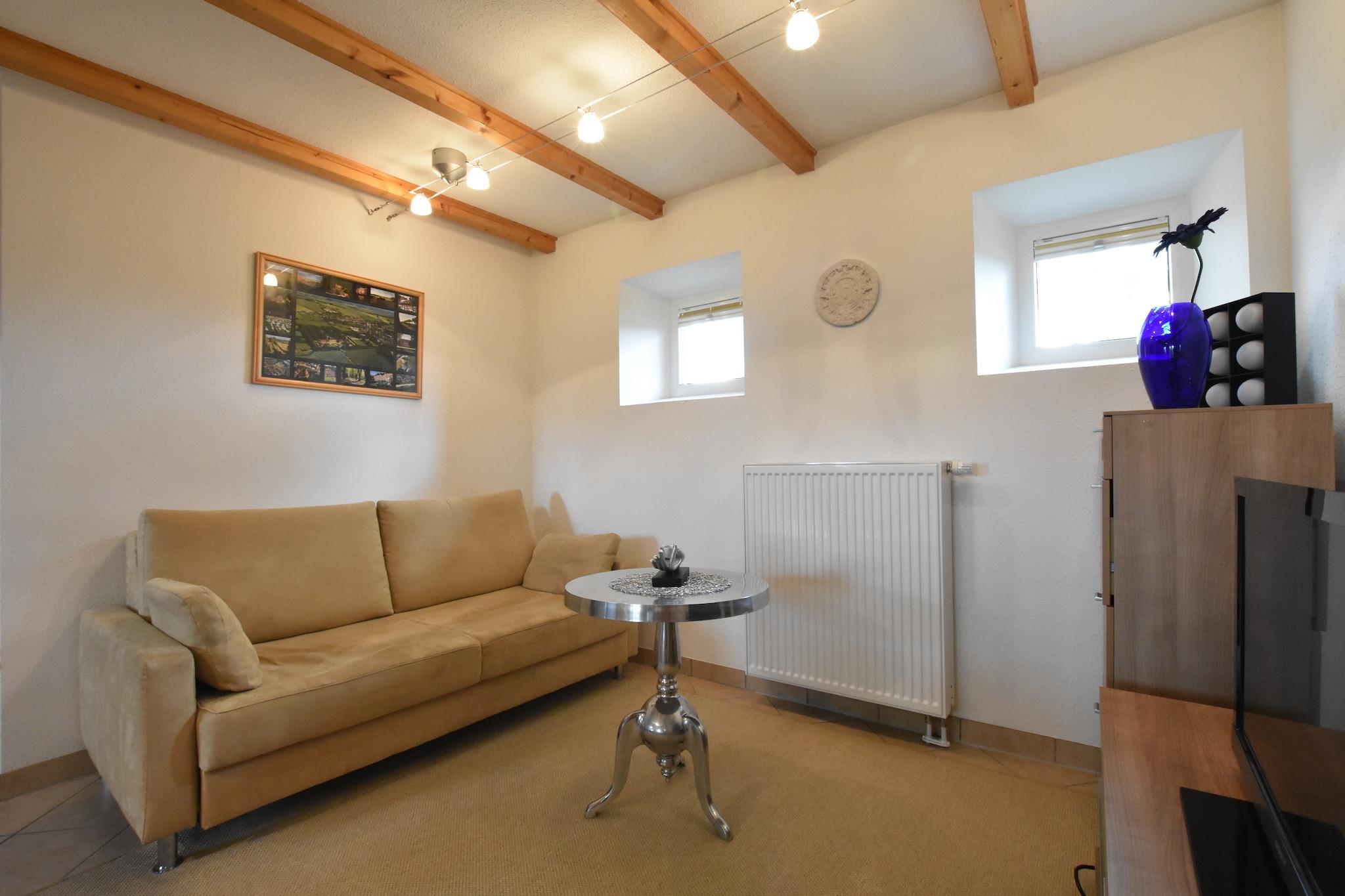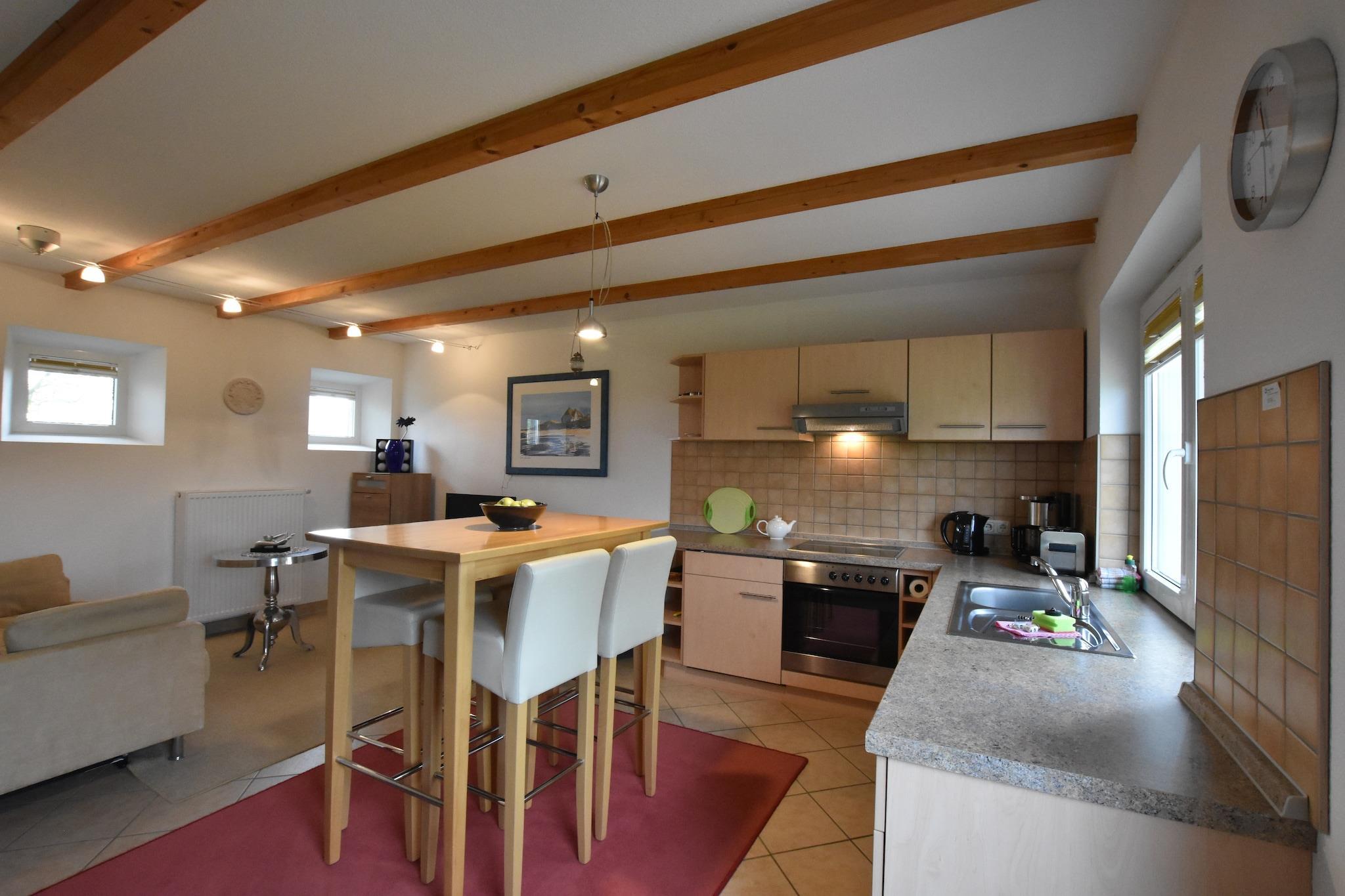 Parterre: (Wohnzimmer(Schlafcouch 1 Pers., TV, Sitzecke), offene Küche(Esstisch, Wasserkocher, Toaster, Kochherd(4 Kochplatten), Kaffeemaschine, Backofen, Kühlschrank), Badezimmer(Dusche, Waschbecken, Toilette), Hochstuhl) In der 1. Etage: (Schlafzimmer(Doppelbett king size)) Terrasse, Garten, Fahrradabstellraum(Gemeinschaftliche Nutzung mit anderen Gästen), Gartenmöbel, Grill, Parkplatz, Sandkasten, Spielgeräte