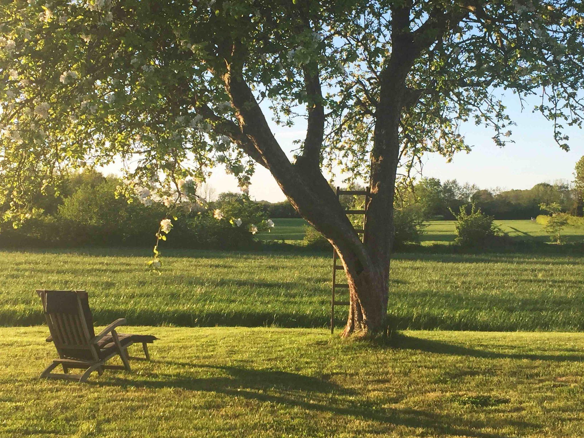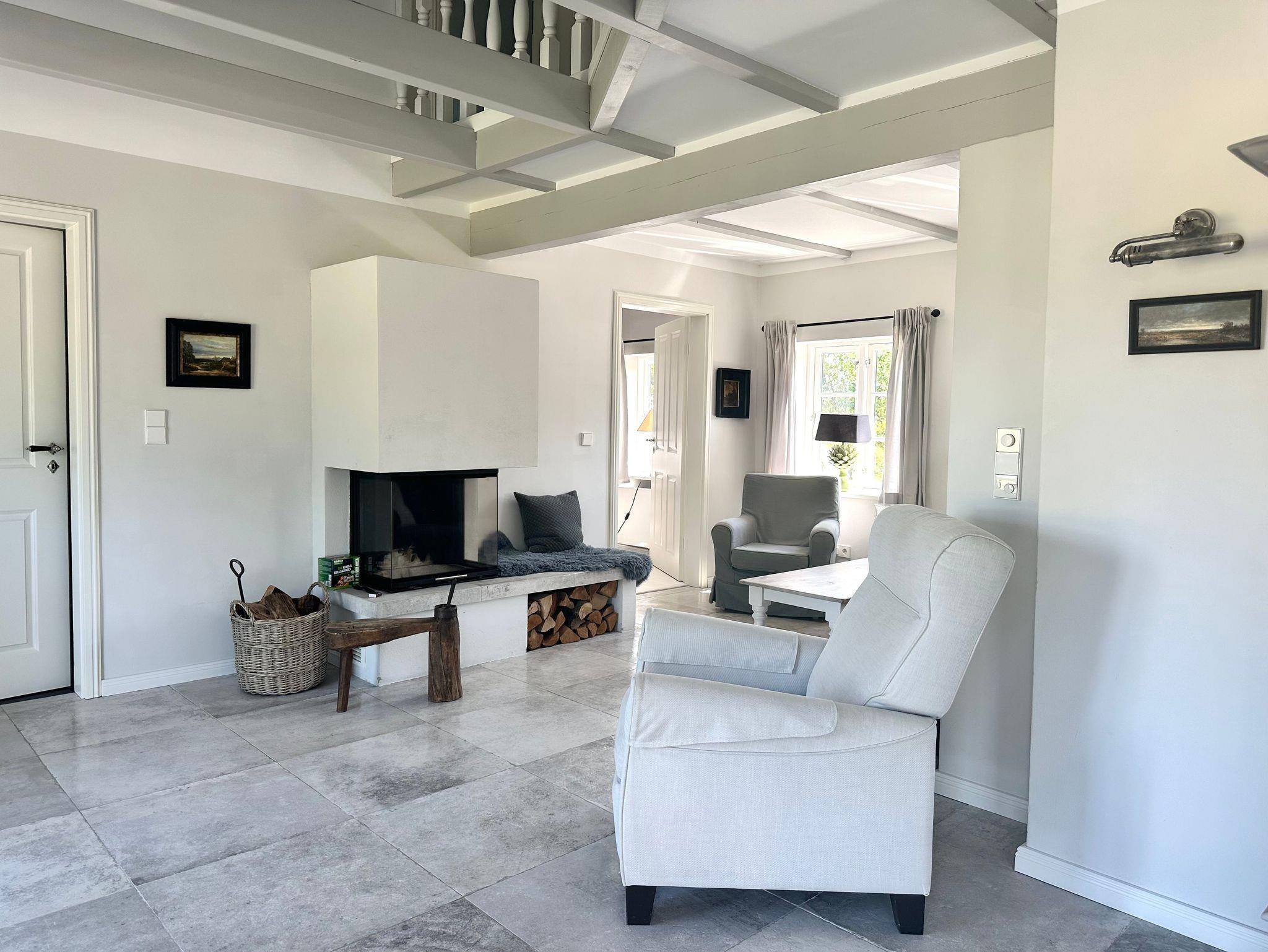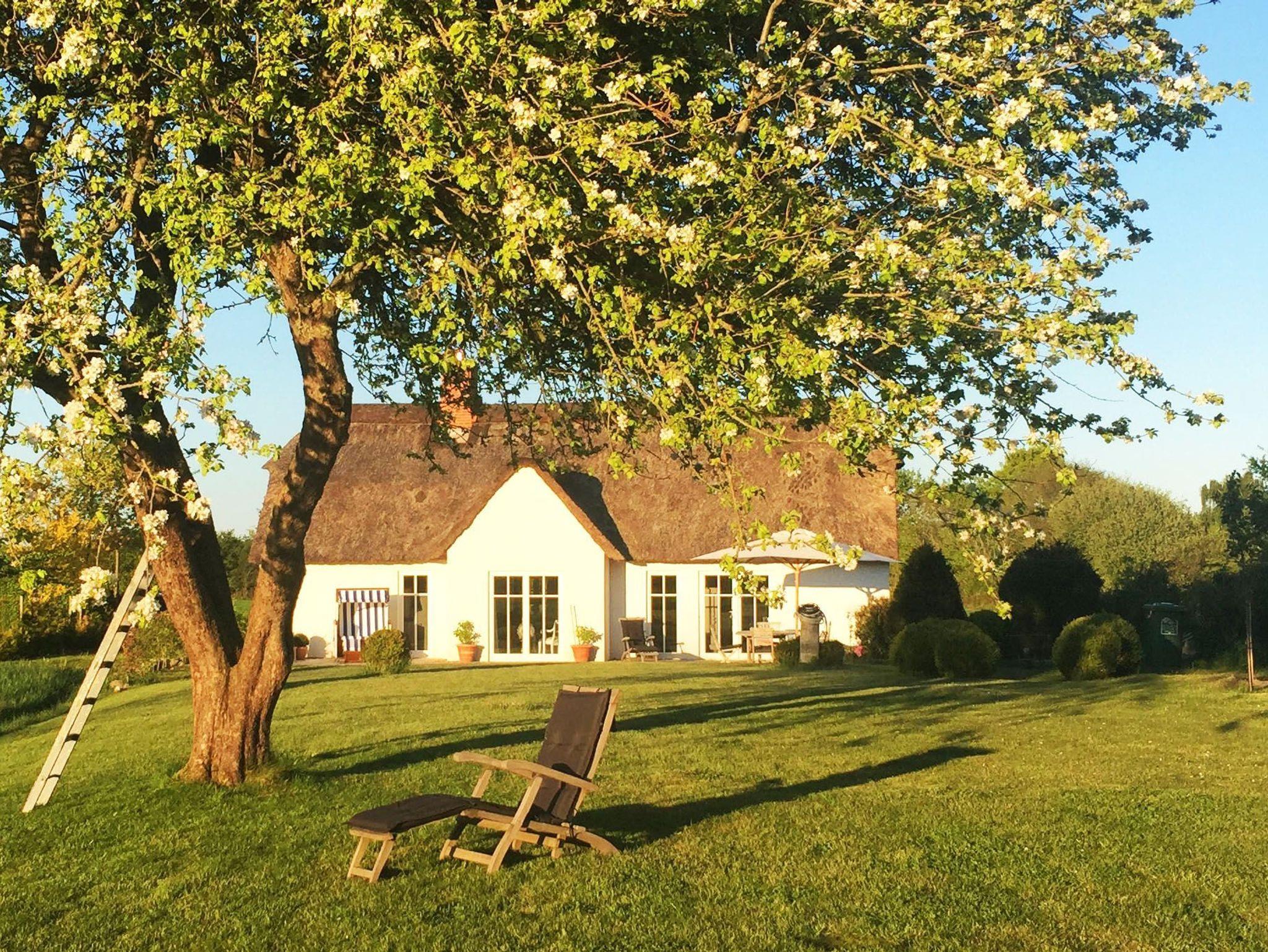 Das Haus hat ein Schlafzimmer mit Doppelbett (180cm x 200cm) im Erdgeschoss und ein weiteres Schlafzimmer mit zwei Einzelbetten im 1. Obergeschoss und bietet Platz für 2 - 4 Personen. Es verfügt über eine offene Landhausküche mit allem Komfort und einem angrenzenden Essbereich. Von dort aus gelangt man in den Wohnbereich mit gemütlichem Sofa und Kamin. Die offene Galerie zum Obergeschoss gibt dem Haus ein großzügiges Wohngefühl. Das luxuriöse Badezimmer liegt ebenerdig mit Blick in den Garten und verfügt über WC, Waschtisch, eine ebenerdig begehbaren Dusche, Handtuchwärmer, Föhn und Waschmaschine. Das Haus ist durch seine vielen, zum Teil bodentiefen Fenster sehr hell und wird von Sonnenaufgang bis Sonnenuntergang von der Sonne durchflutet. Über die großzügige Terrasse gelangt man in den Garten, in dessen Zentrum der große Apfelbaum Schatten spendet.