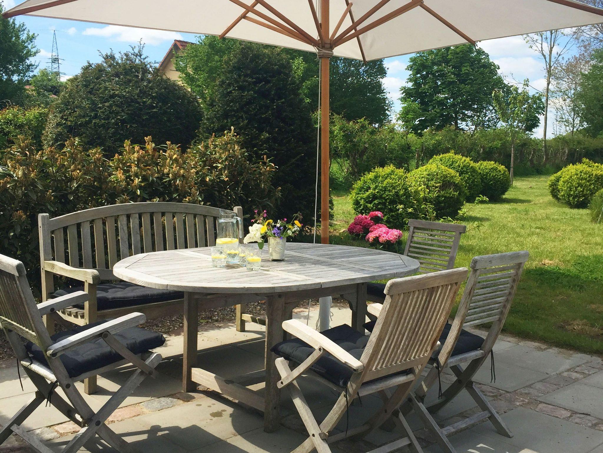 Die Terrasse (70qm) ist ausgestattet mit Gartenmöbel, einen Sonnenschirm und einem Strandkorb. Der Garten (1000qm) kann für Spiel, Sport und Sonnenbaden genutzt werden.