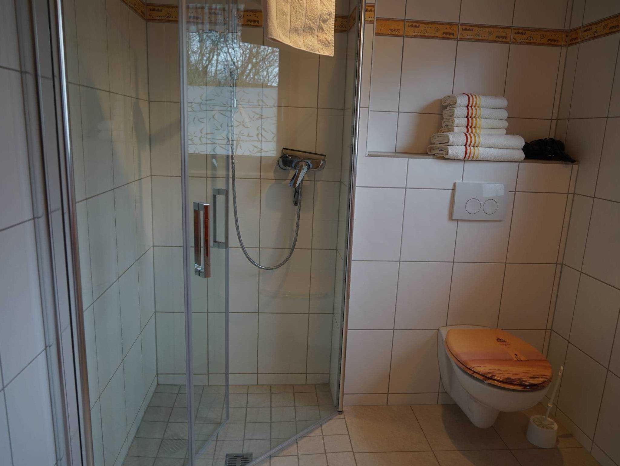 - Duschbad, WC, kleinem Schränkchen, Waschbecken mit Spiegel und Ablagemöglichkeiten: Wäschepaket zubuchbar
