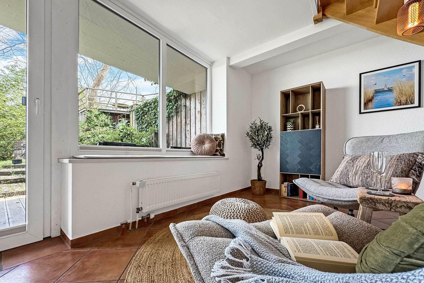 Zum Haus gehört außerdem ein kleiner Garten, in dem sich immer ein sonniges Plätzchen finden lässt. Von hier aus erreichst du direkt einen kleinen Wanderweg, der zum Schleiufer führt – vorbei an einem kleinen Sportboothafen bis zur Badestelle mit Spielplatz, Fußballtoren und Basketballkorb.