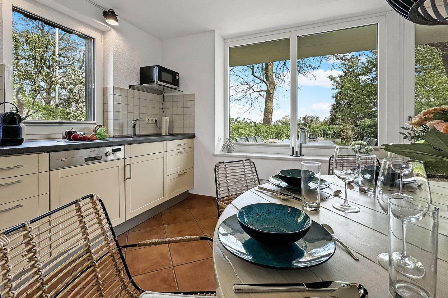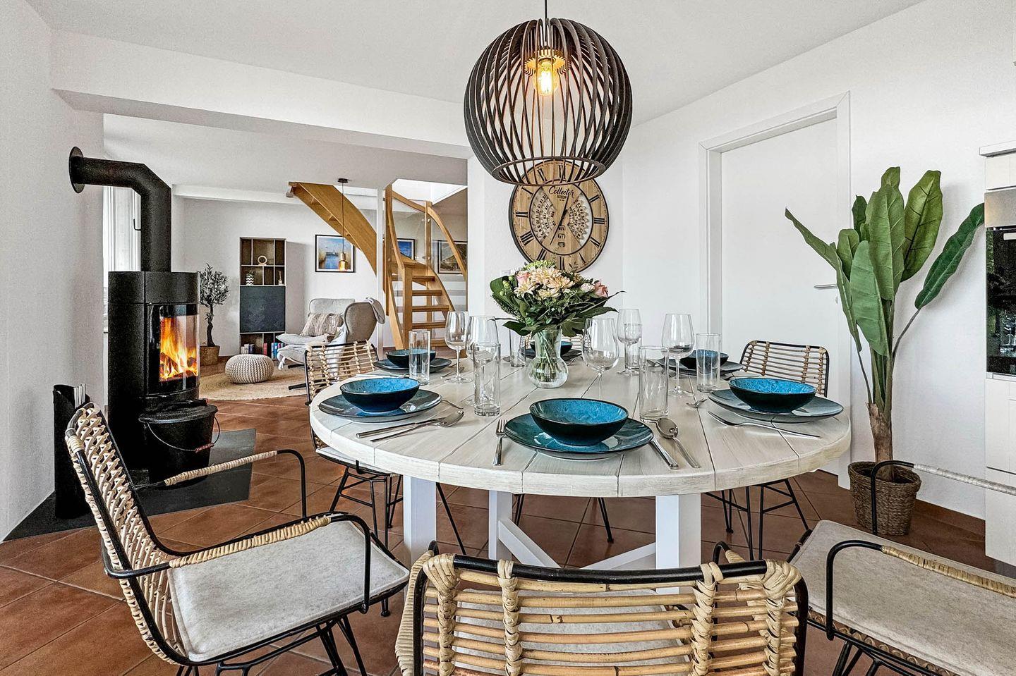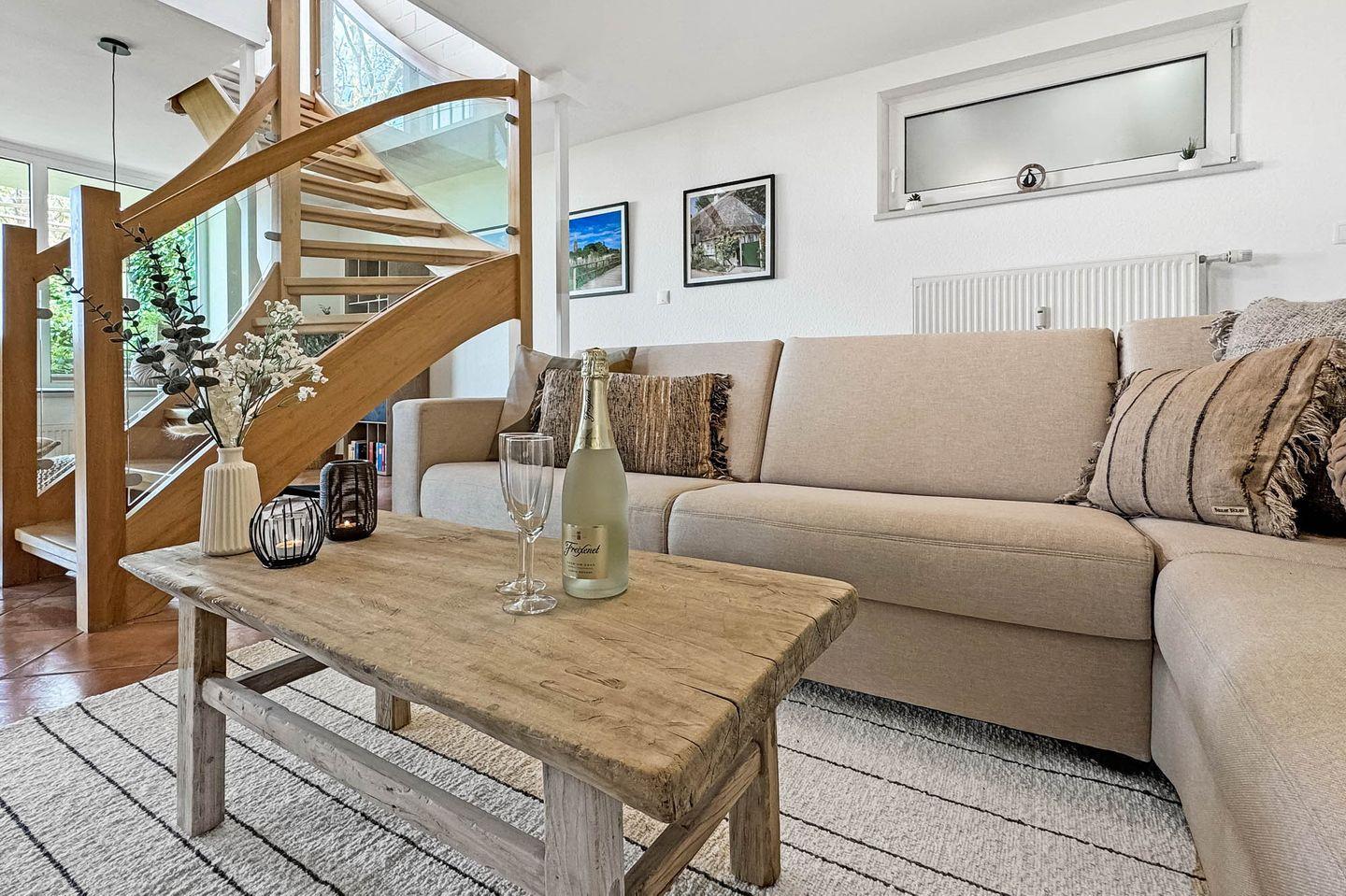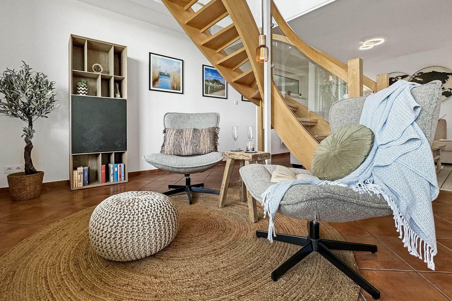 Das eigentliche Herzstück des Hauses liegt in der untersten Etage. Im großzügigen Wohnbereich kannst du es dir auf dem Ecksofa oder in einem der Lesesessel gemütlich machen. Die offene Küche schließt direkt an und bietet am großen Esstisch Platz für bis zu sechs Personen – ideal für lange Frühstücke oder gemeinsame Abende.