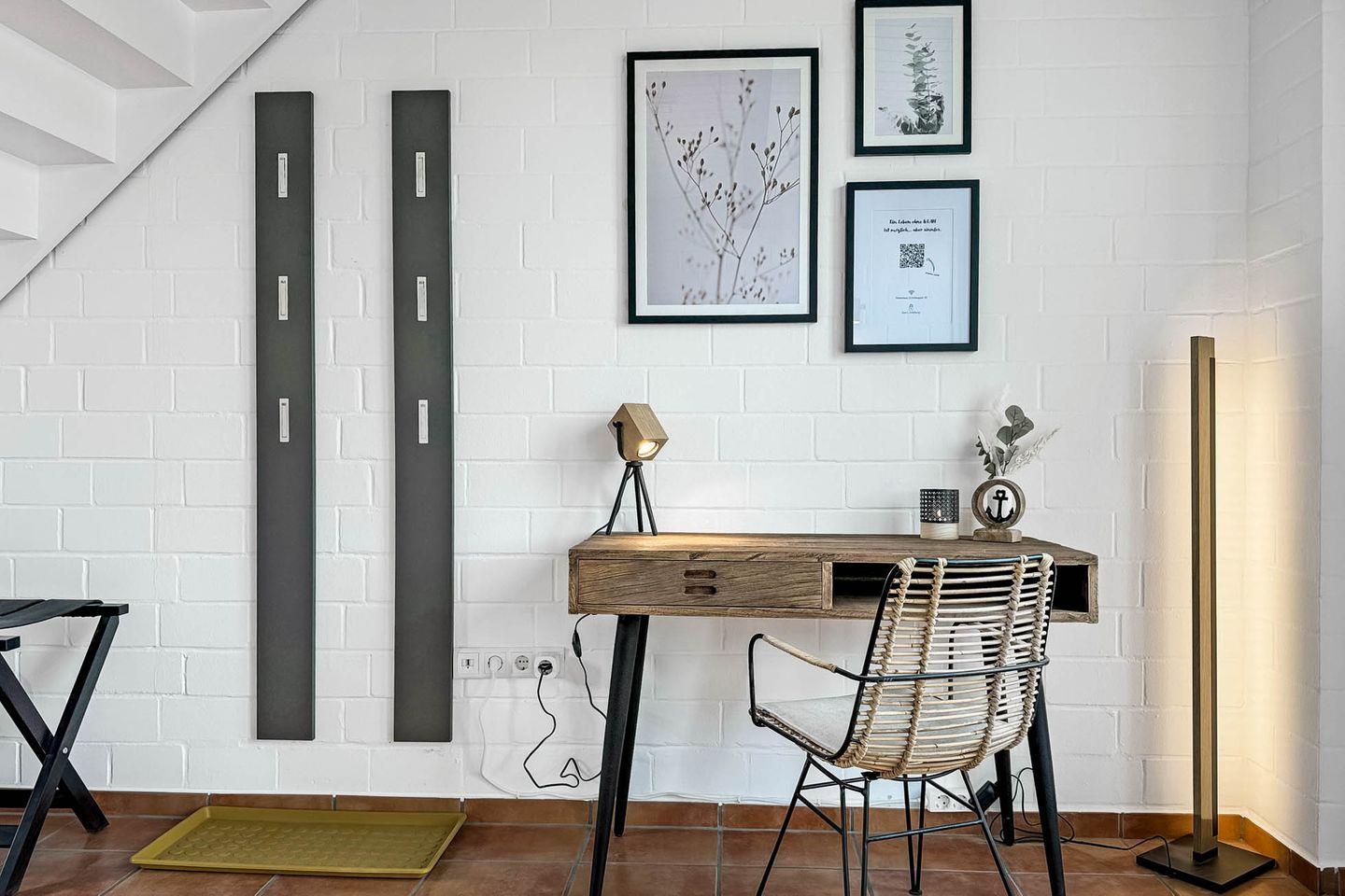 Das Haus erstreckt sich über drei Etagen. Der Eingang liegt in der mittleren Ebene – und schon beim Reinkommen fällt der Blick direkt auf die Schlei. Hier gibt es eine Garderobe, einen kleinen Schreibtisch für alle, die zwischendurch doch mal den Laptop aufklappen müssen, sowie ein Duschbad mit WC.